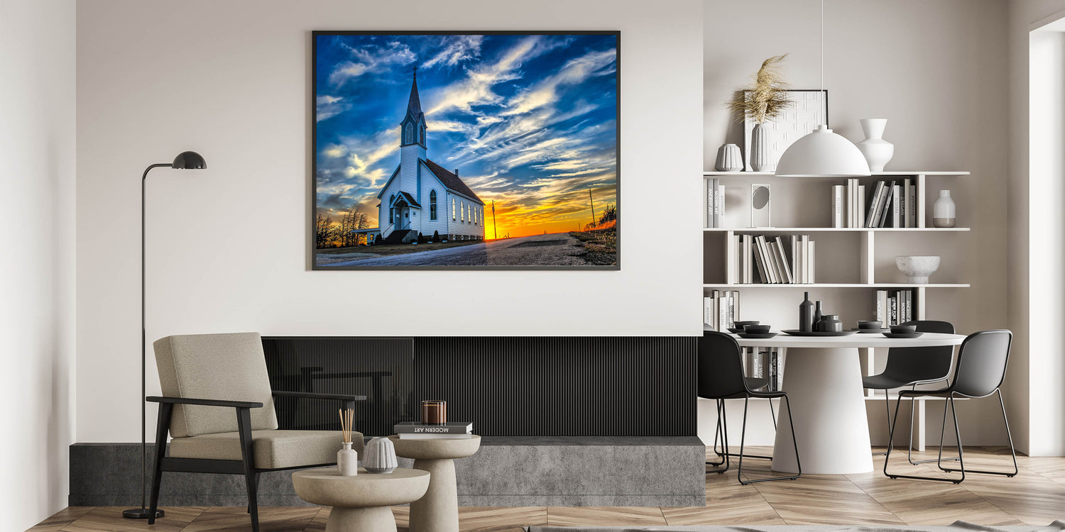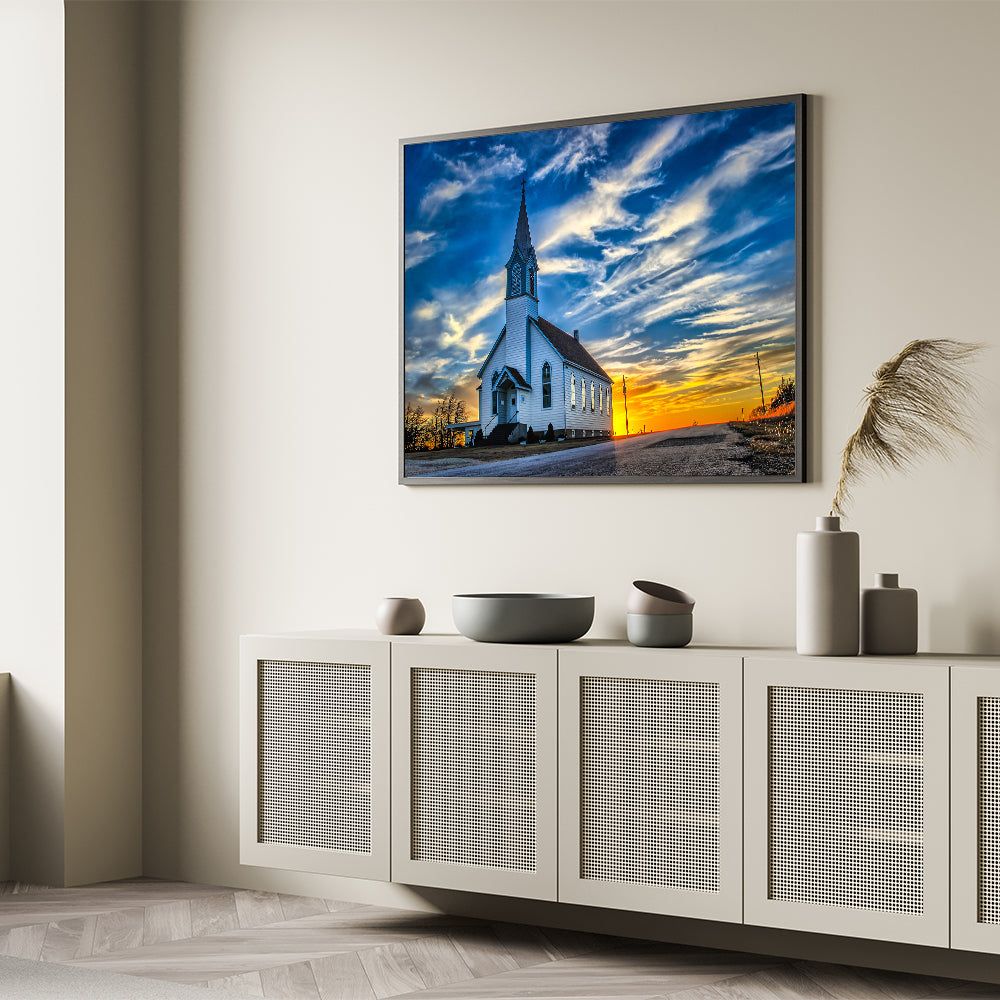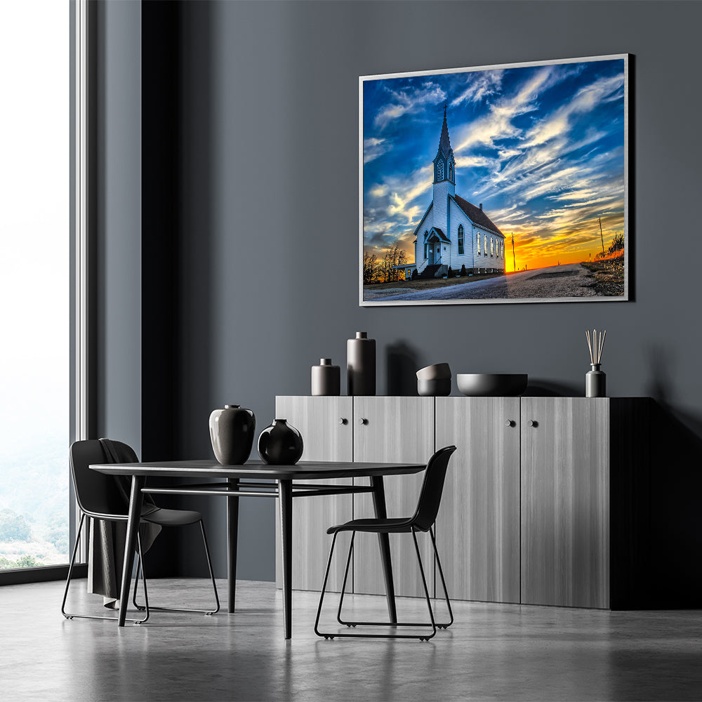 Bring warmth and inspiration into your home with this stunning wall art featuring a radiant sunset over a picturesque white church. The vibrant colors of the setting sun blend beautifully with the deep blues of the sky, creating a captivating scene that evokes peace and spiritual reflection. This artwork is perfect for anyone looking to add a touch of nature's beauty and a sense of serenity to their decor.