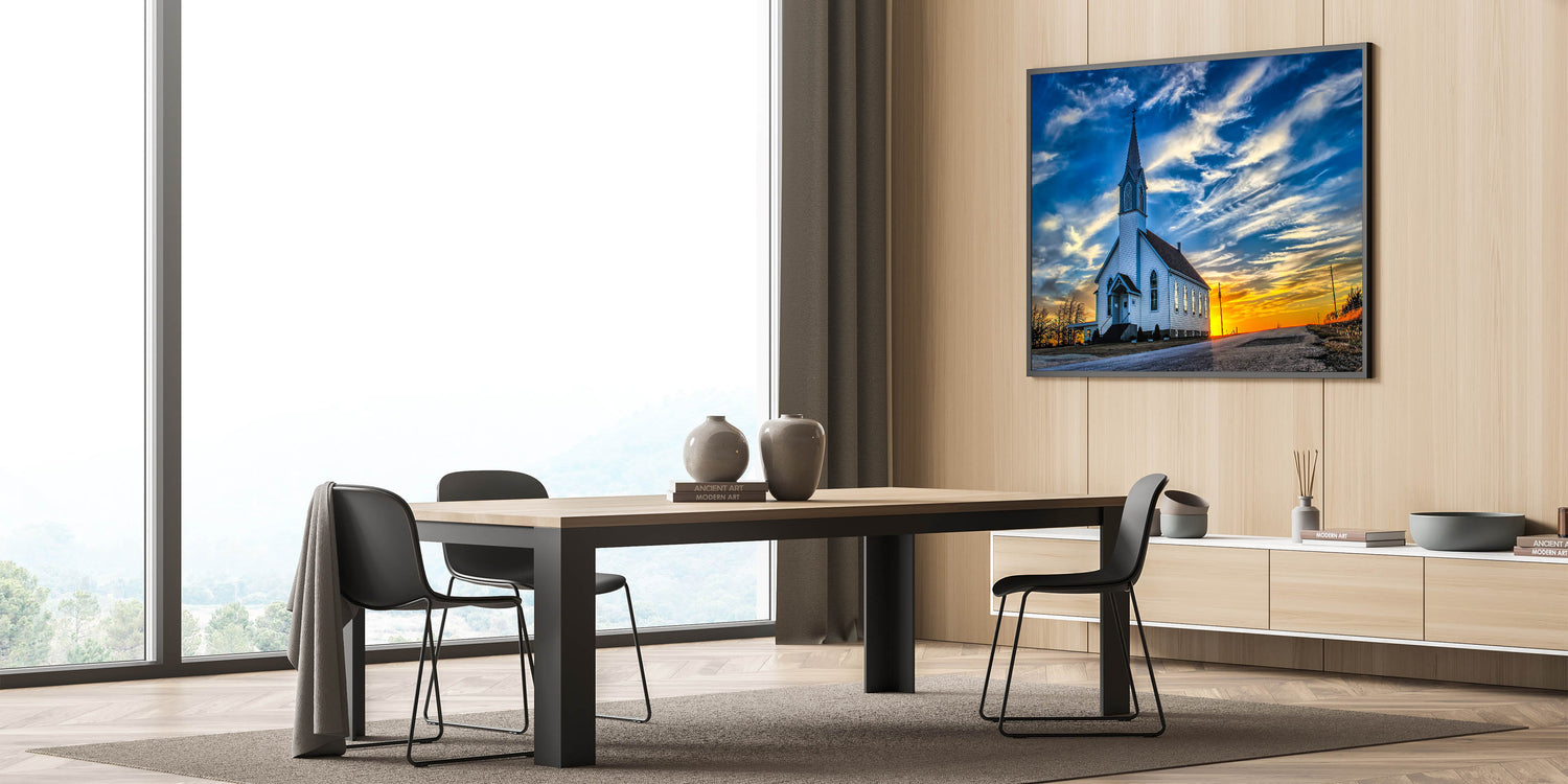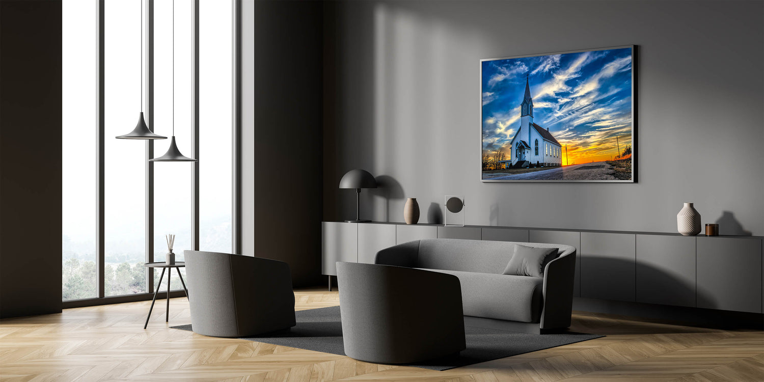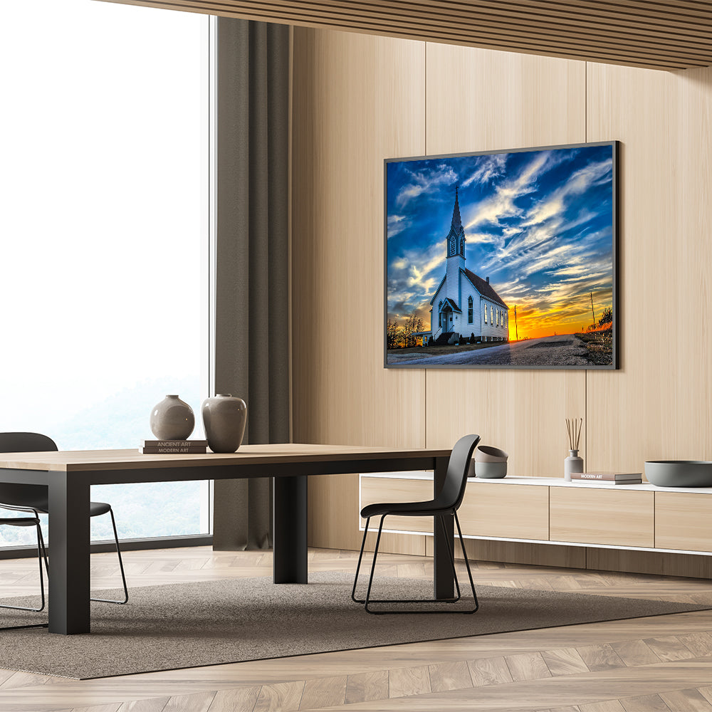 Bring warmth and inspiration into your home with this stunning wall art featuring a radiant sunset over a picturesque white church. The vibrant colors of the setting sun blend beautifully with the deep blues of the sky, creating a captivating scene that evokes peace and spiritual reflection. This artwork is perfect for anyone looking to add a touch of nature's beauty and a sense of serenity to their decor.