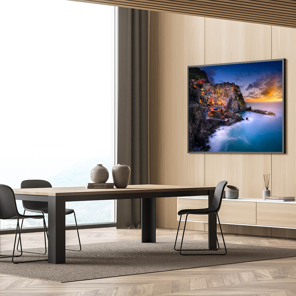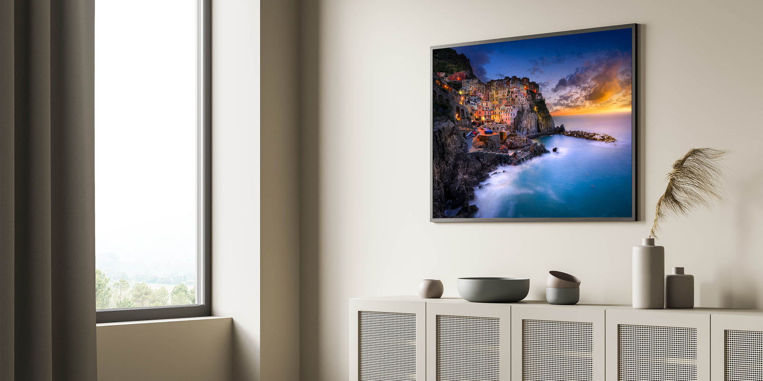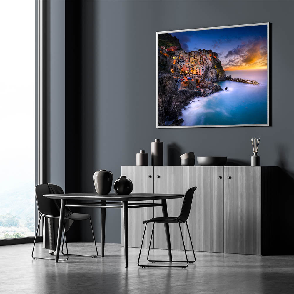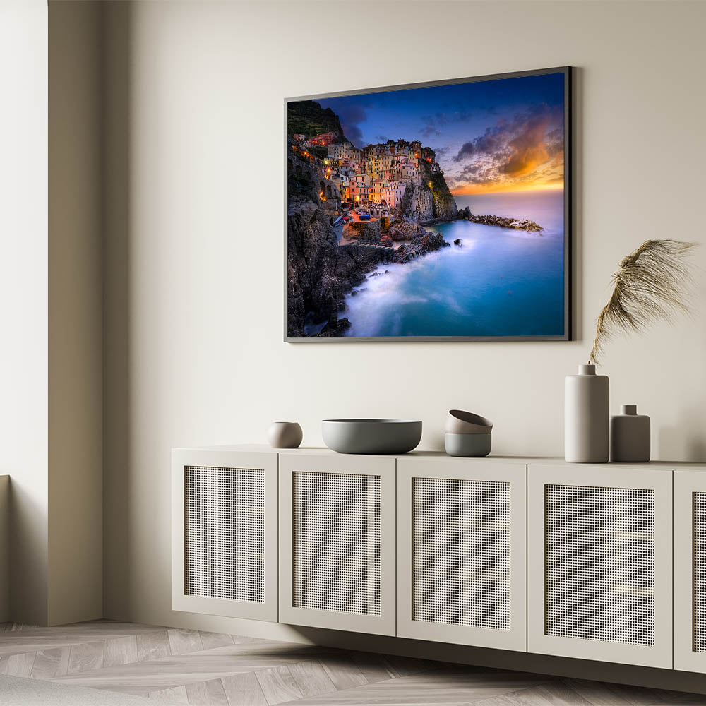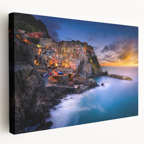 Capture the breathtaking beauty of Italy with this stunning Cinque Terre Wall Art. This vibrant artwork showcases the picturesque coastal village of Cinque Terre bathed in the warm light of a Mediterranean sunset. Perfect for those who love Italian coastal decor, this piece brings the charm of the Italian Riviera into any space.