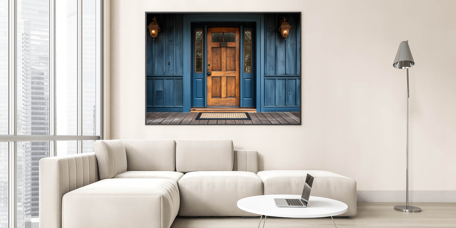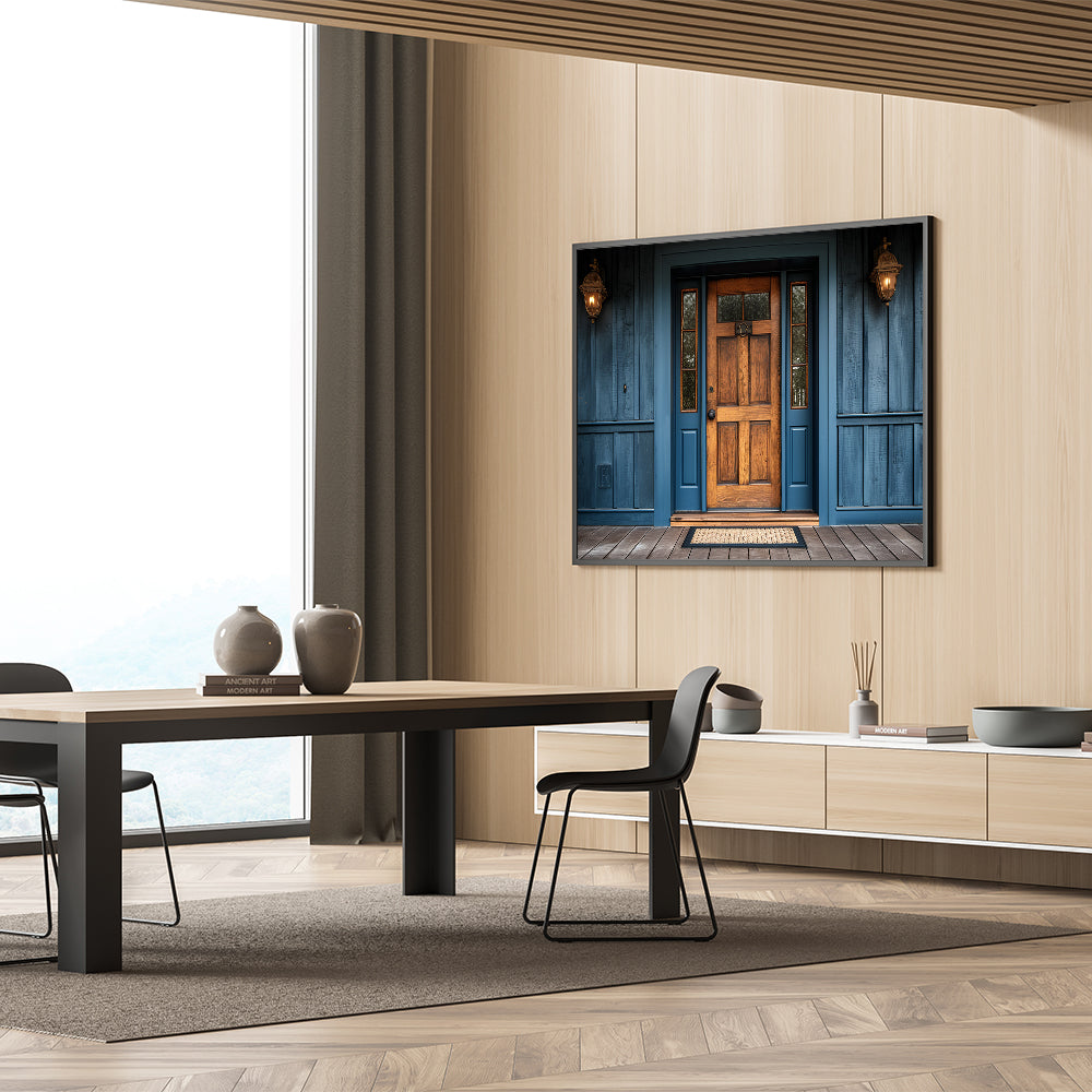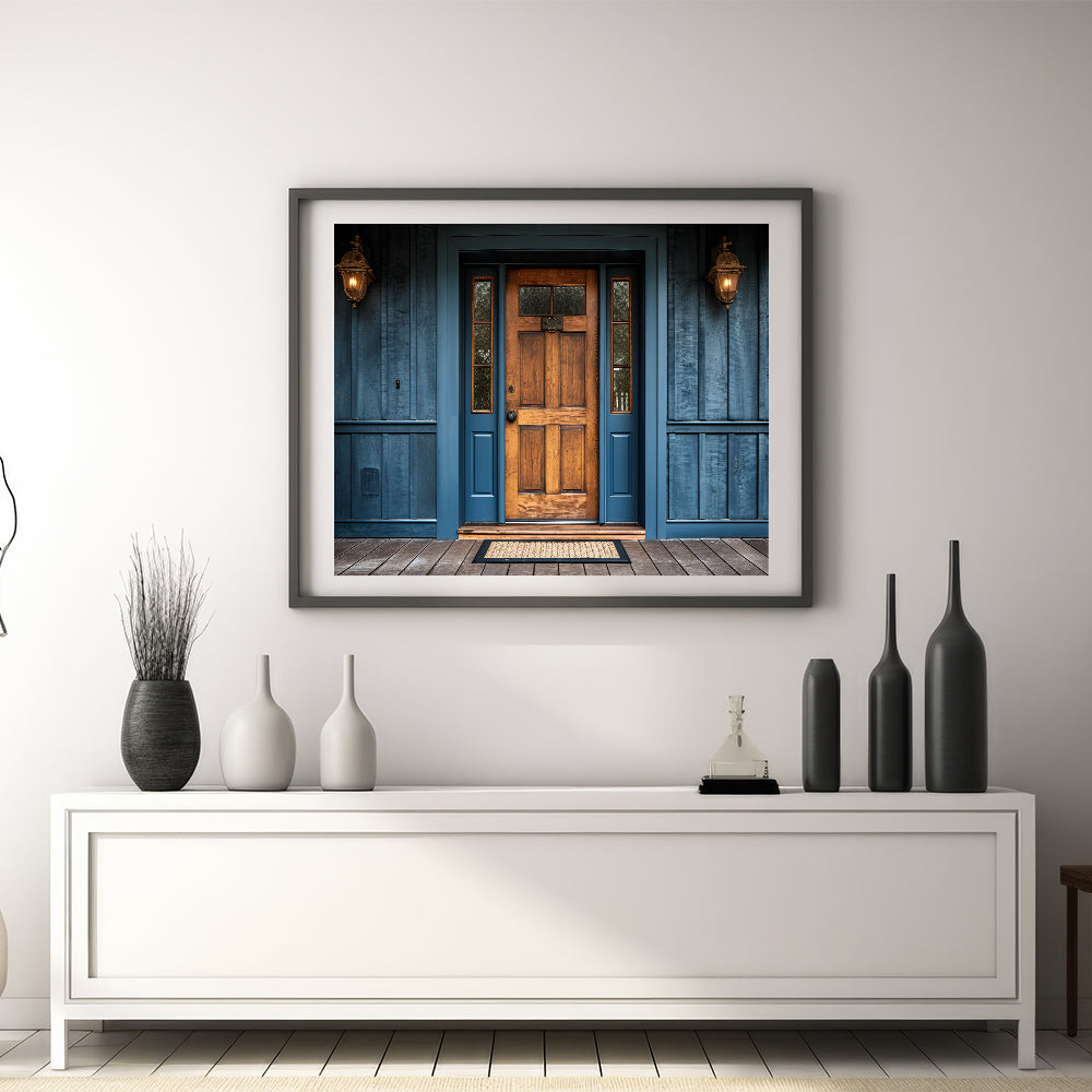 Enhance the warmth and charm of your space with this "Classic Wooden Door Wall Art." This artwork features a beautifully crafted wooden door, set against a deep blue exterior with rustic lanterns adding a touch of vintage elegance. The rich wood tones of the door contrast perfectly with the cool blue walls, creating a welcoming and timeless aesthetic. This piece is ideal for those who appreciate the blend of rustic and classic architectural styles, making it a perfect addition to any home or office decor.