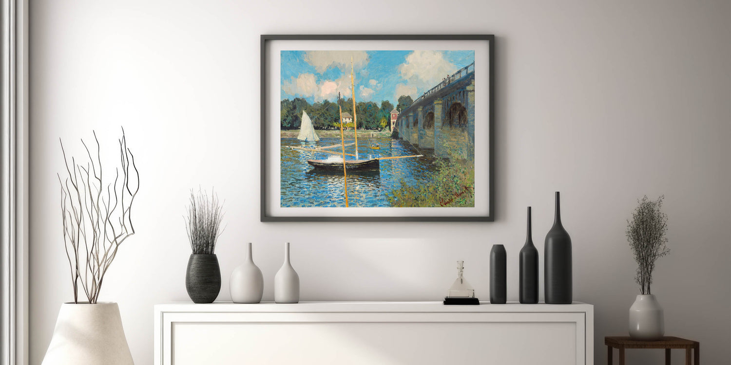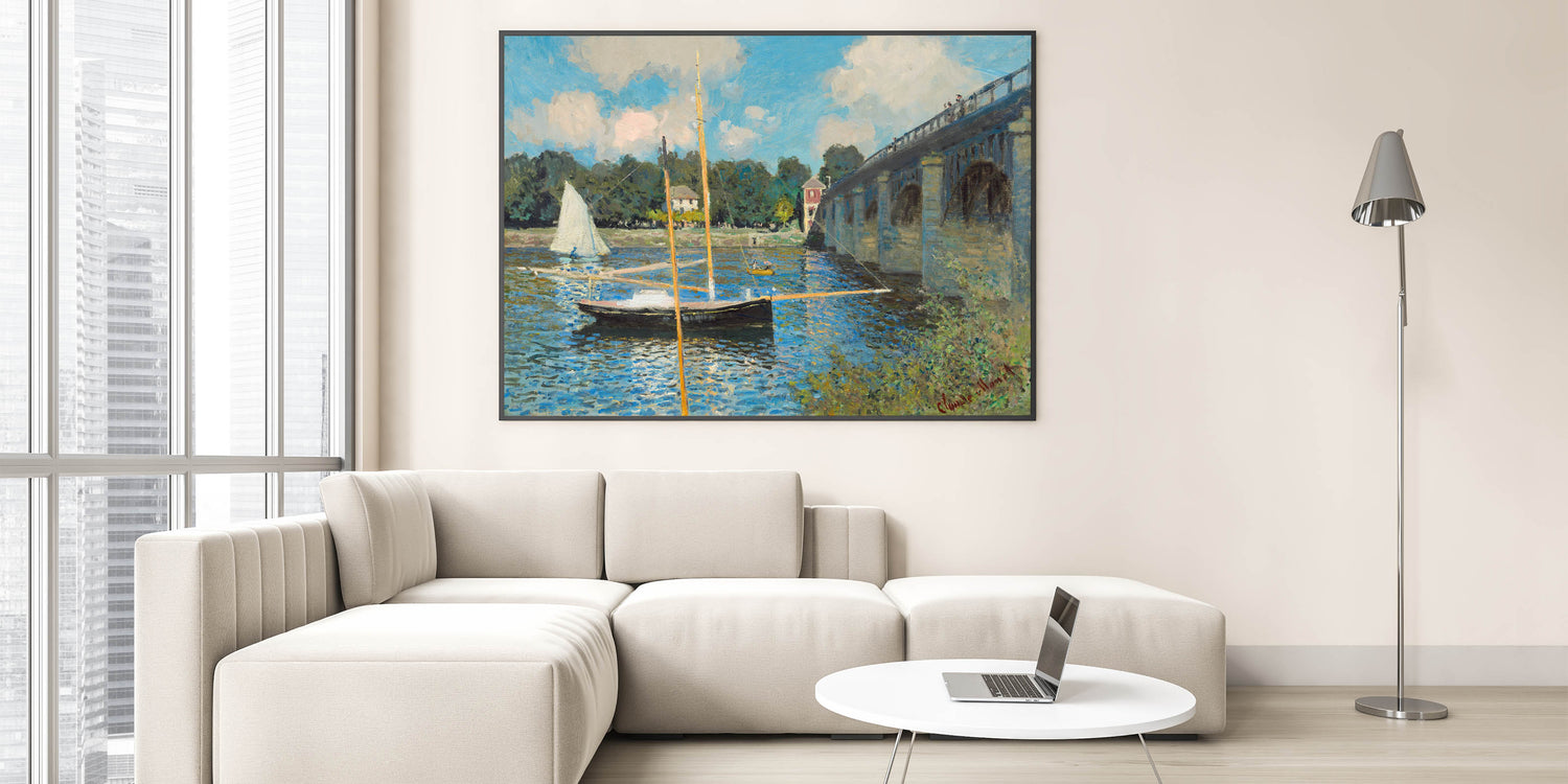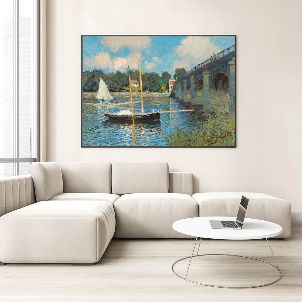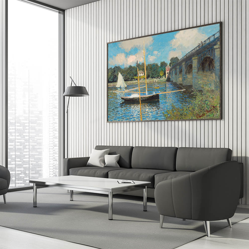 Capture the tranquility of Claude Monet's iconic "The Bridge at Argenteuil, 1874." This stunning Impressionist masterpiece showcases a serene scene of sailboats gently floating on the water beneath the bridge, with reflections of the clear blue sky shimmering on the surface. The play of light and color in this painting is characteristic of Monet's style, bringing life to the peaceful setting. Perfect for anyone looking to add a piece of Impressionist art to their décor, this artwork brings a calm, refined aesthetic to any room.