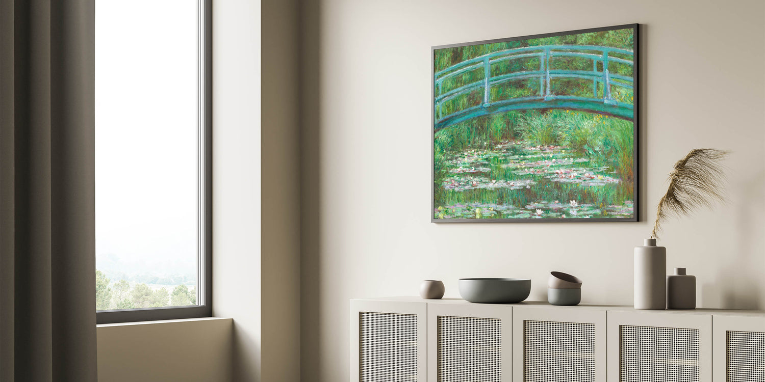 Add a touch of elegance and tranquility to your home with Claude Monet's iconic painting, "The Japanese Footbridge, 1899." This Impressionist masterpiece captures the serene beauty of Monet's garden at Giverny, with its famous Japanese footbridge spanning a lush water lily pond. The soft greens and blues create a calming atmosphere, while Monet’s signature brushstrokes bring the scene to life. This artwork is perfect for those who appreciate Monet's nature-inspired landscapes and are looking to add a timeless piece to their décor.