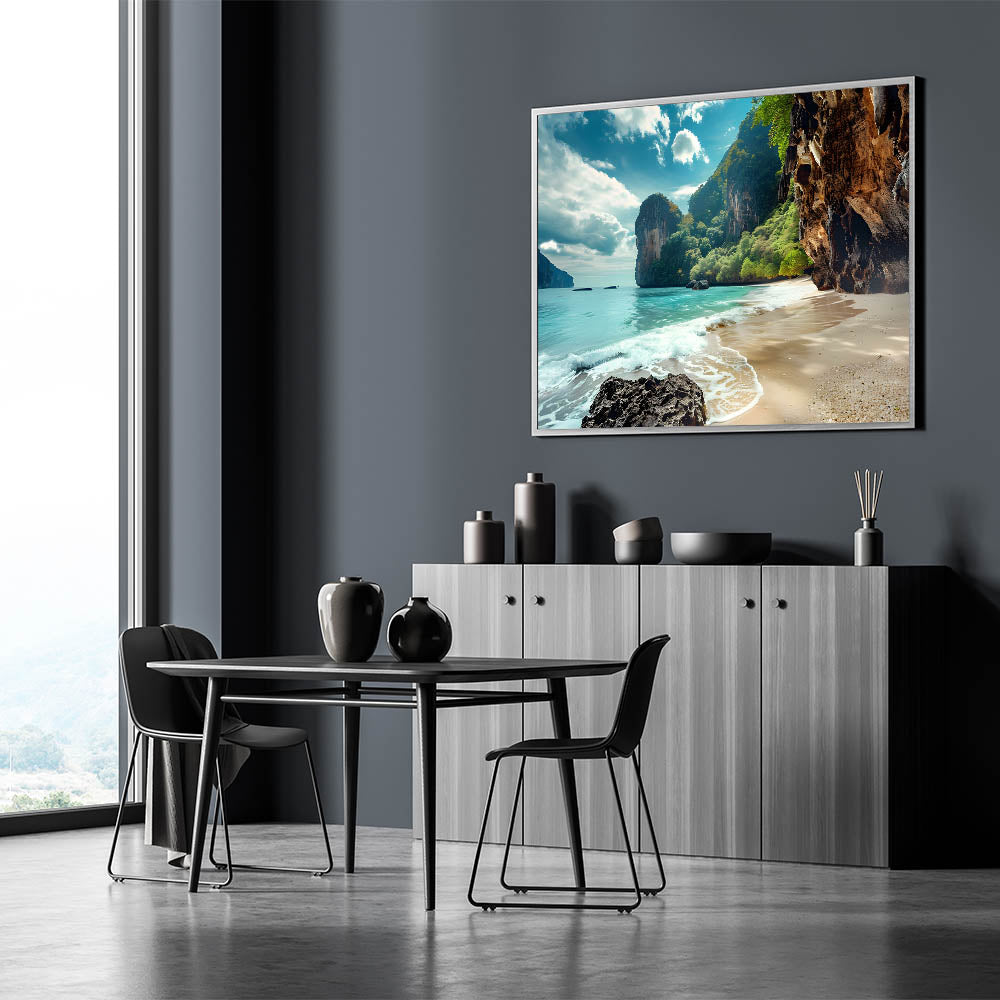 Bring the awe-inspiring beauty of nature into your home with our Cliffside Beach Serenity Wall Art. This stunning piece captures a tranquil beach framed by towering cliffs and lush greenery, with the gentle waves lapping at the shore under a dramatic sky. The intricate details and vivid colors of this artwork make it a perfect addition to any room, creating a peaceful retreat that reflects the natural beauty of coastal landscapes.