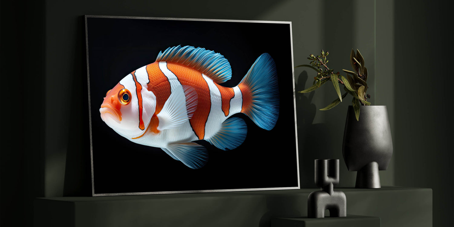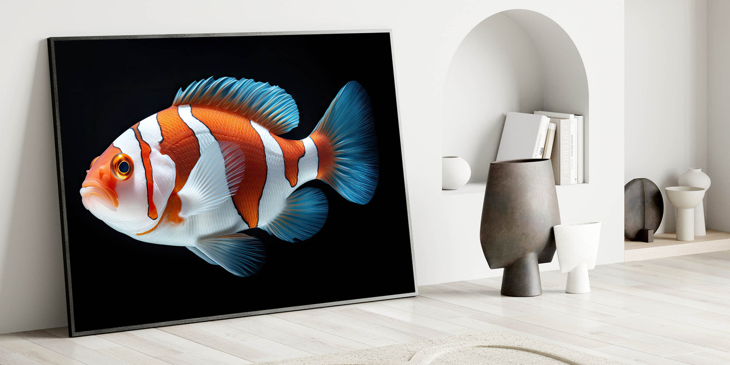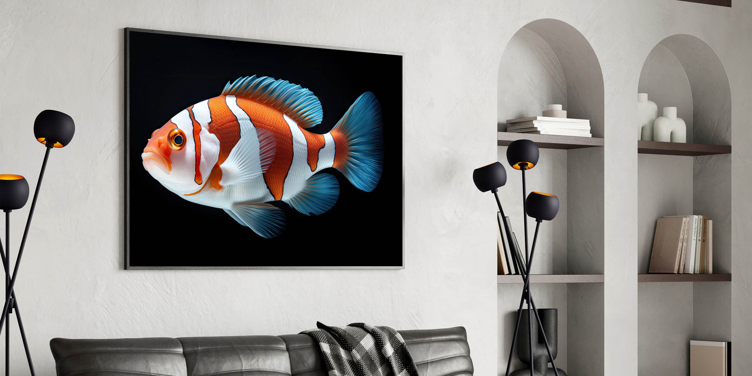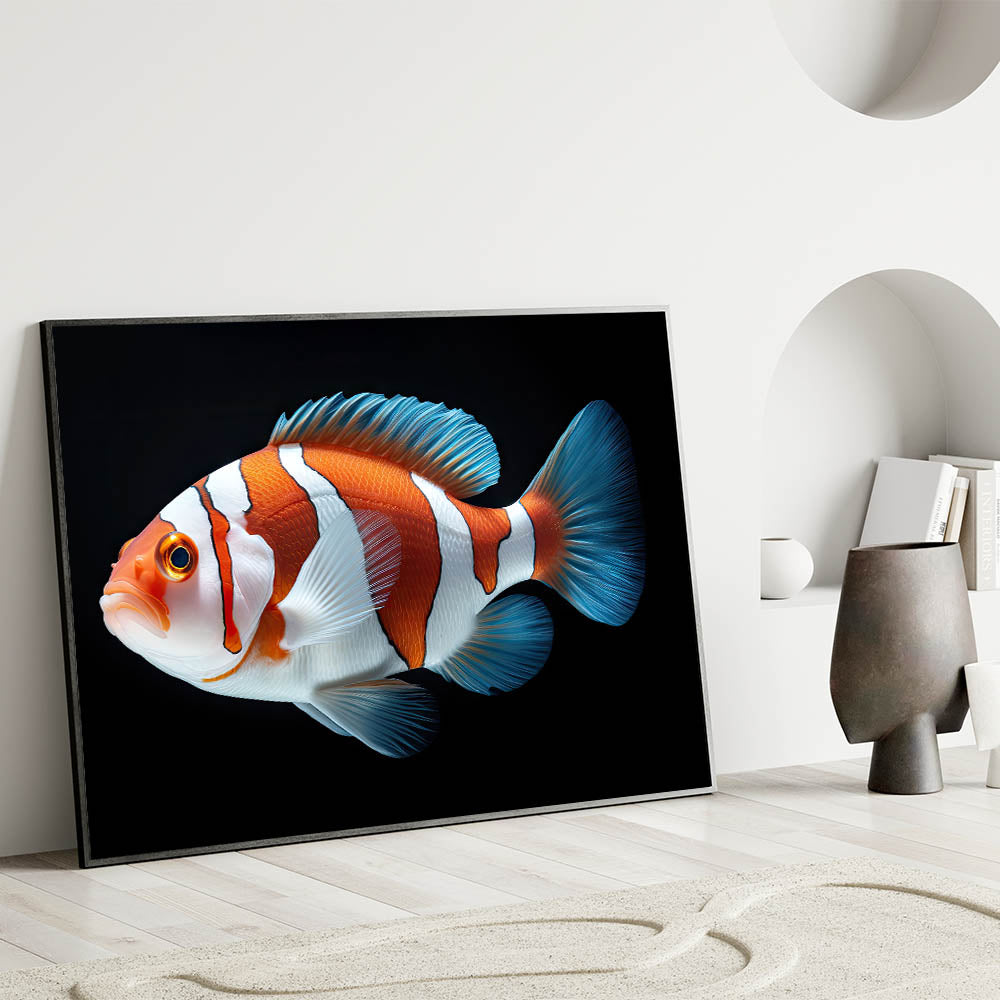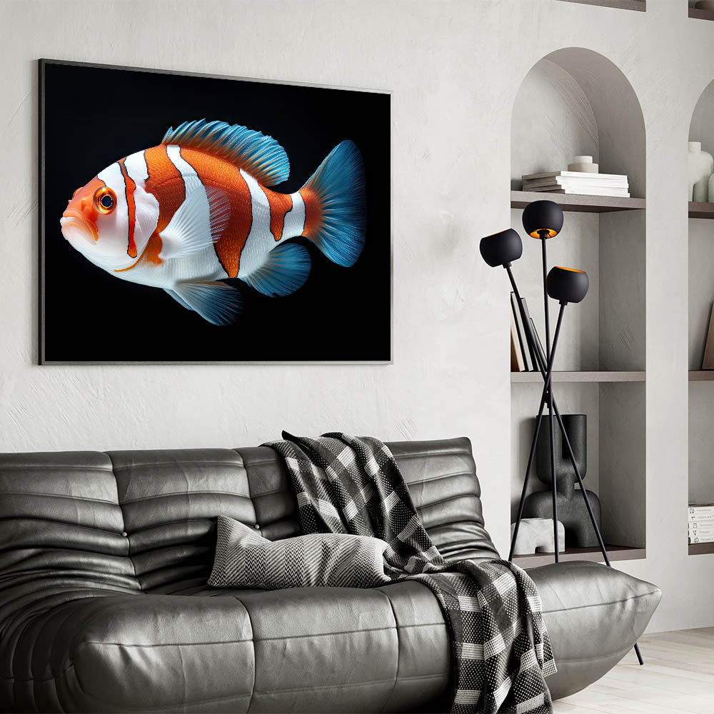 - Detailed Imagery: The Clownfish’s vivid orange and white stripes, along with the rich blue accents, are rendered in striking detail, making it a focal point in any room.