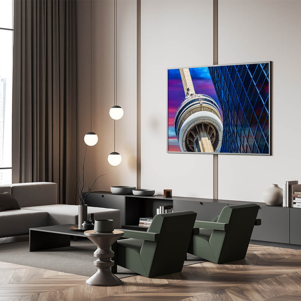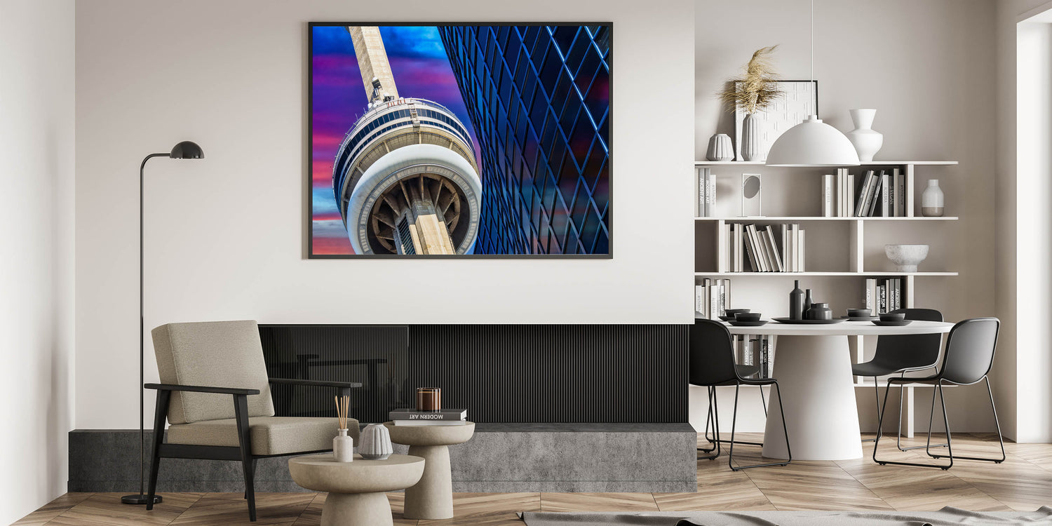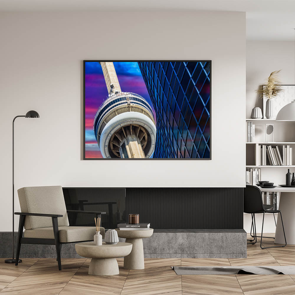 Celebrate the modern beauty of Toronto’s skyline with this striking wall art featuring the iconic CN Tower alongside a sleek glass building. Captured against a vibrant sunset sky, this Ontario Landscape Print highlights the fusion of architecture and color. The bold lines of the CN Tower juxtaposed with the reflective surfaces of the modern building create a visually dynamic scene, perfect for urban and contemporary spaces.
