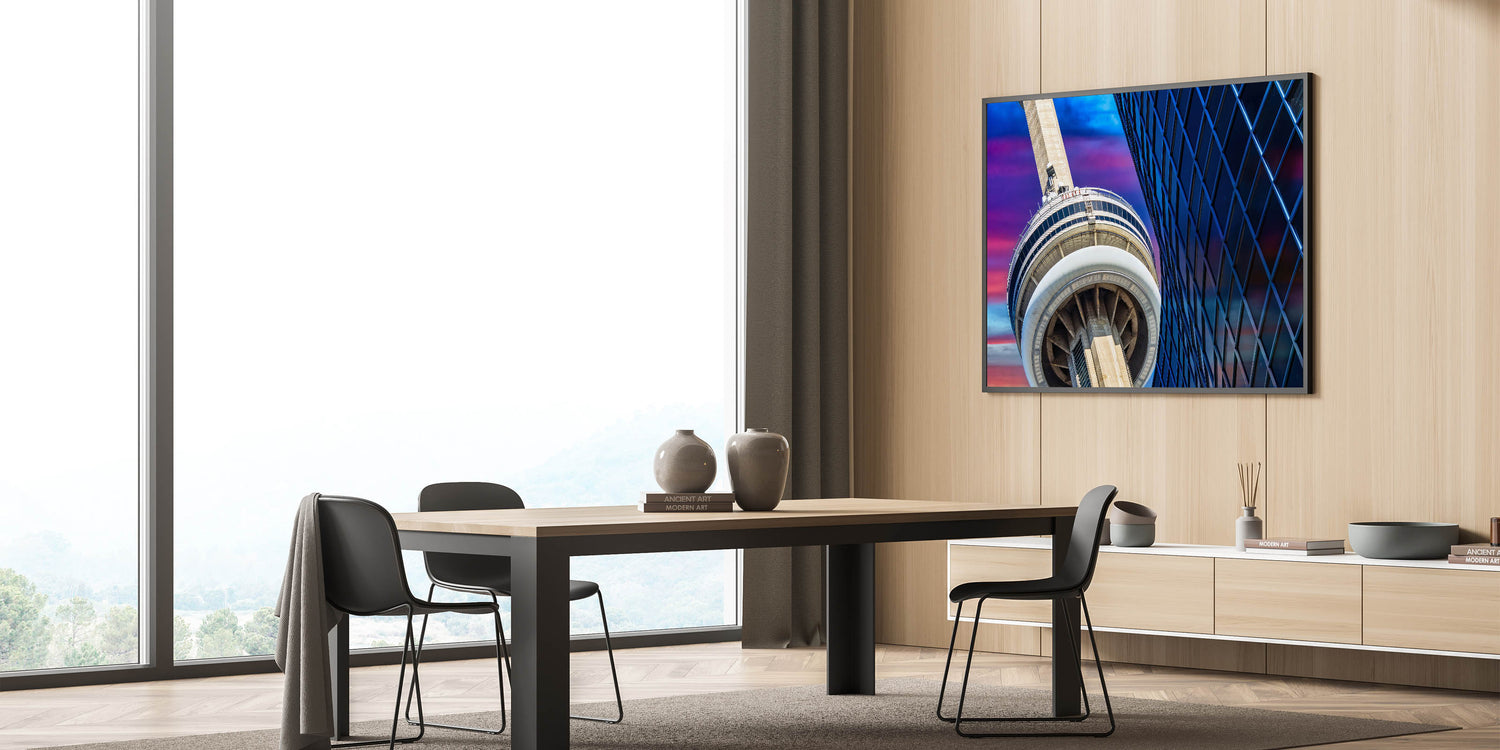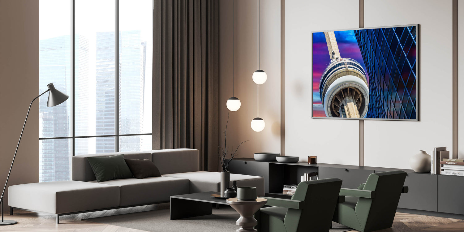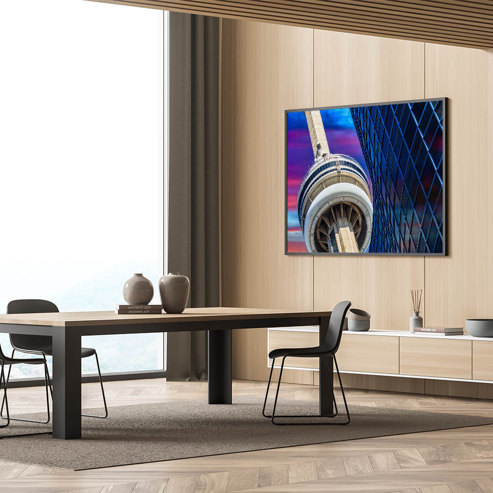Celebrate the modern beauty of Toronto’s skyline with this striking wall art featuring the iconic CN Tower alongside a sleek glass building. Captured against a vibrant sunset sky, this Ontario Landscape Print highlights the fusion of architecture and color. The bold lines of the CN Tower juxtaposed with the reflective surfaces of the modern building create a visually dynamic scene, perfect for urban and contemporary spaces.