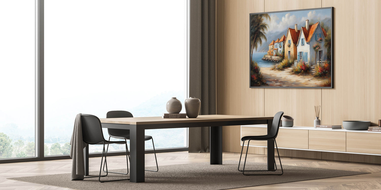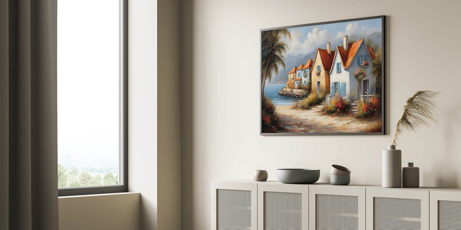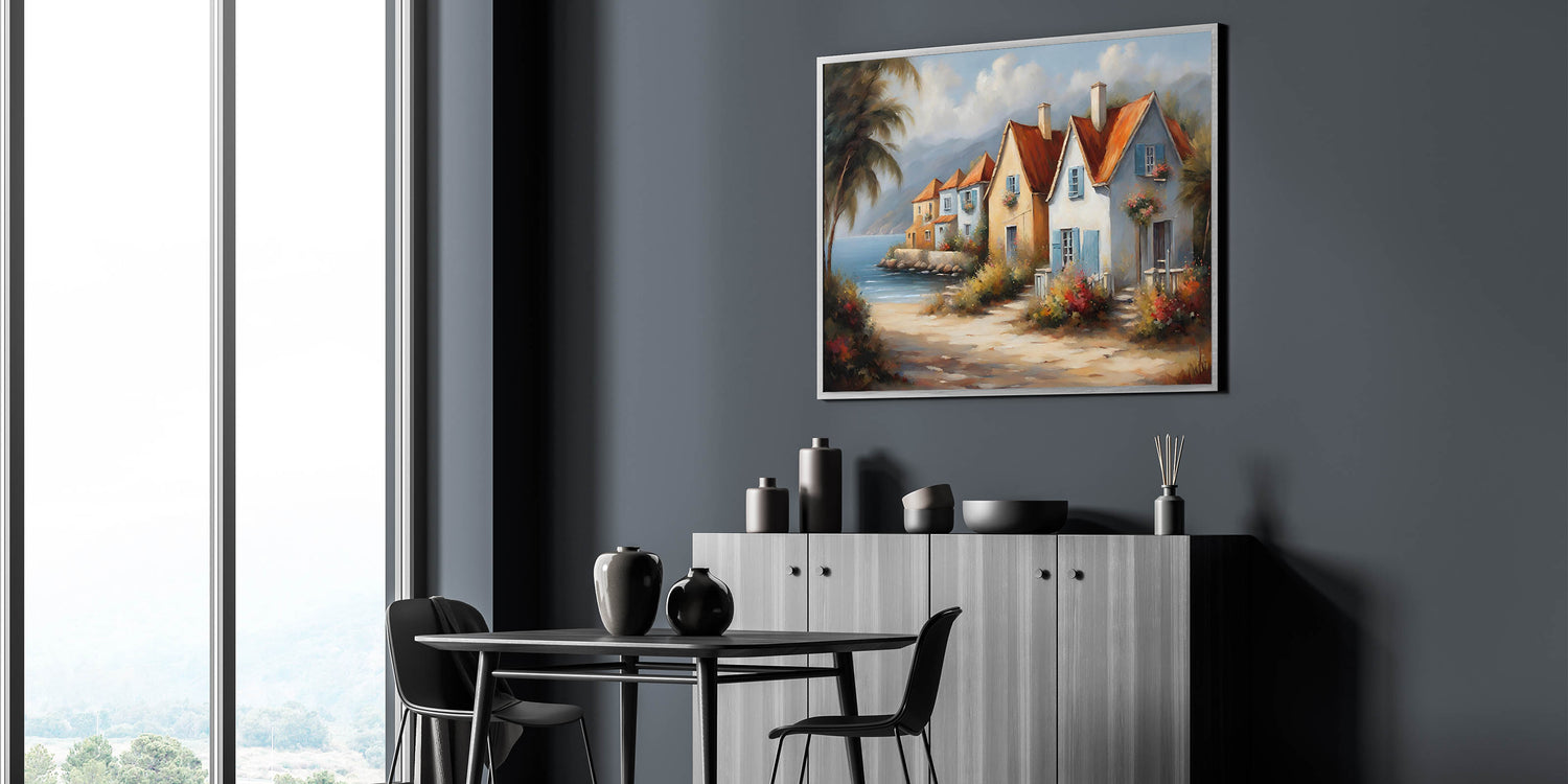 This coastal village art is more than just a decor piece; it’s an invitation to escape to a charming seaside retreat. Perfect for those who appreciate coastal decor and are looking for house decor ideas that blend vibrant color with serene beauty.
