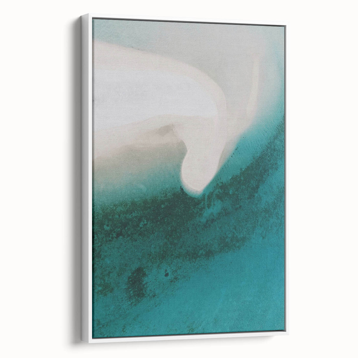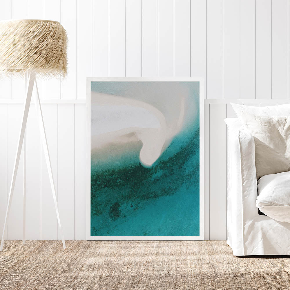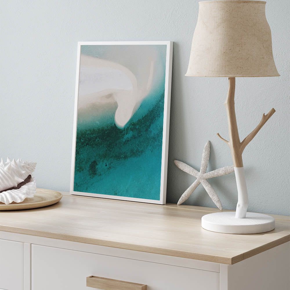 Immerse yourself in the tranquility of the coast with this breathtaking aerial view of a white sand beach and the gentle gradient of turquoise blue ocean waters. The soft, flowing lines of the shore contrast beautifully with the deep blues of the water, creating a serene and calming atmosphere. This artwork perfectly captures the peaceful essence of the beach and is ideal for coastal-inspired or beach-themed decor.