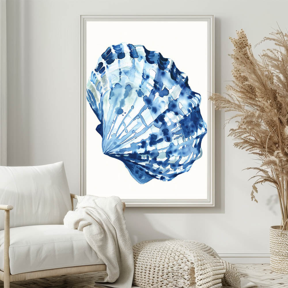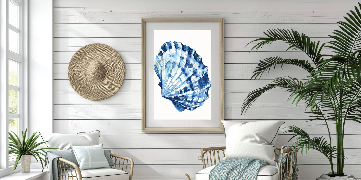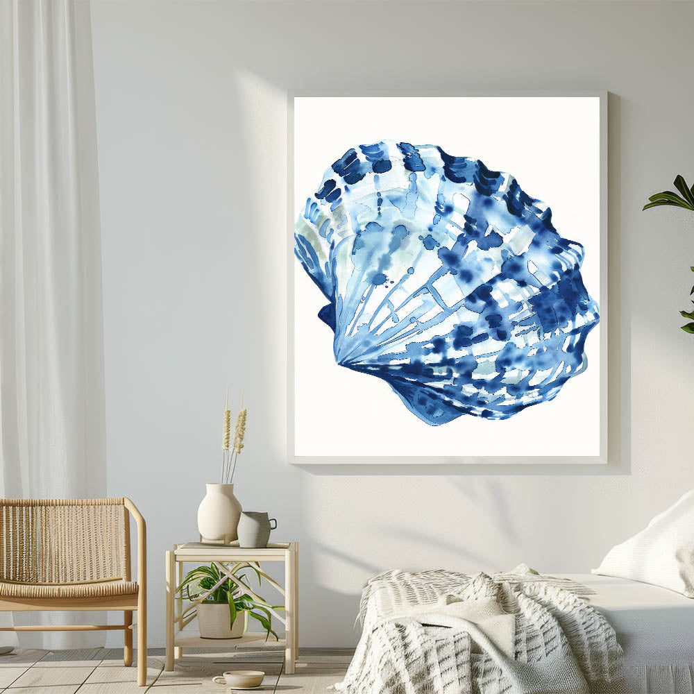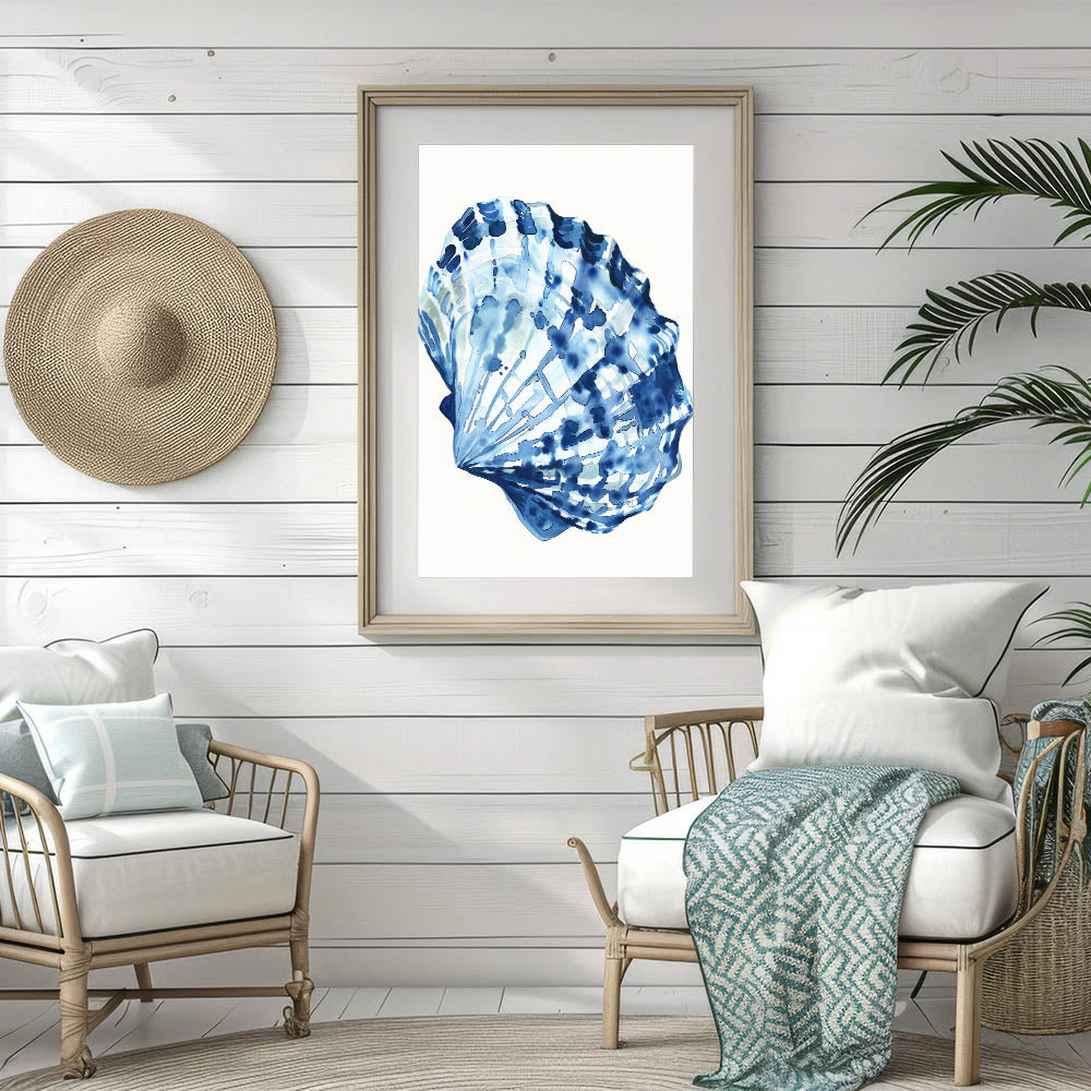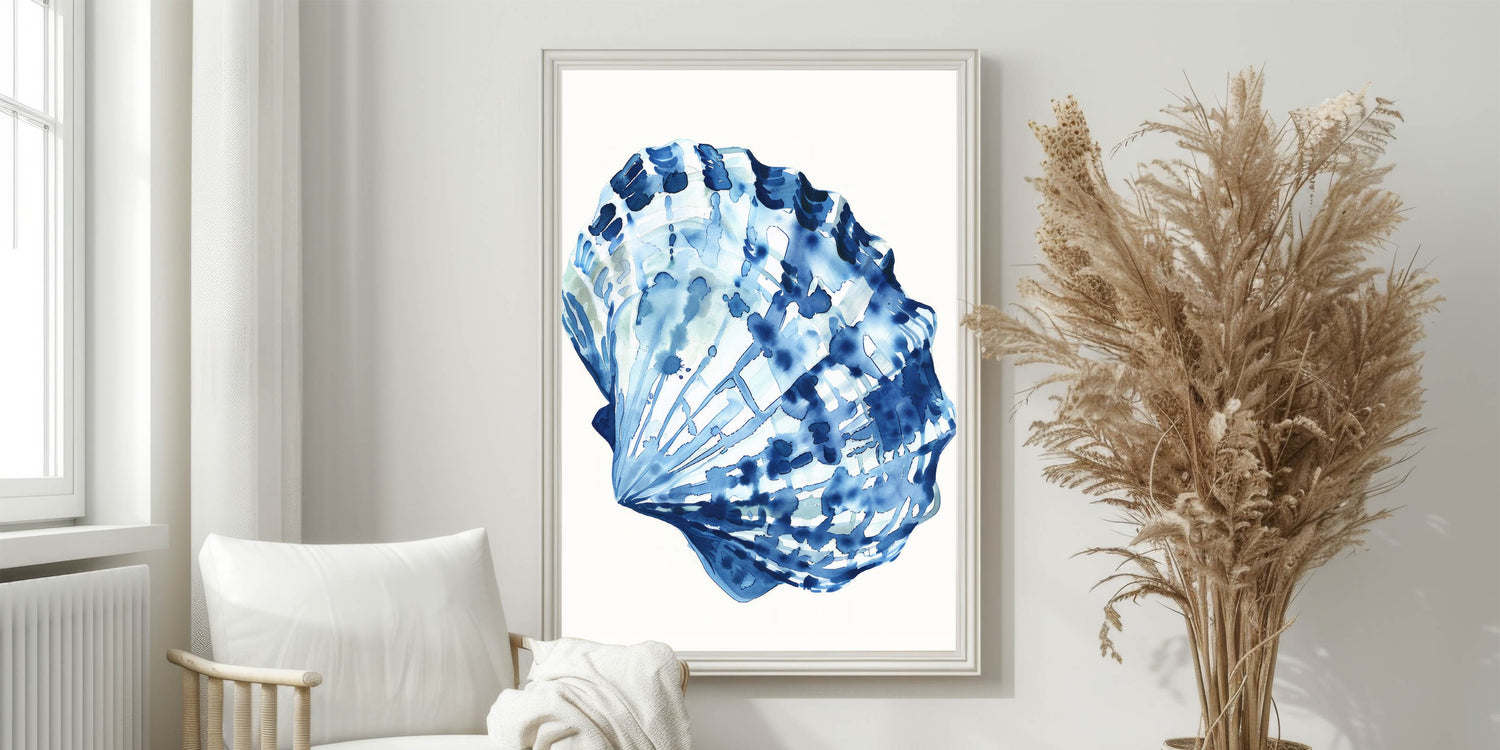 Bring the serenity of the sea into your home with this striking blue seashell art print, perfect for creating a calming, beach-inspired environment that reflects the natural beauty of the coast.