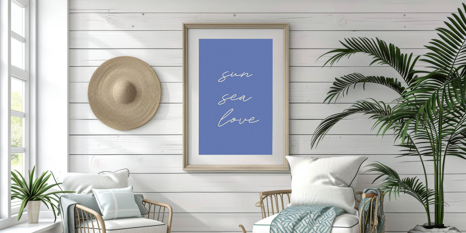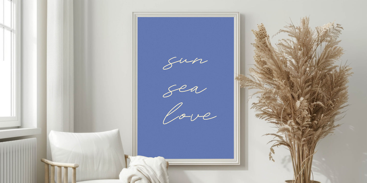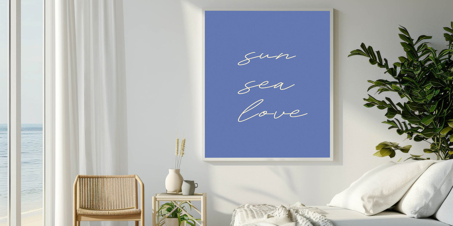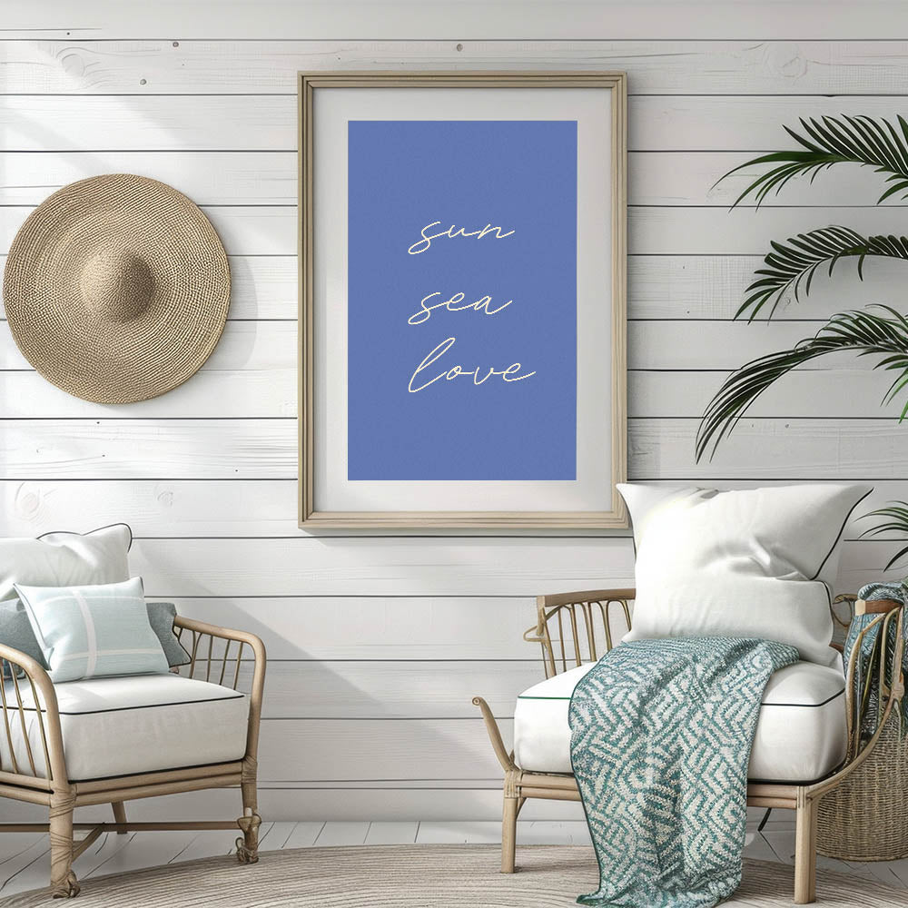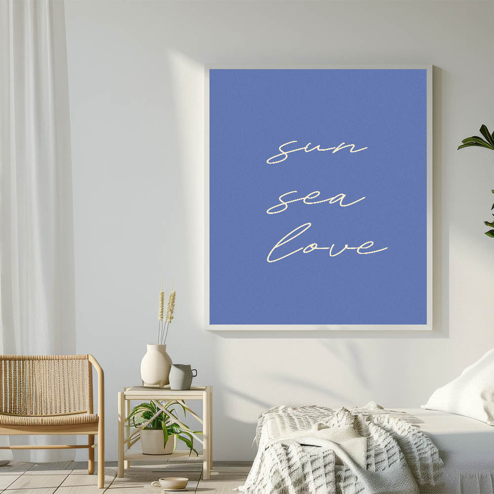 This elegant and minimalist typography print featuring the words "Sun, Sea, Love" captures the essence of coastal living in a simple, yet impactful way. The soft, flowing script and calming blue background evoke the serenity of the beach, making this artwork a perfect addition to any coastal or beach-themed decor. The simplicity of the design allows it to blend effortlessly into a variety of interior styles while still making a statement.