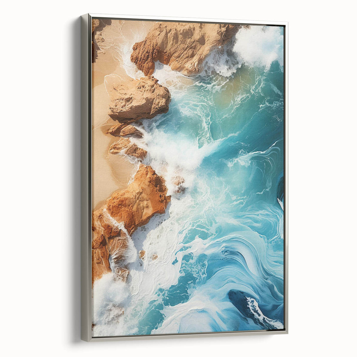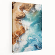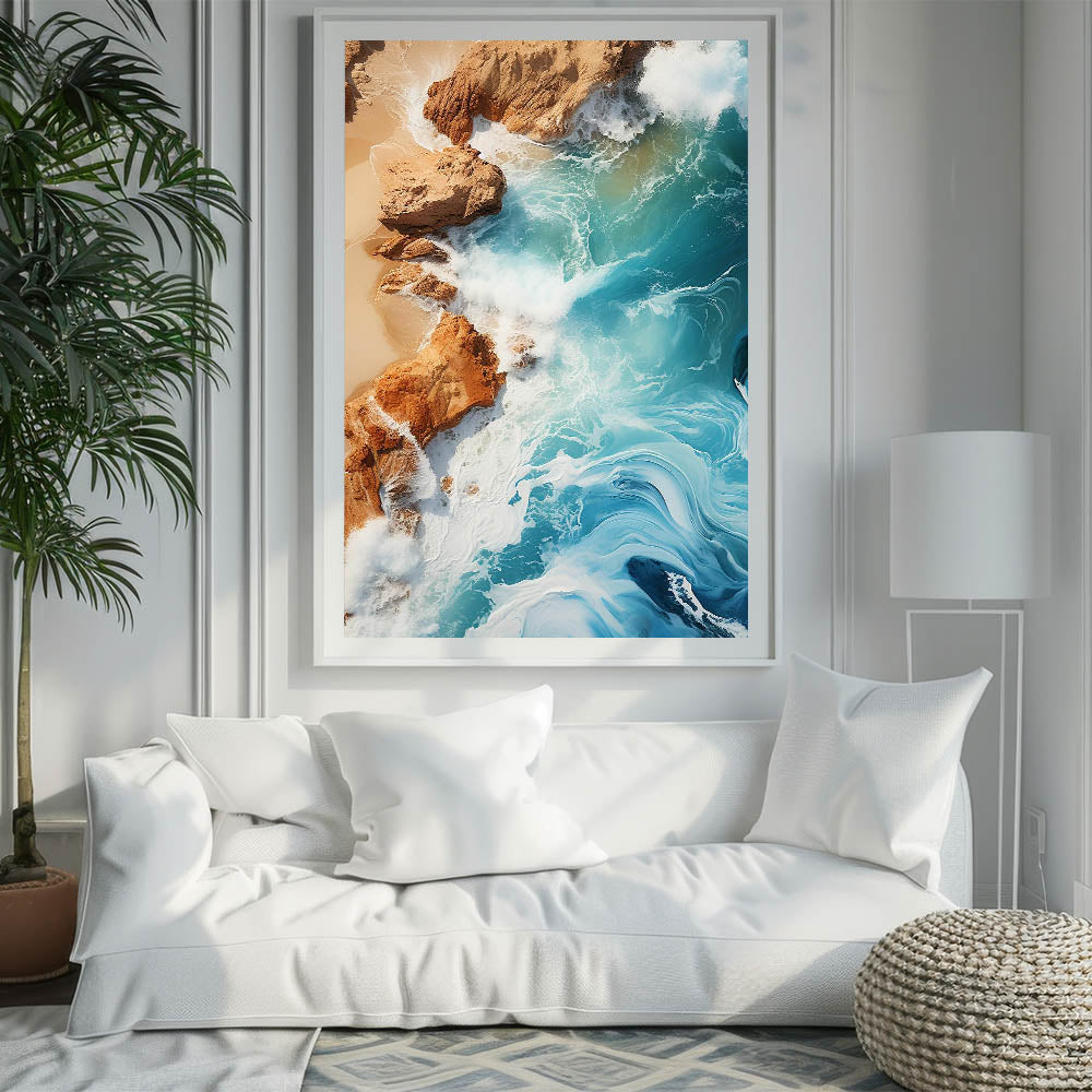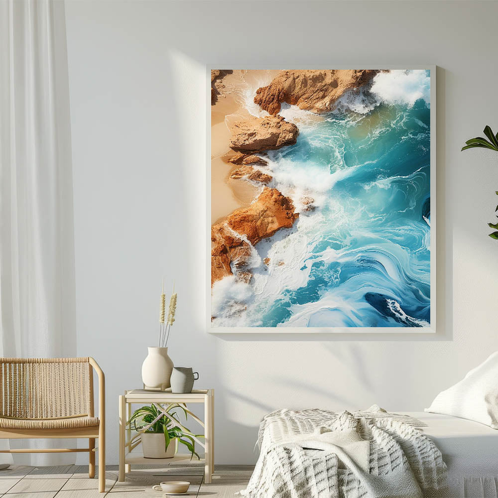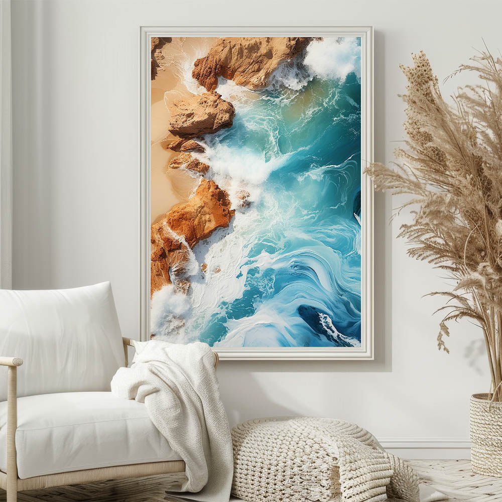 Capture the raw beauty of the ocean with this stunning coastal wall art featuring powerful waves crashing against a rocky shoreline. The vibrant blues of the ocean swirl against the rugged orange-brown rocks, creating a dynamic and captivating piece of art that brings the energy and serenity of the sea into your home. This artwork is perfect for any beach-themed or coastal-inspired space, adding both color and movement to your decor.