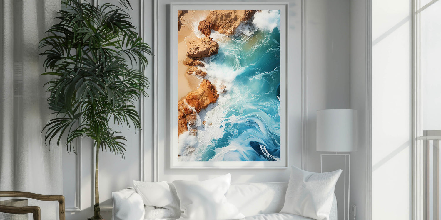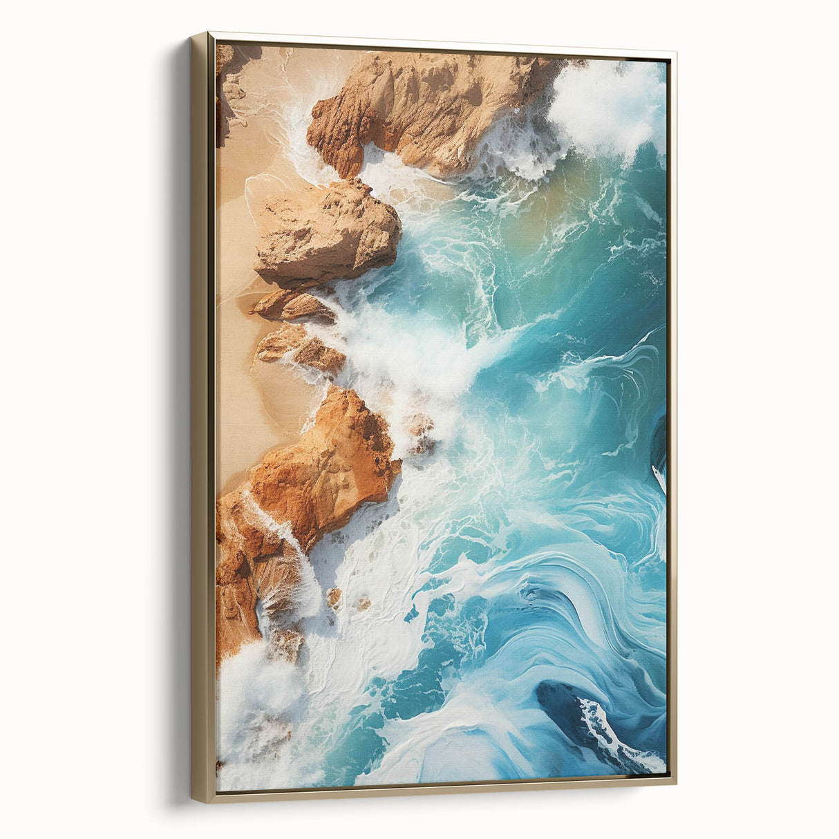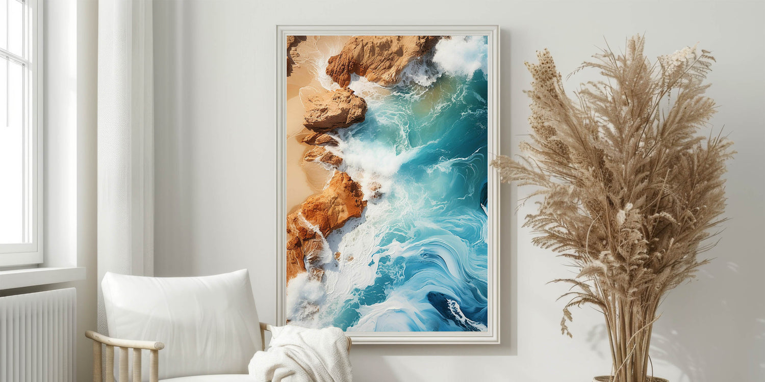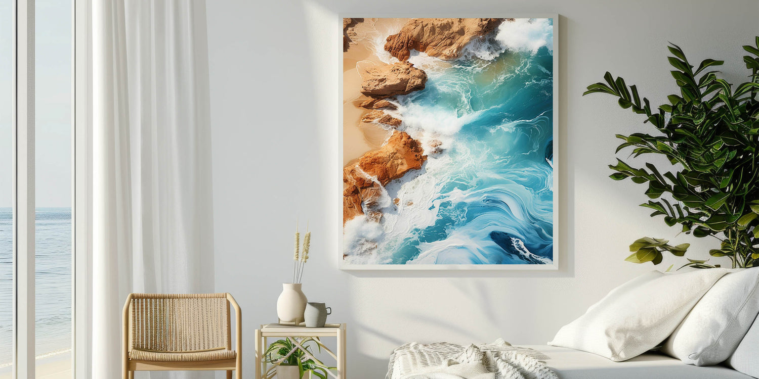 Capture the raw beauty of the ocean with this stunning coastal wall art featuring powerful waves crashing against a rocky shoreline. The vibrant blues of the ocean swirl against the rugged orange-brown rocks, creating a dynamic and captivating piece of art that brings the energy and serenity of the sea into your home. This artwork is perfect for any beach-themed or coastal-inspired space, adding both color and movement to your decor.