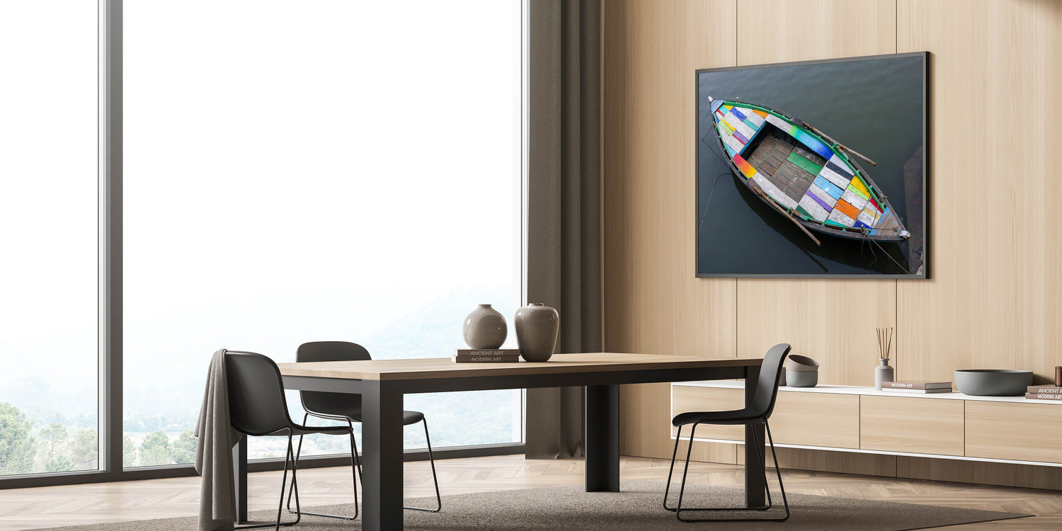 Add a pop of color to your home with this Colorful Boat on Water Wall Art. This striking canvas print captures a vibrant boat floating gently on the water. The boat's patchwork of bright colors—reds, blues, greens, yellows, and purples—creates a captivating contrast against the calm, muted tones of the water, making this artwork a perfect piece to bring energy and life to any room.