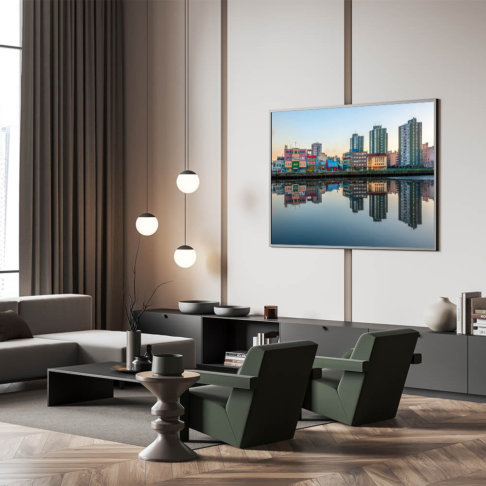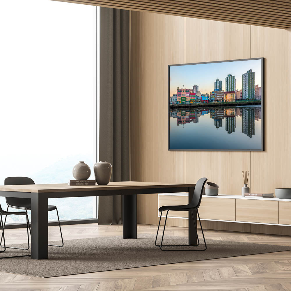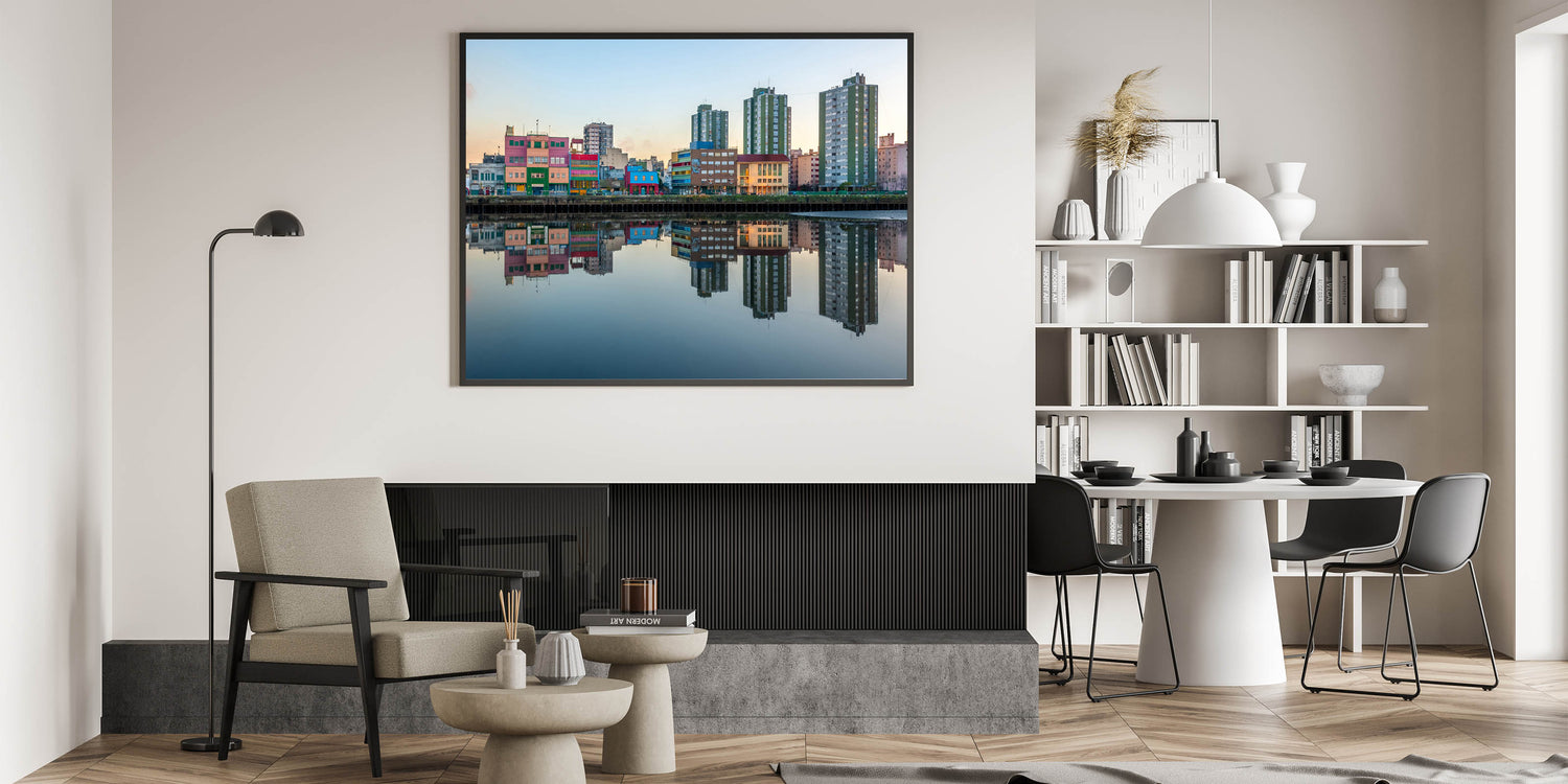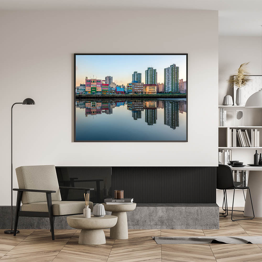 Add a splash of color to your walls with our "Colorful Buenos Aires Reflections - Canvas Print." This vivid artwork captures a serene early morning in Buenos Aires, where the city's colorful architecture is perfectly mirrored in the calm waters below.