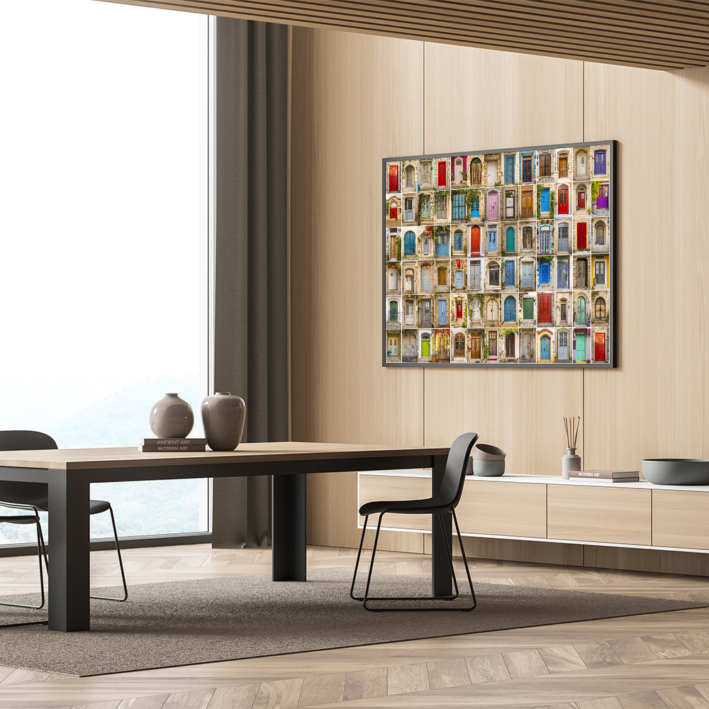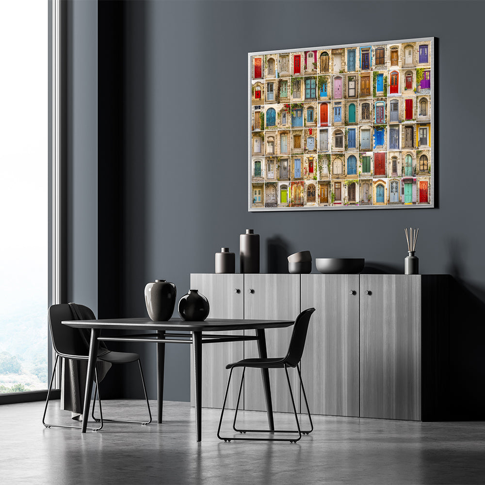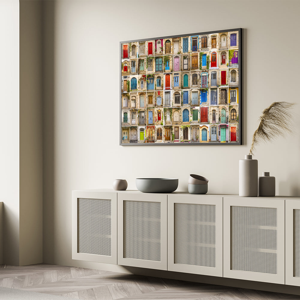 This colorful door collage artwork is perfect for creating a lively and dynamic focal point in any room, celebrating the beauty of architecture and the stories doors can tell.