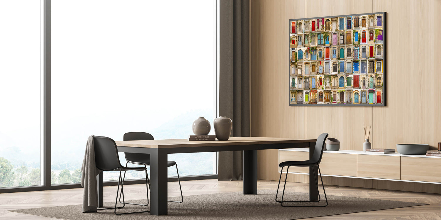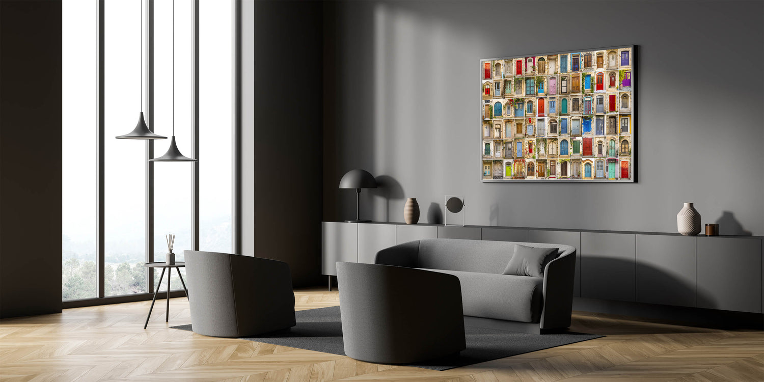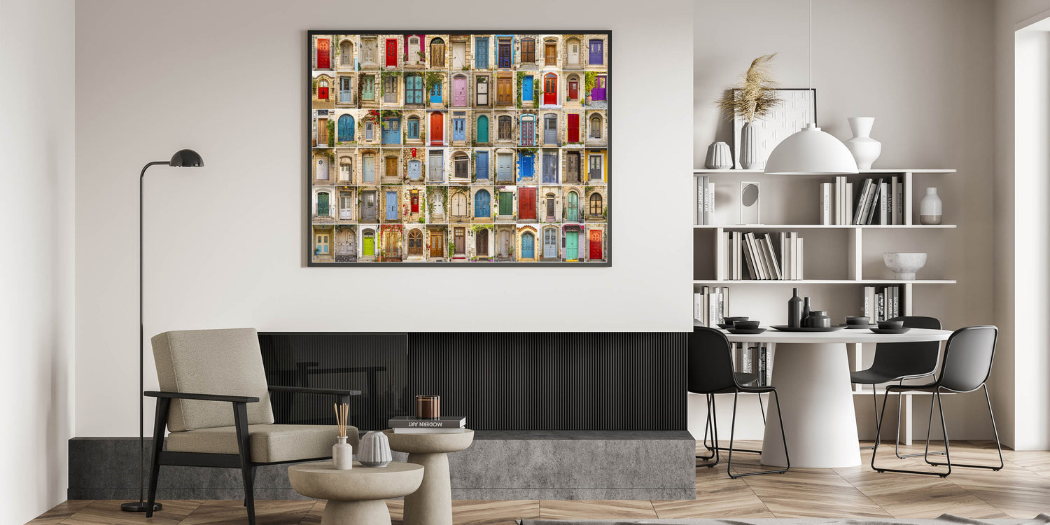 This colorful door collage artwork is perfect for creating a lively and dynamic focal point in any room, celebrating the beauty of architecture and the stories doors can tell.