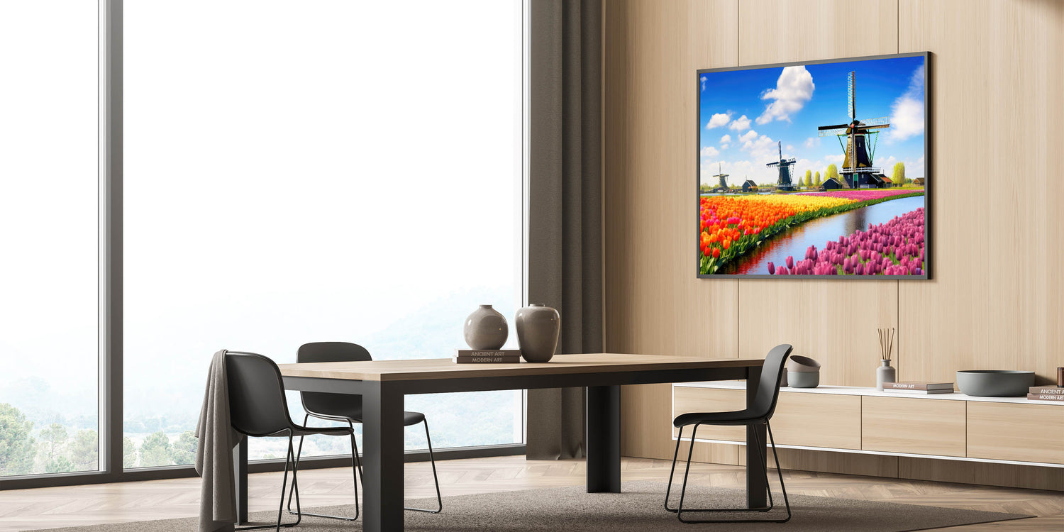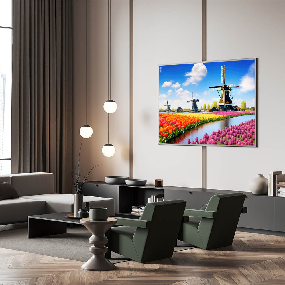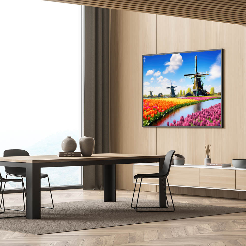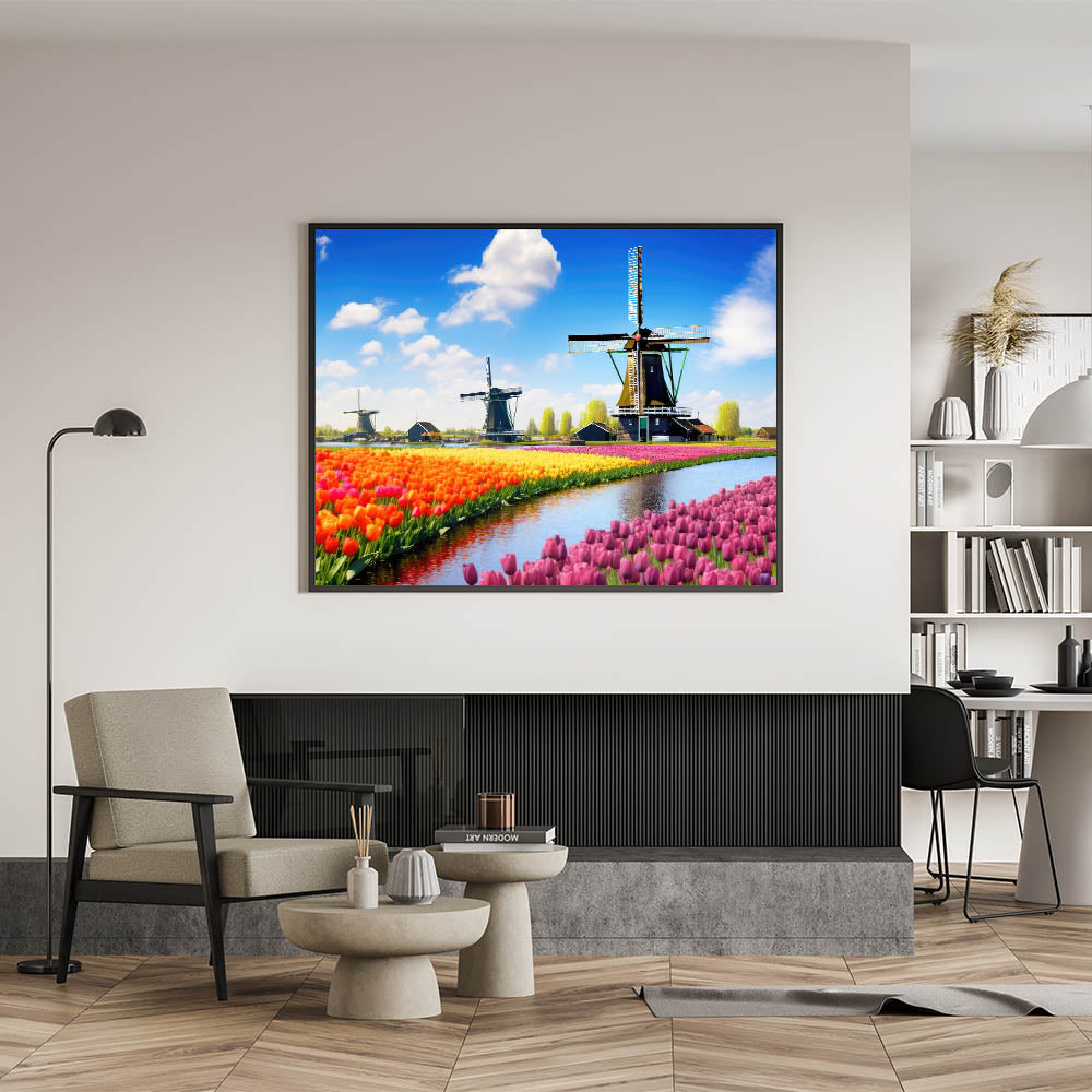 This stunning tulip and windmill wall art is perfect for anyone seeking to bring a bit of Dutch beauty and color into their home décor. Its lively colors and charming scenery make it an ideal statement piece for any space.