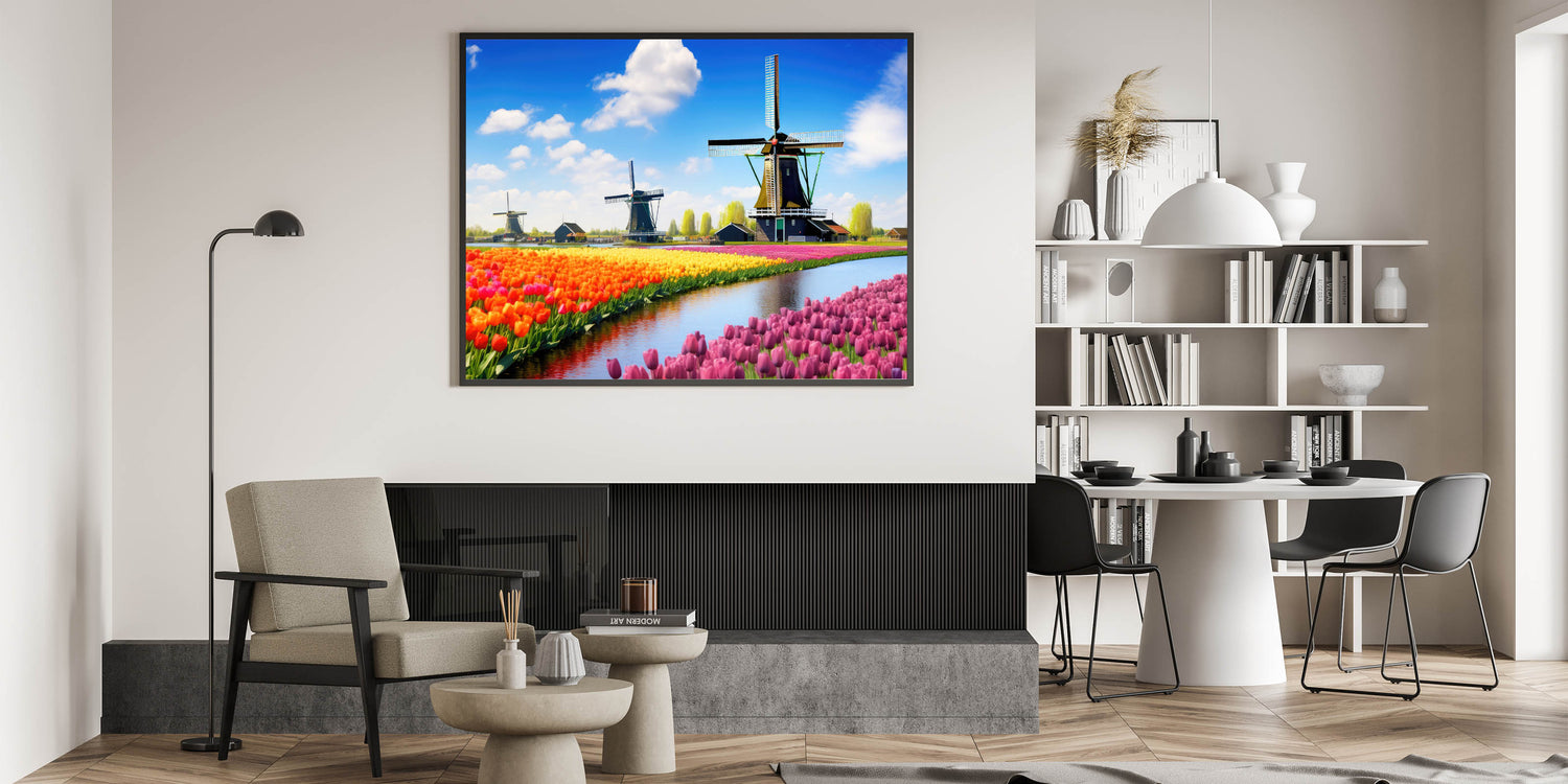 Bring the charm of the Netherlands into your home with this vibrant Dutch tulip field wall art, featuring iconic windmills and a sea of multicolored tulips. With rows of bright orange, pink, purple, and yellow tulips lining the serene water and classic windmills standing tall against the bright blue sky, this artwork encapsulates the beauty and culture of the Dutch landscape. Perfect for adding a burst of color and a touch of European charm to any room, this tulip art will brighten your space with its dynamic energy and vibrant hues.
