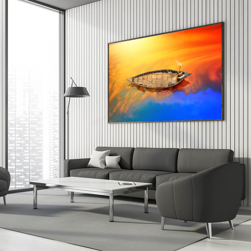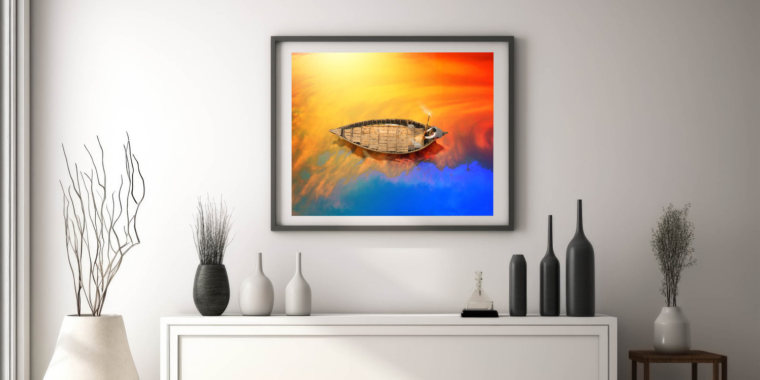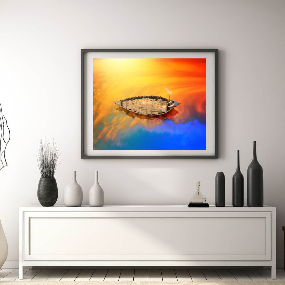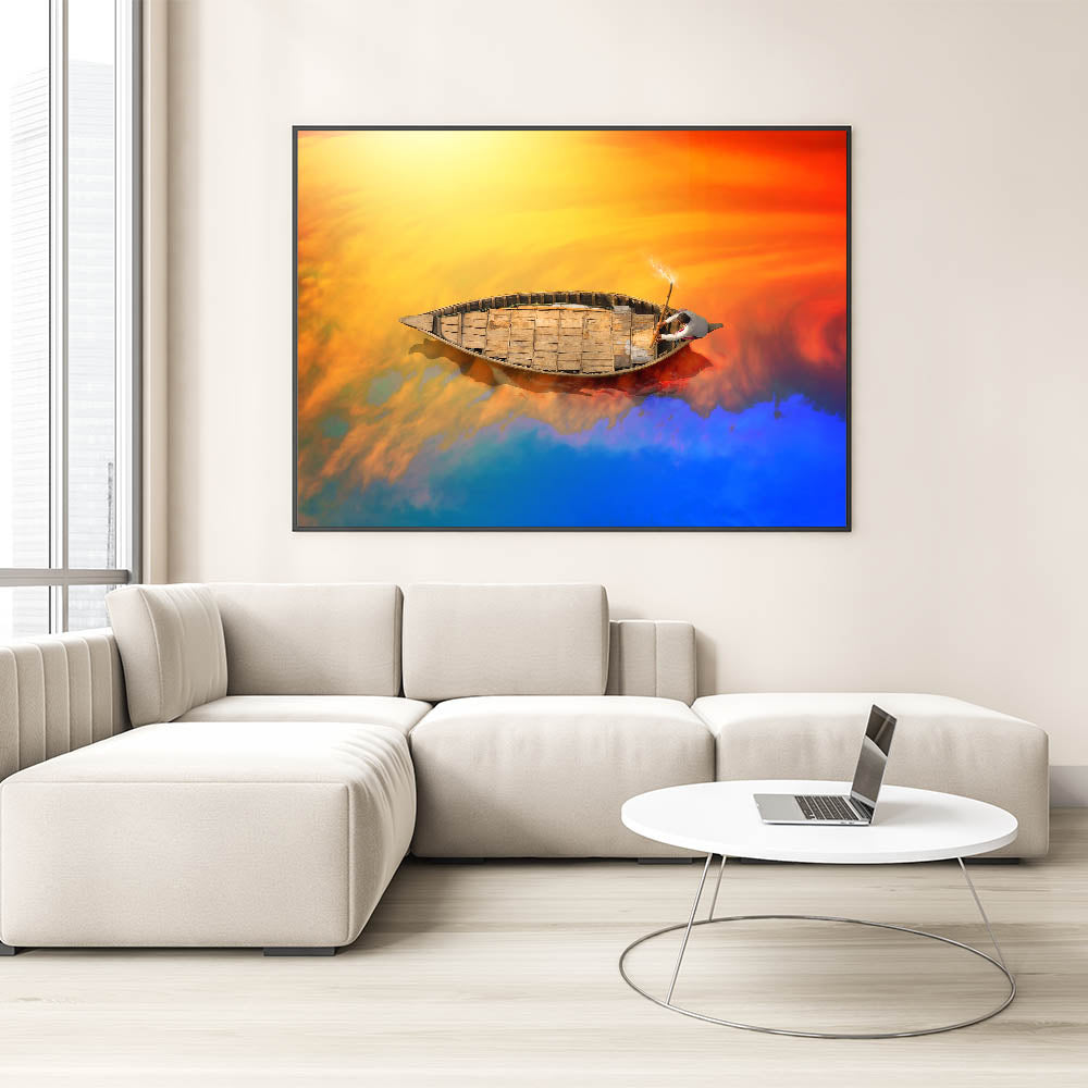Infuse your space with the vibrant energy of this stunning wall art, featuring a lone boat on a water surface that reflects a mesmerizing mix of colors. This artwork captures the essence of tranquility and motion, with the boat gently gliding through a kaleidoscope of yellow, orange, and blue hues. The vivid colors and serene composition make this piece a striking addition to any room, perfect for those who appreciate the dynamic beauty of nature.