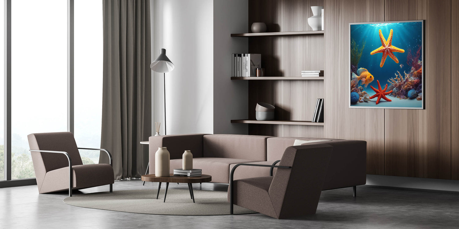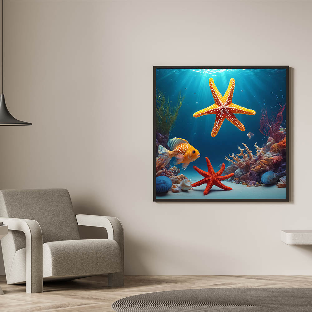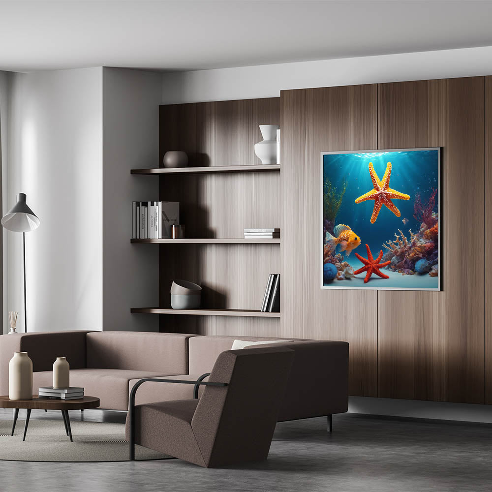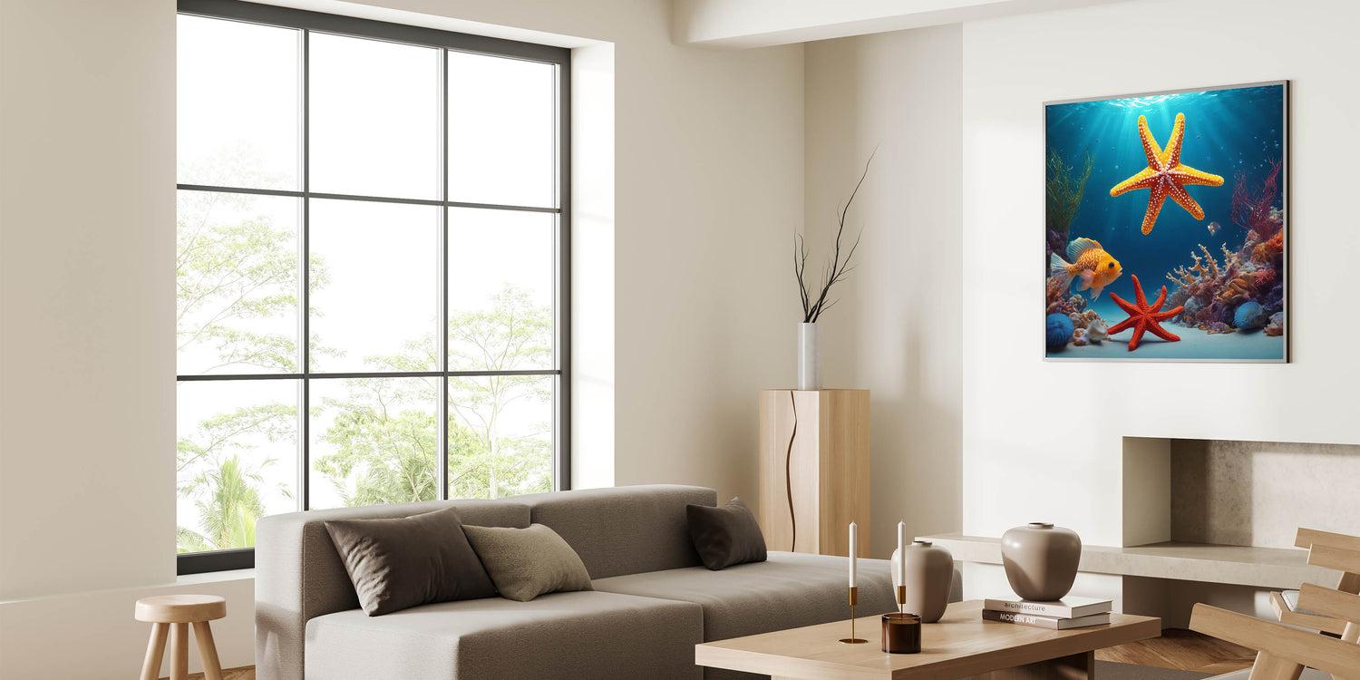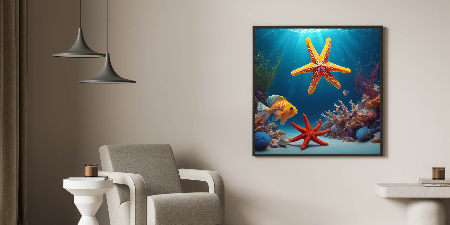Dive into the vibrant underwater world of Seychelles with this striking ocean scene wall art. Featuring bright starfish, colorful coral, and tropical marine life, this Seychelles wall art brings the beauty of the ocean into your home. The rich blues of the water contrast with the vibrant orange of the starfish, creating a bold and exotic aesthetic perfect for tropical island decor.