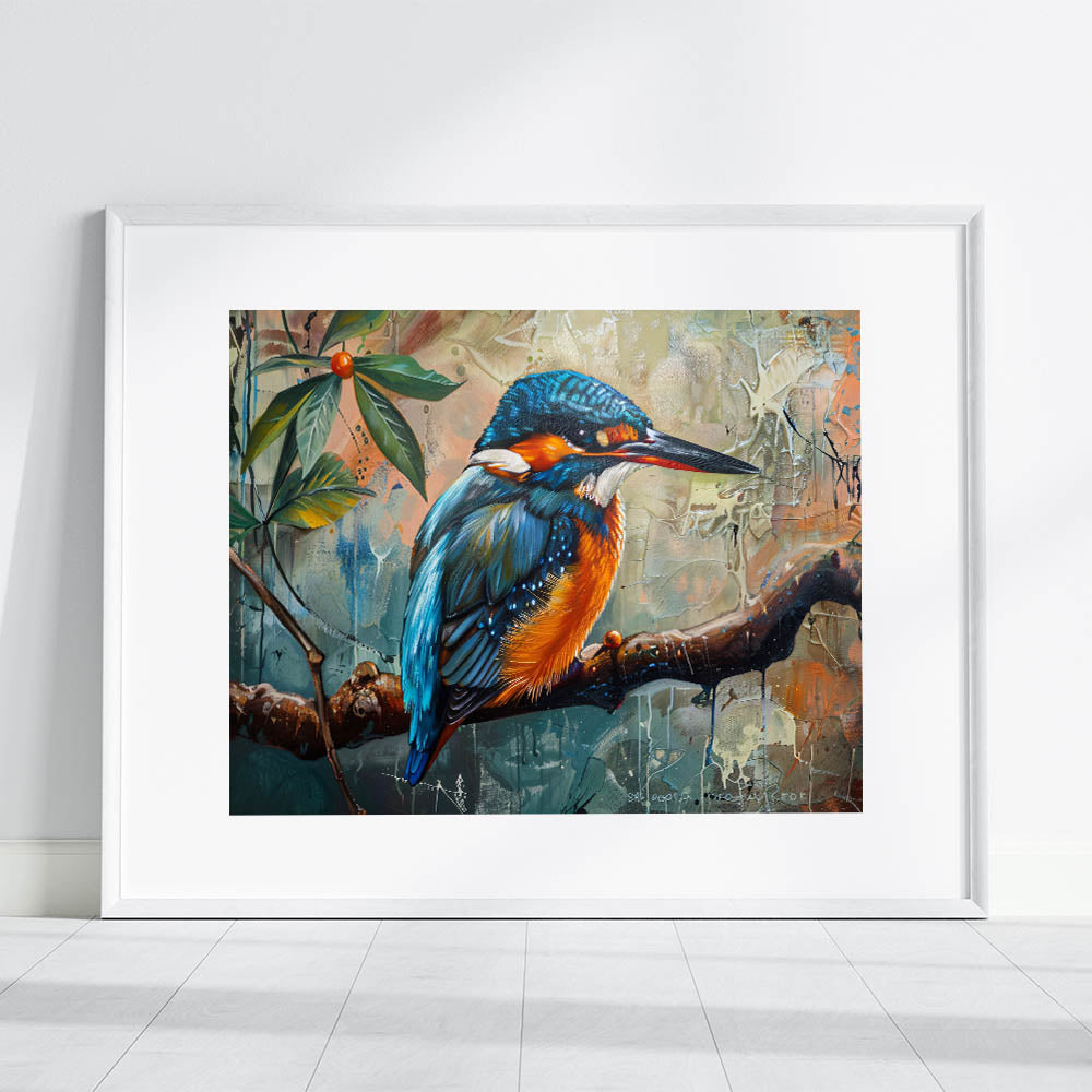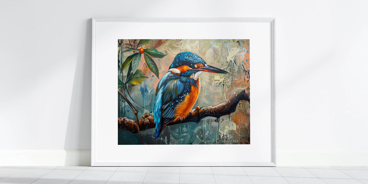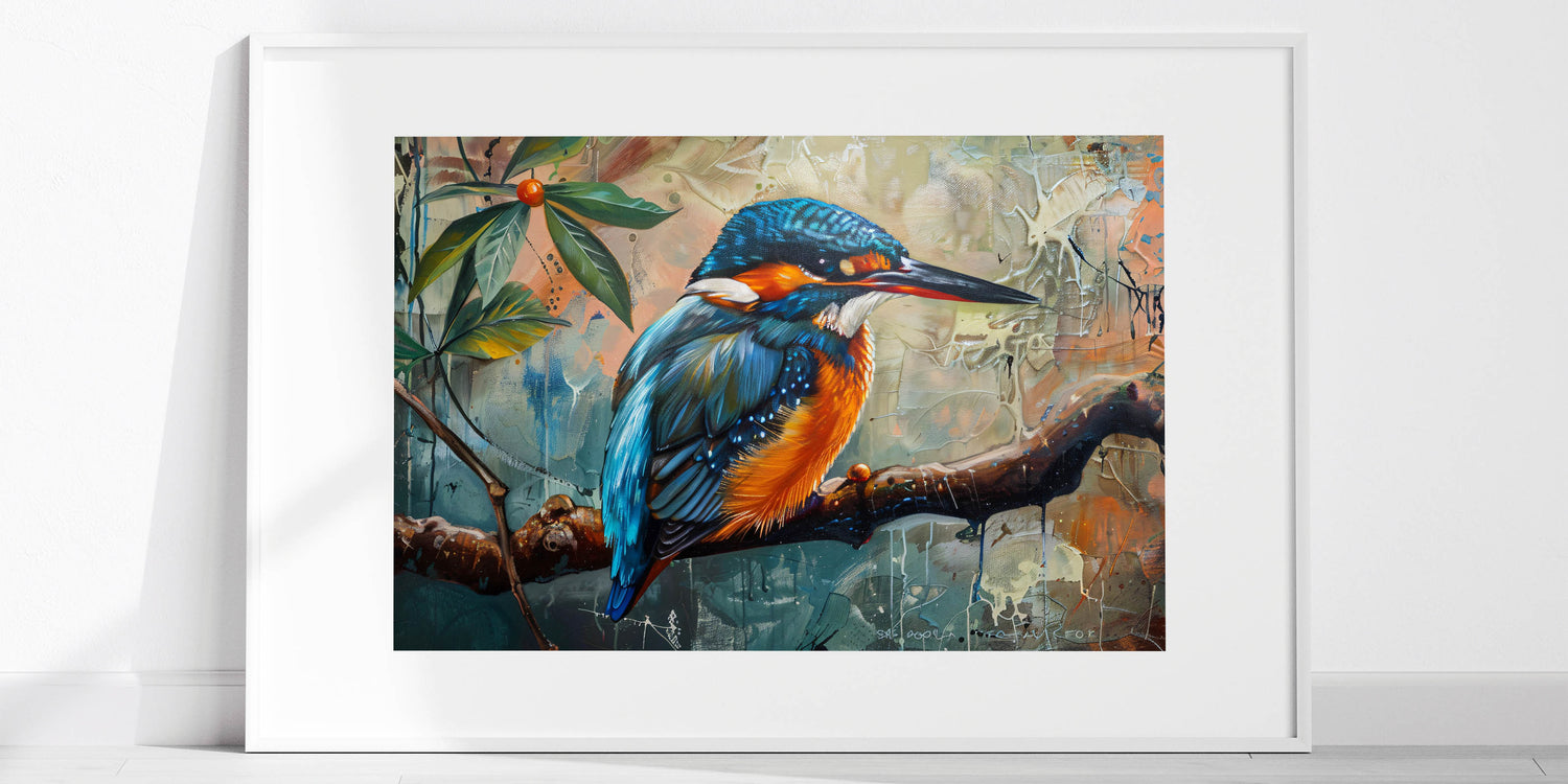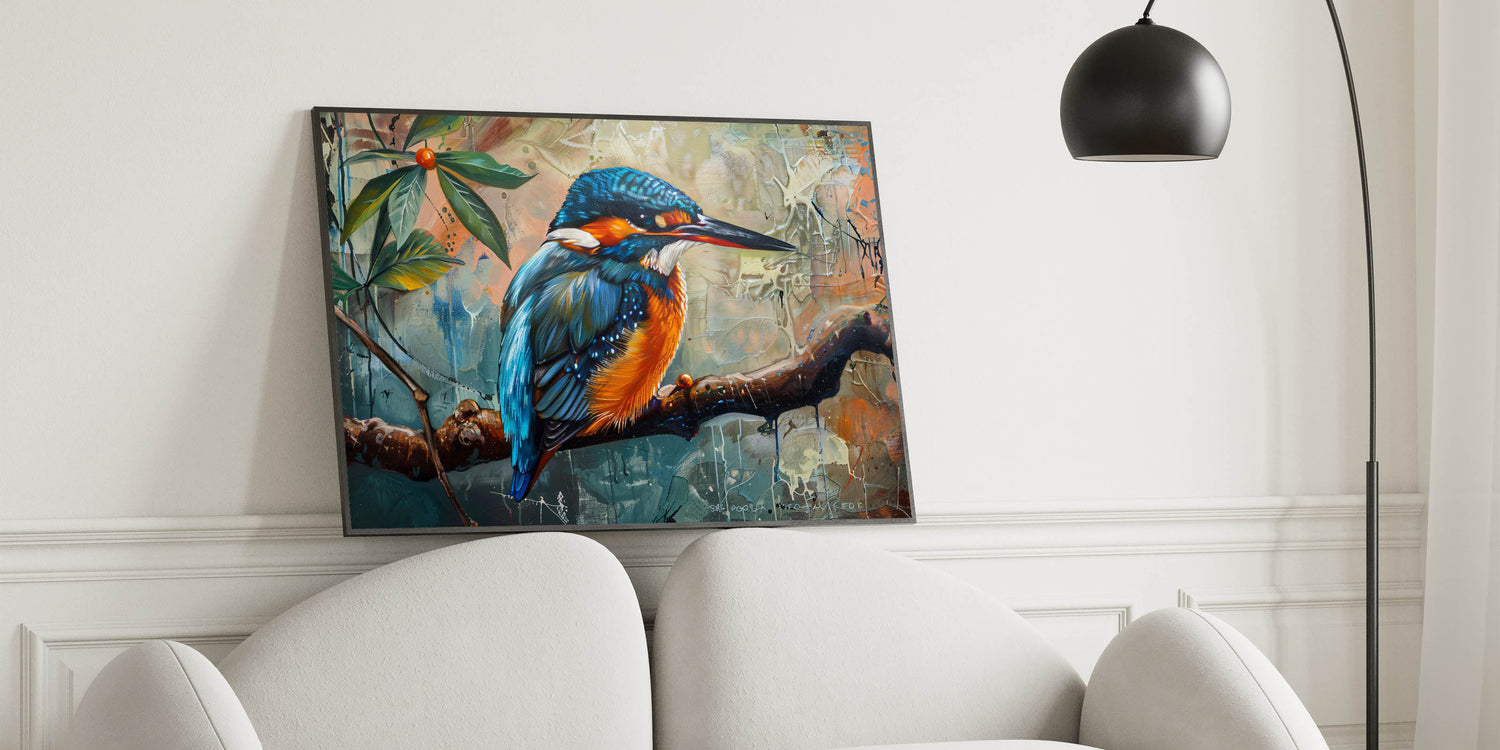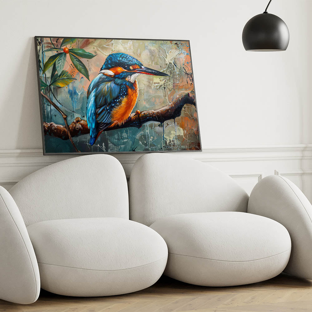 • Vibrant Tropical Birds Decor: Infuse your space with the lively colors of this exotic kingfisher painting.