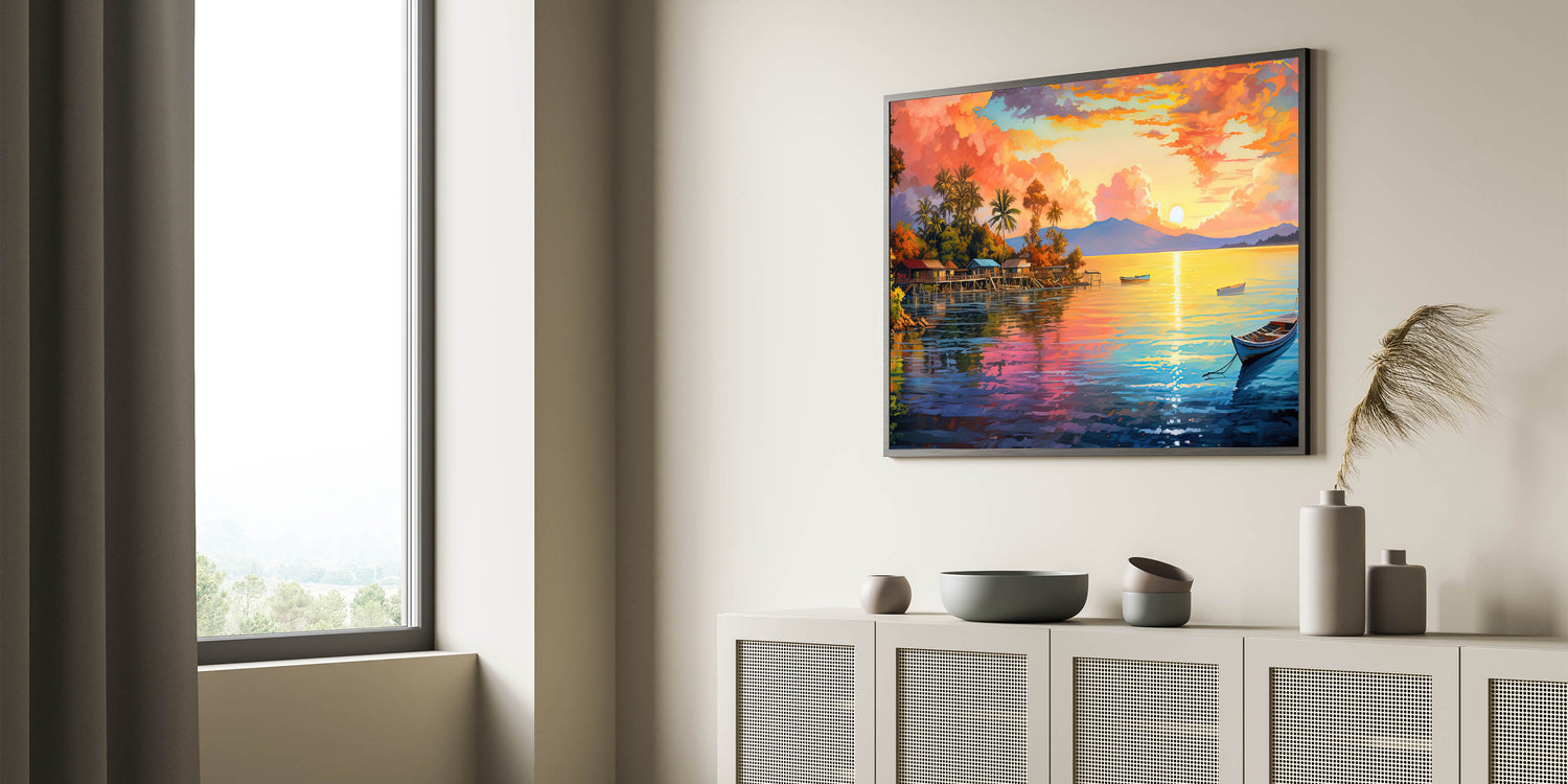 Colorful Tropical Sunset Village - Vibrant Coastal Wall Art
