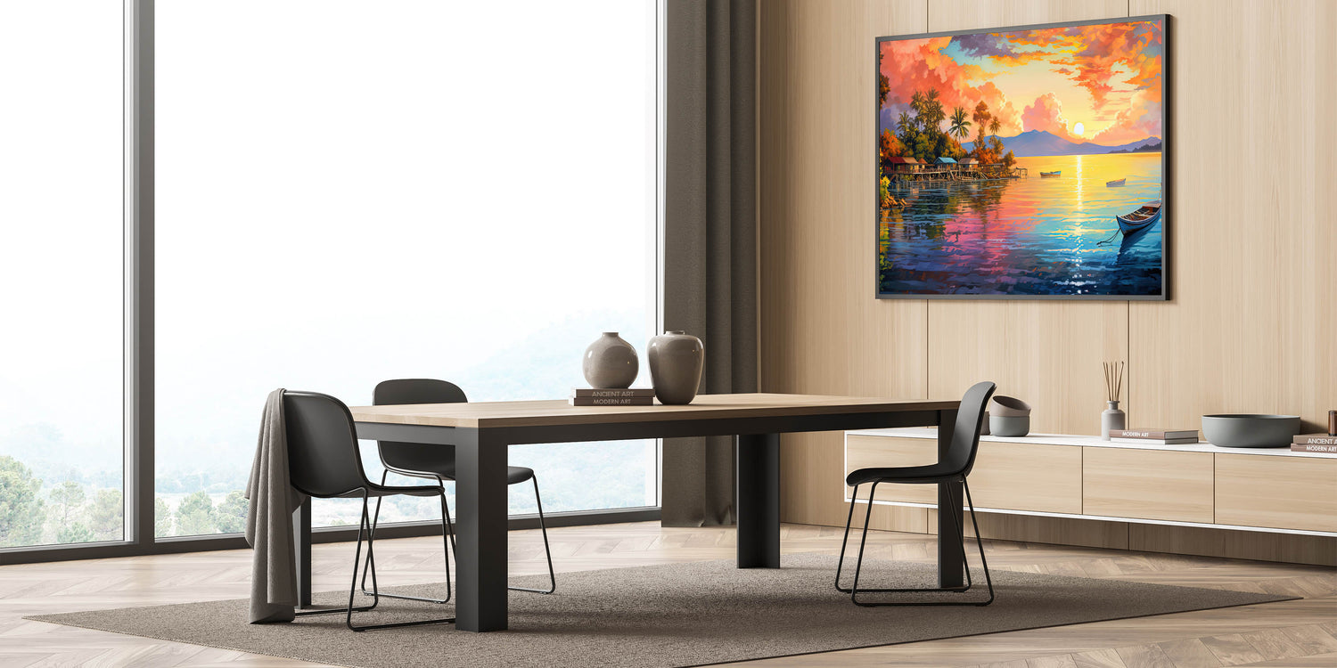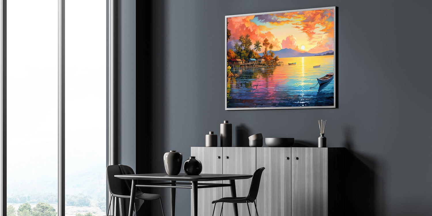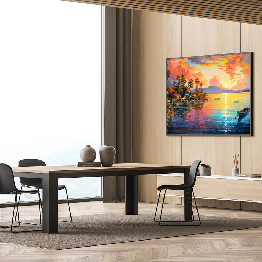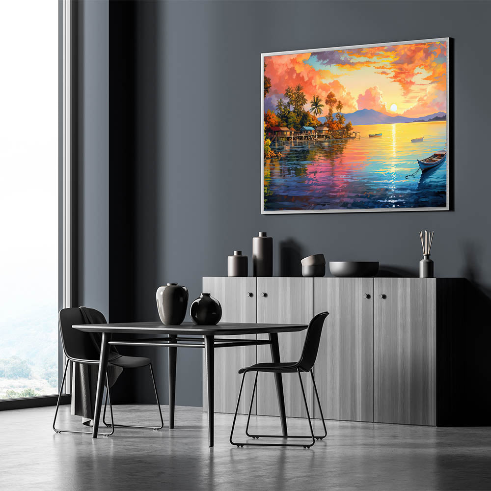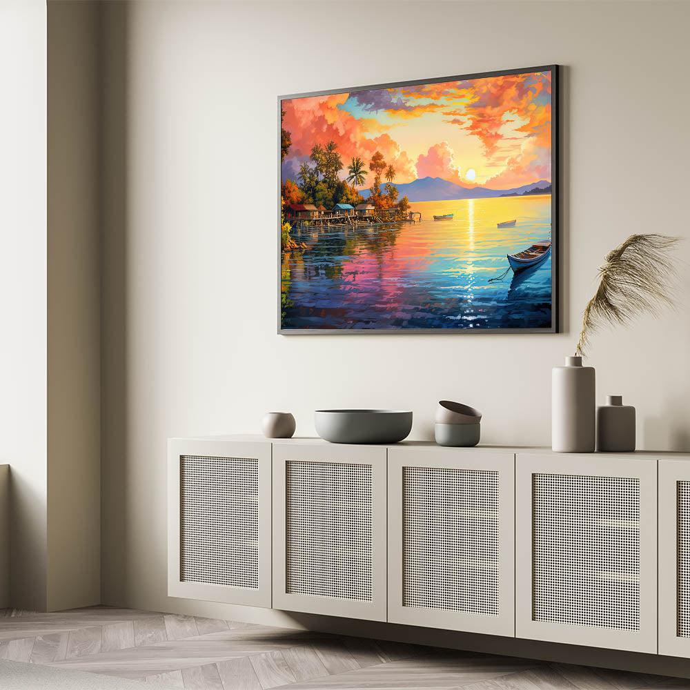Transform your space with the vibrant energy of this colorful tropical sunset village canvas. The artwork captures the radiant hues of the setting sun as it illuminates a serene coastal village, reflecting off the calm waters below. The rich palette of oranges, pinks, and blues creates a lively and inviting atmosphere, making this piece the perfect addition to any room in need of a burst of color and warmth. Whether you’re decorating a living room, bedroom, or office, this stunning coastal wall art will bring the tropical charm and beauty of an island paradise into your home.