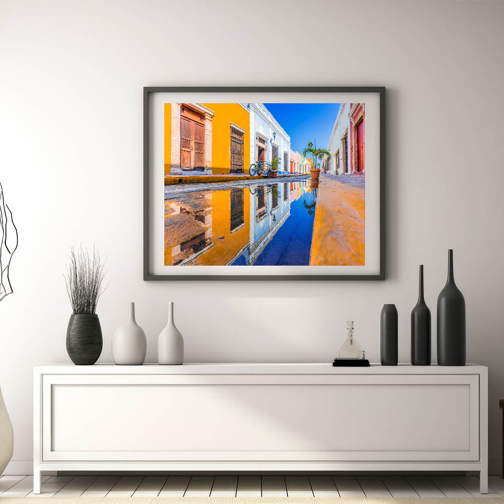 Add a pop of color to your home with this striking wall art featuring a vibrant Yucatan street scene. Captured after a rainfall, the colorful facades of historic buildings are reflected beautifully in a puddle, highlighting the charm and culture of the Yucatan Peninsula. This Yucatan canvas art piece is perfect for lovers of Mexican cultural art and those seeking bold, lively decor.