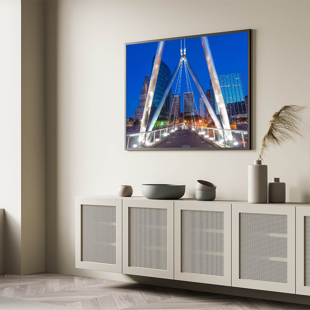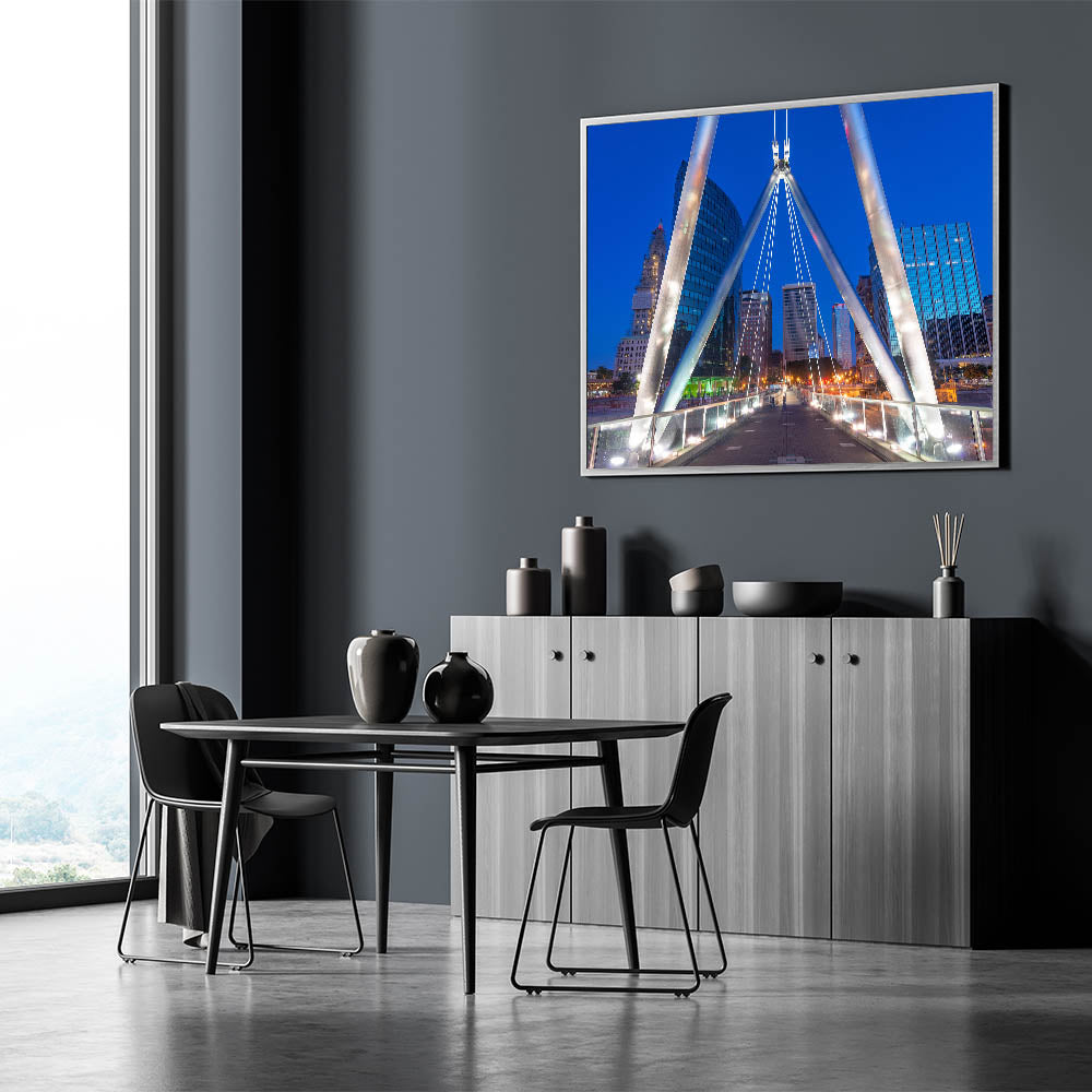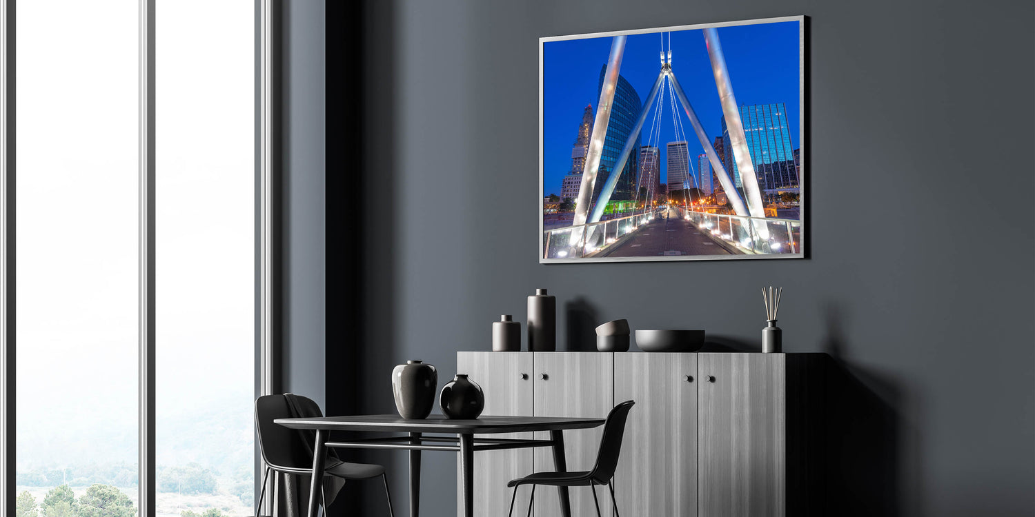 This Connecticut landscape art brings the energy and sophistication of Hartford’s cityscape into your home. Whether you’re looking for a contemporary piece of Connecticut art for home or a unique gift, this modern bridge scene will add a bold and captivating element to any room.