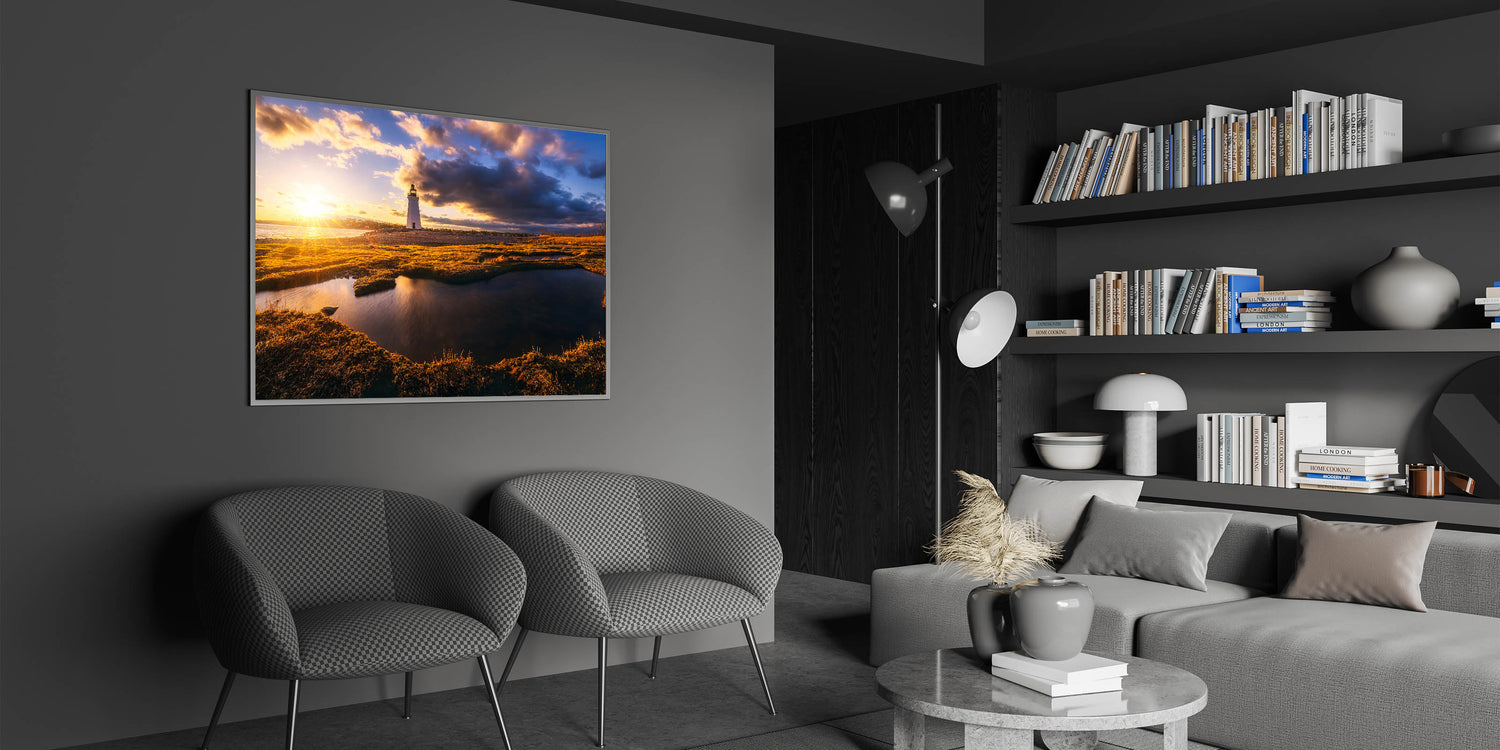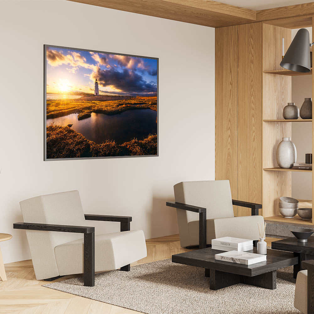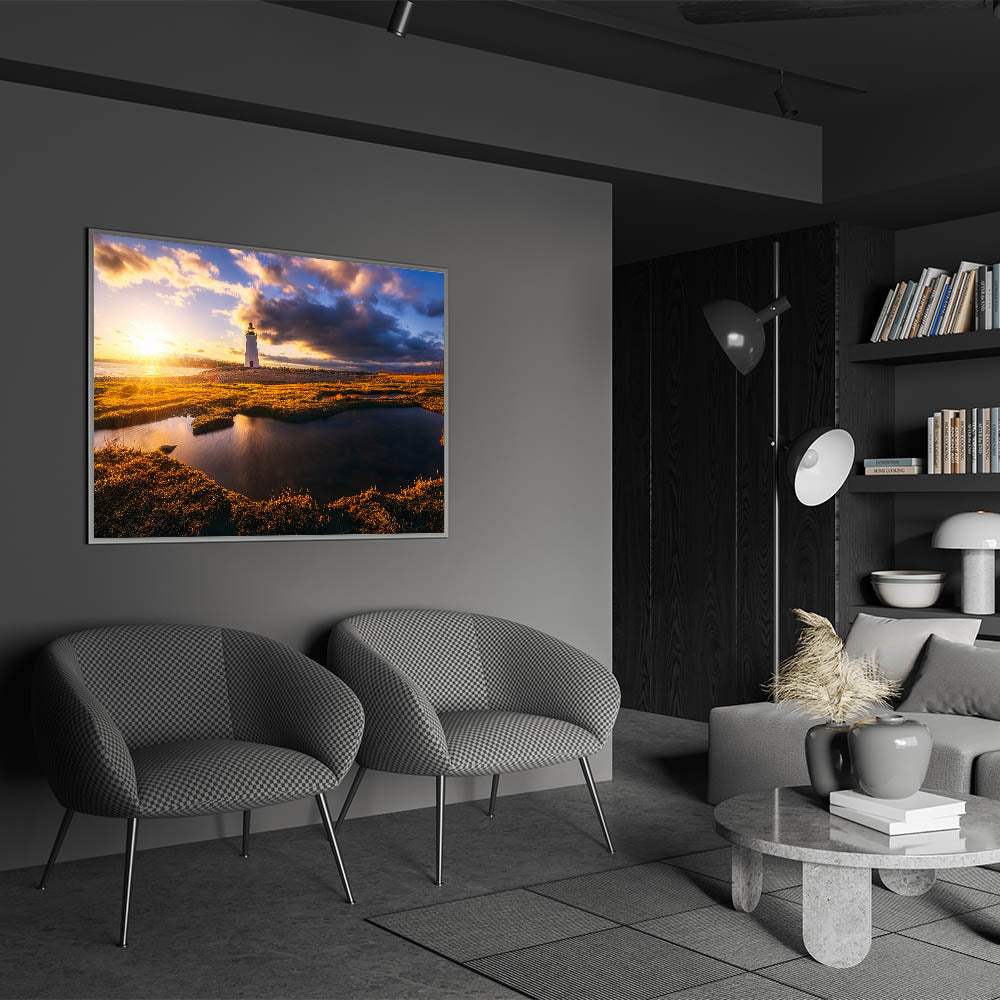 This breathtaking wall art captures the beauty of a Connecticut lighthouse at sunrise, illuminating the marshland with golden light. The warm rays of the sun stretch across the sky, creating a dramatic contrast between the bright horizon and the moody clouds. The calm waters reflect the vibrant colors of the dawn, making this Connecticut canvas art a perfect way to bring nature’s beauty into your home.