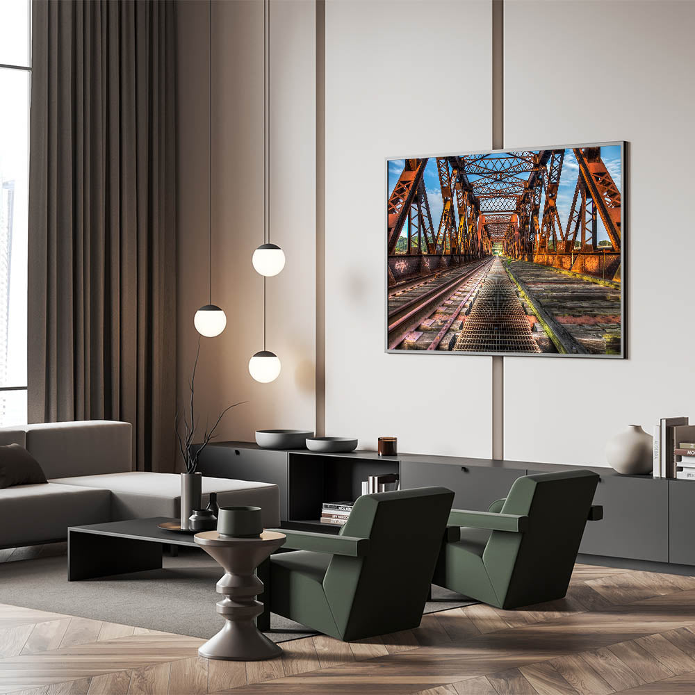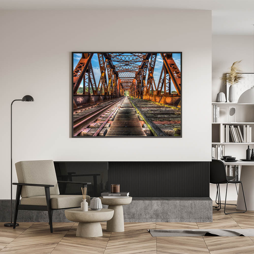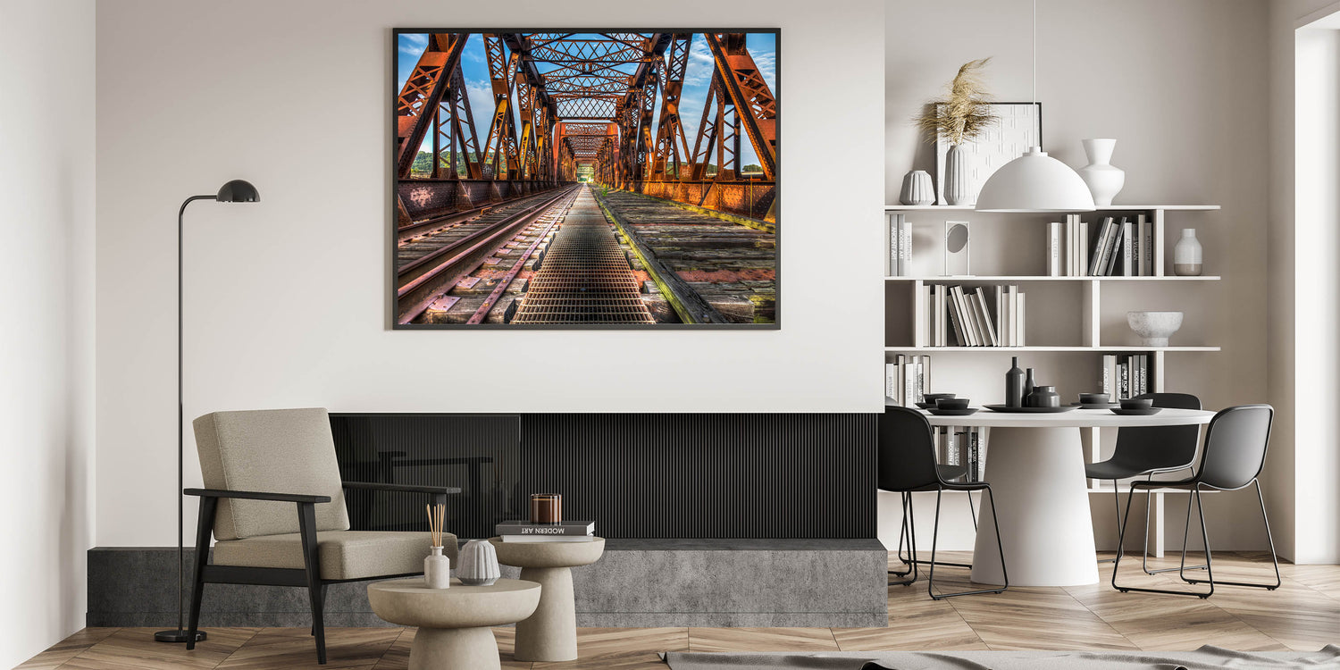 Introduce a stunning piece of Connecticut wall decor with this striking image of an iron bridge captured in vibrant detail. This iconic Connecticut scenery print features rich textures of the rusted metal juxtaposed against a crisp blue sky, making it a perfect addition to any home or office.
