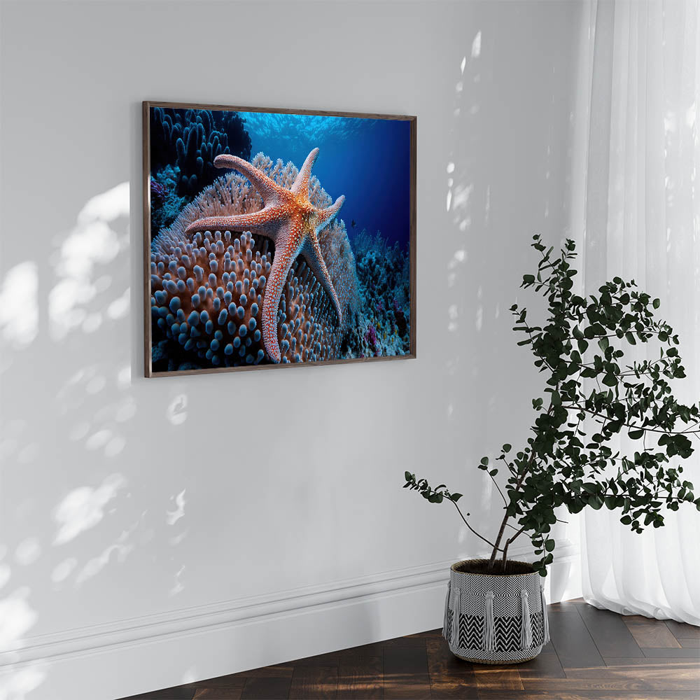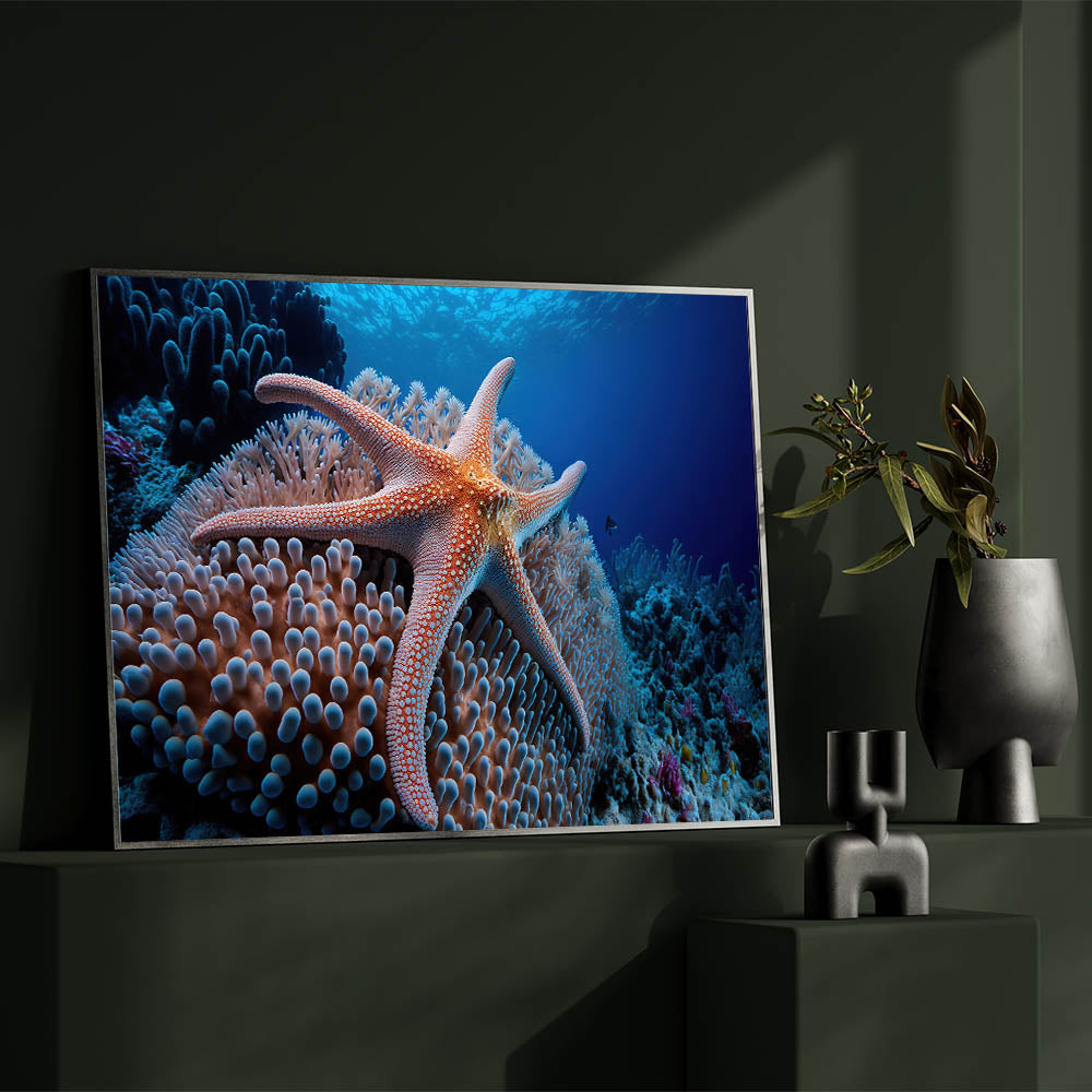 Immerse yourself in the vibrant beauty of the ocean with this stunning coral and starfish wall art. This piece captures the dynamic interplay between the colorful coral formations and the graceful starfish, creating a captivating underwater scene. Perfect for marine life enthusiasts, this artwork brings the tranquility and wonder of the ocean into your home.
