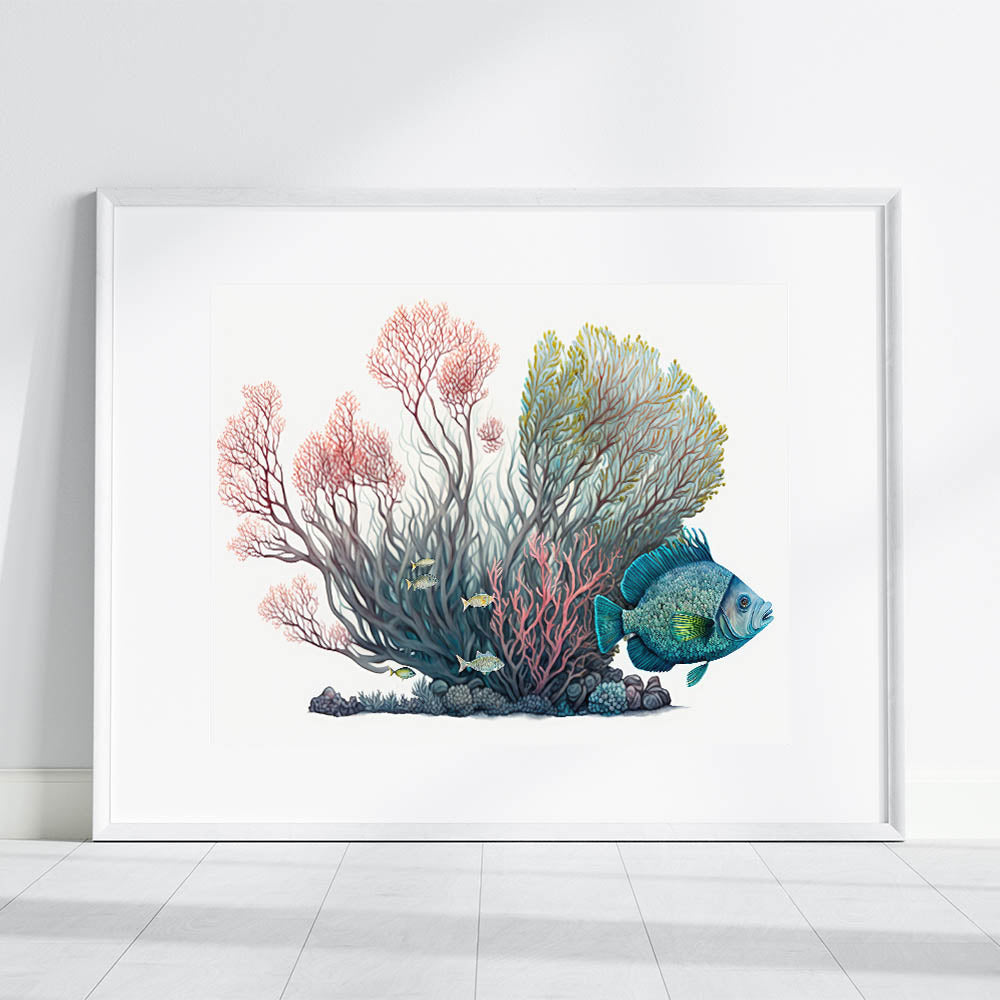 Add a splash of vibrant color and aquatic life to your space with this Coral Wall Art. This artwork features a lively underwater scene, showcasing coral reefs teeming with life and a striking fish swimming among the coral. The intricate details and rich colors make this piece a stunning focal point for any room, whether you’re decorating a coastal retreat or simply bringing a touch of the ocean to your home.