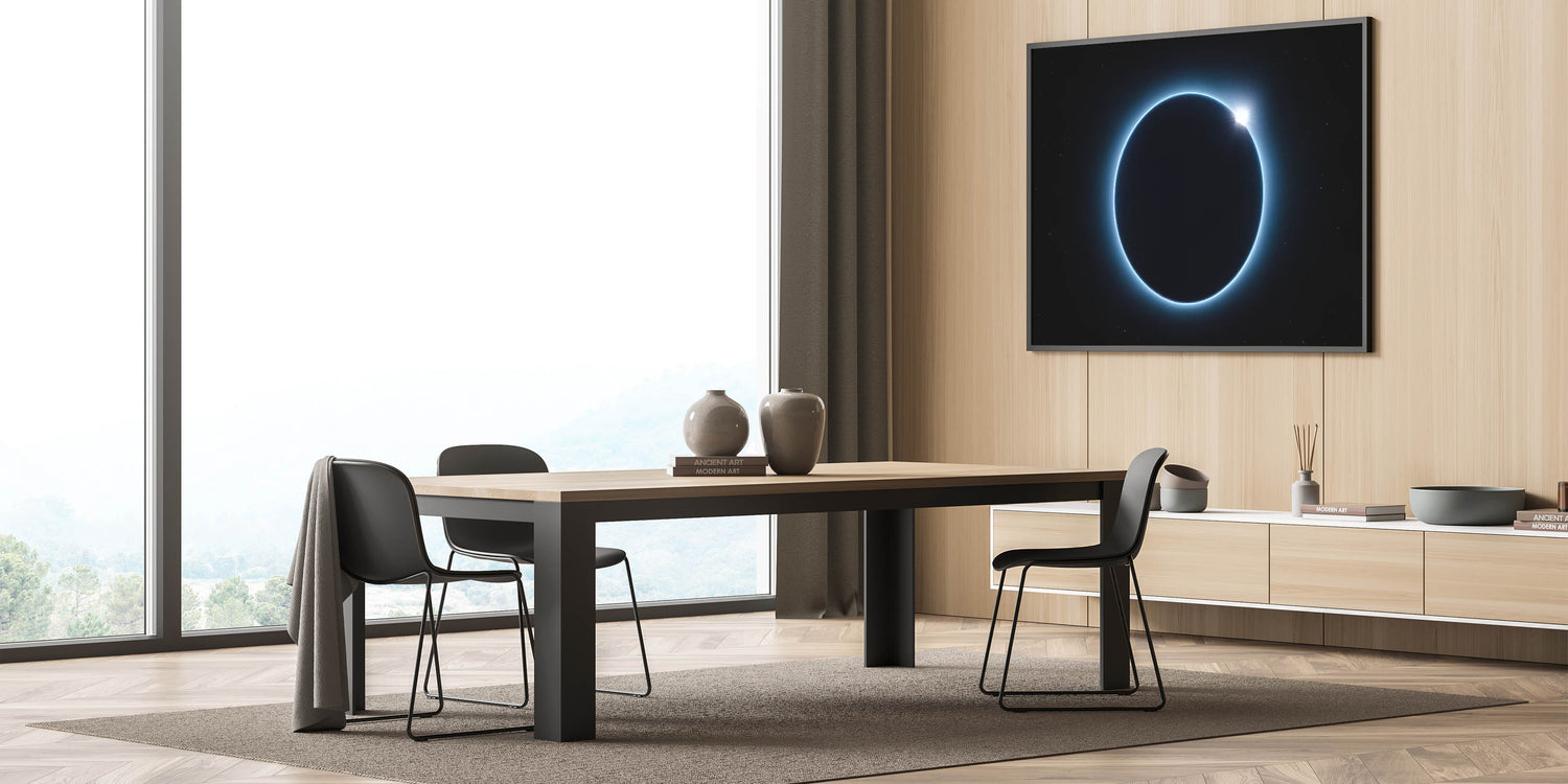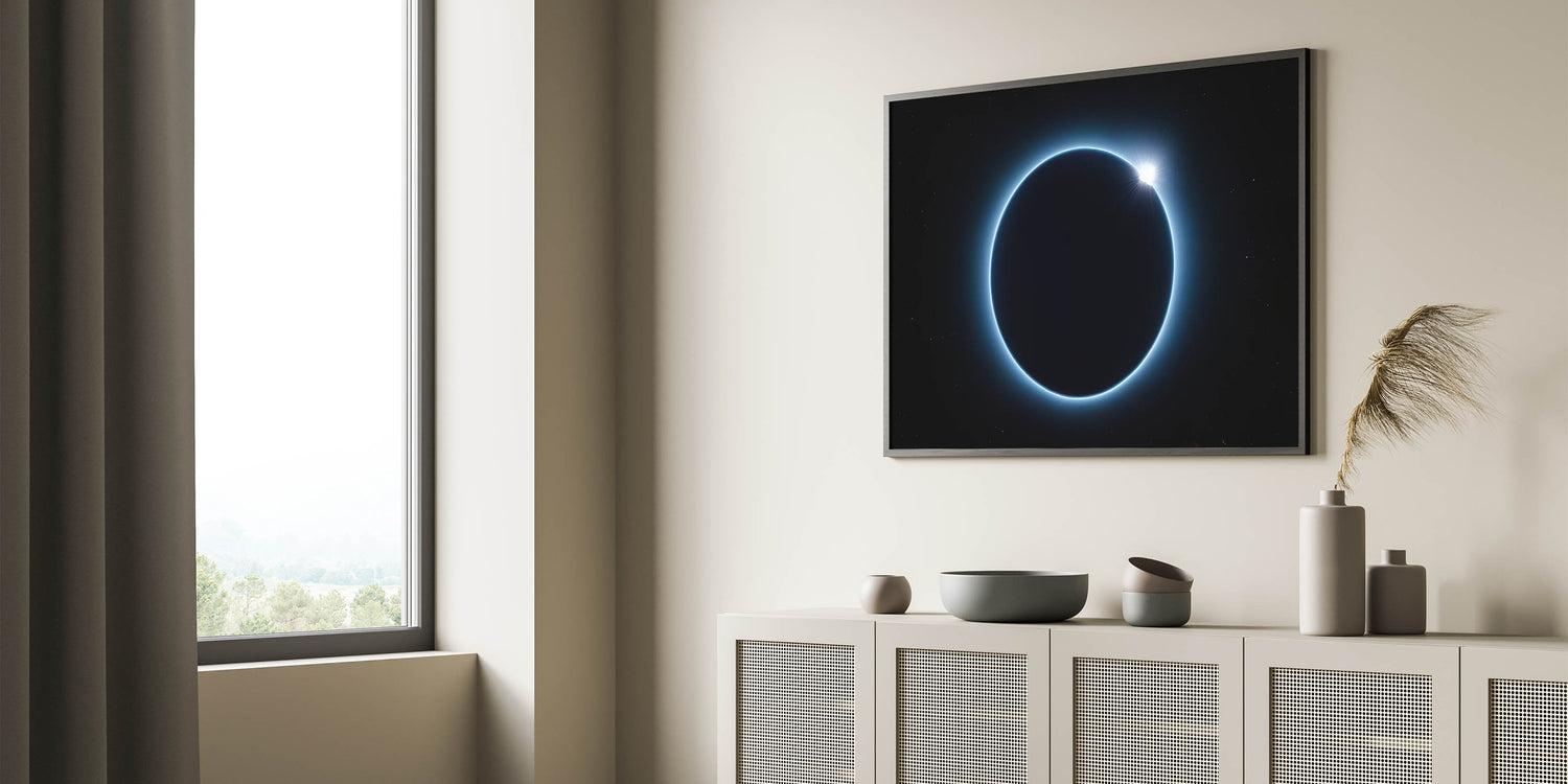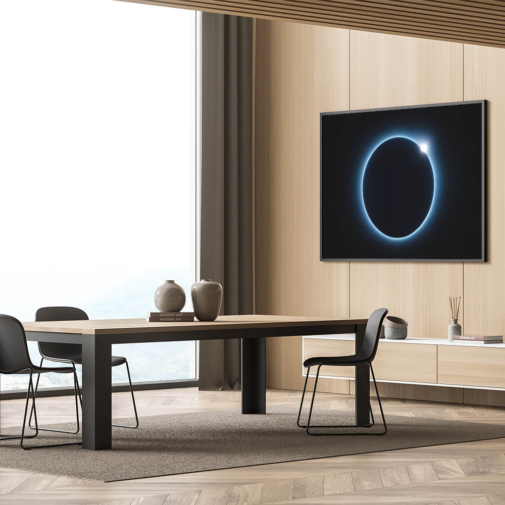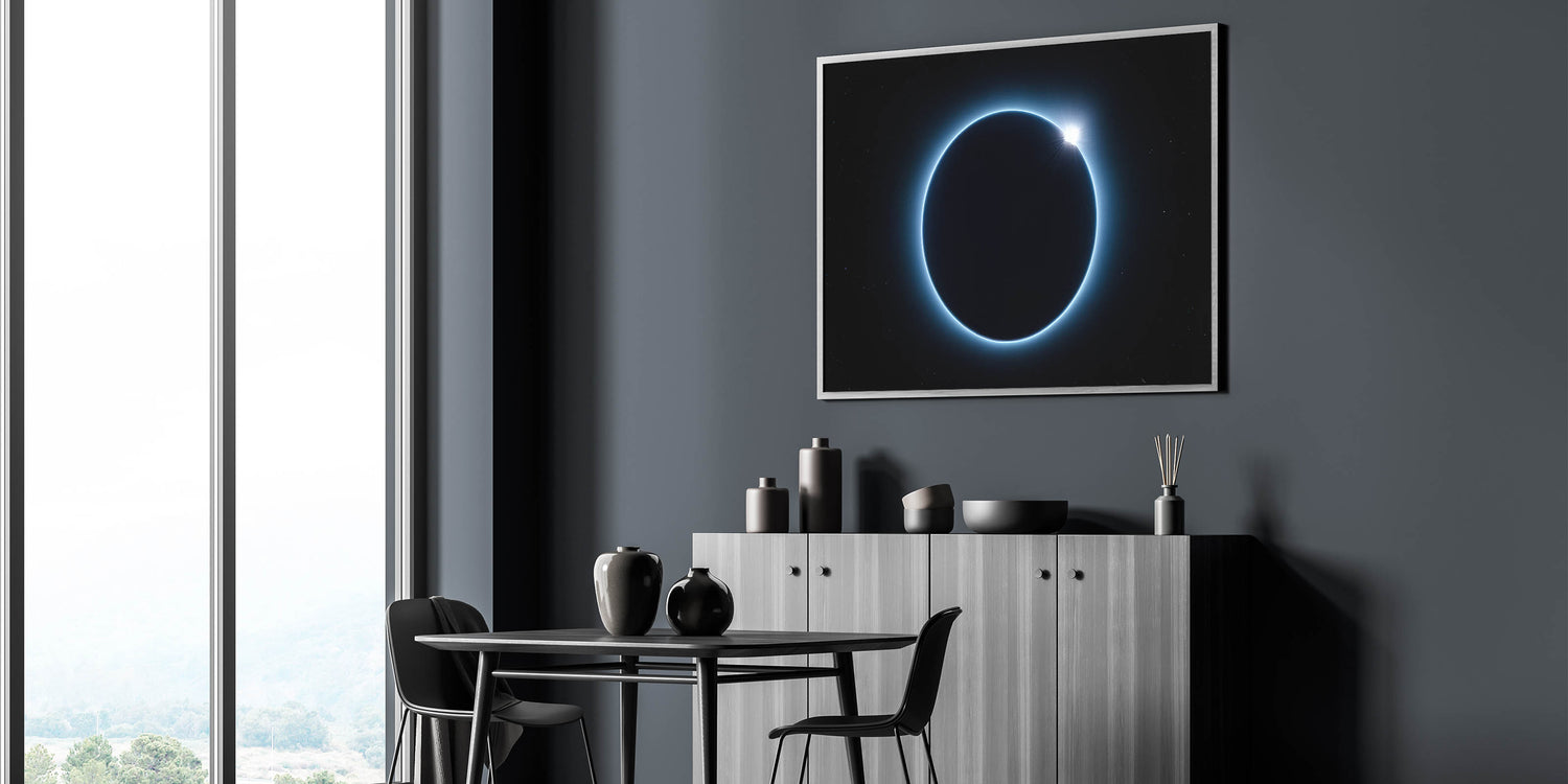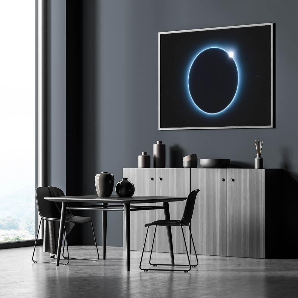 This stunning eclipse artwork makes a captivating addition to any room, blending sophistication with the intrigue of the universe. Whether you're a space enthusiast or simply want a unique piece of decor, this wall art adds a touch of mystery and beauty to any space. Bring the wonder of the solar system into your home with this eclipse canvas print.