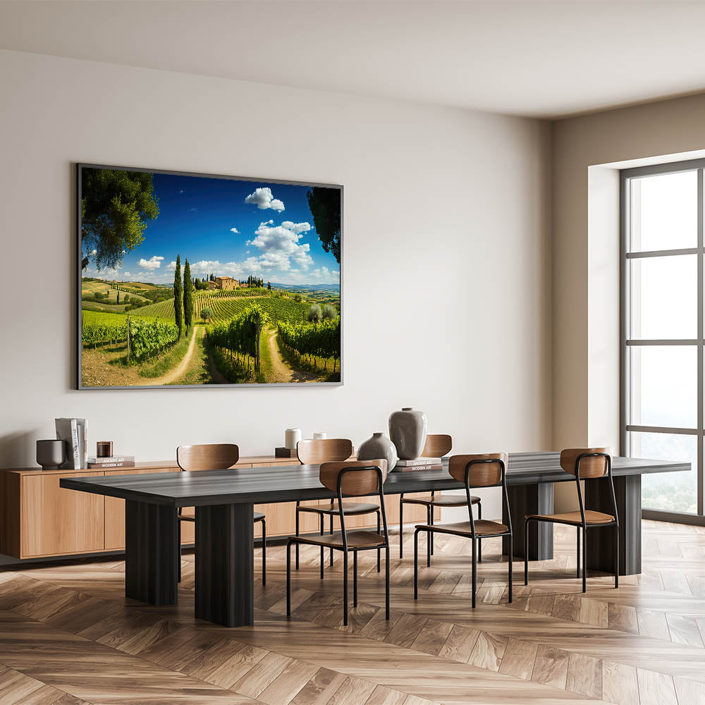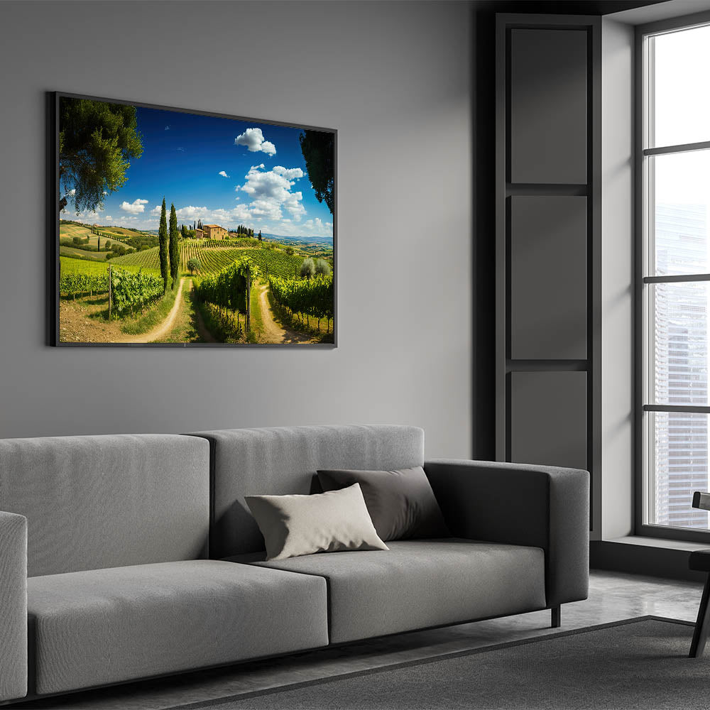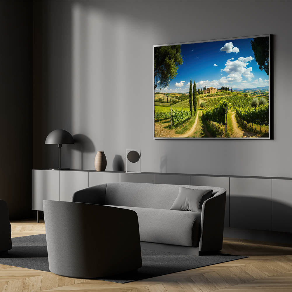 Immerse yourself in the idyllic charm of the countryside with this breathtaking wall art featuring a picturesque vineyard under a clear blue sky. The winding paths and lush green vines evoke a sense of peace and tranquility, making this artwork a perfect addition to any room that needs a touch of nature’s beauty. The vibrant colors and detailed scenery capture the essence of rural life, transporting you to a serene world of rolling hills and sun-kissed landscapes.