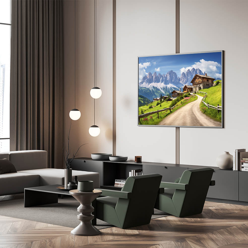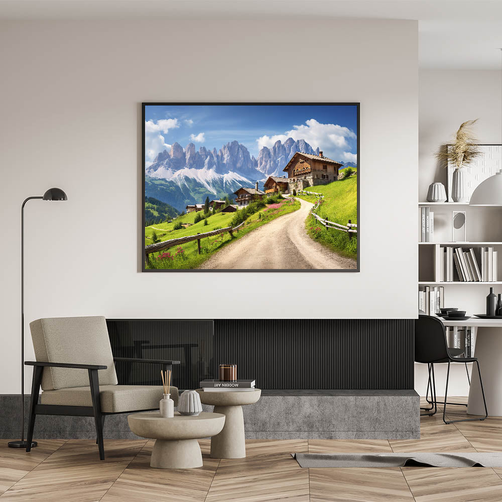 Step into the tranquil beauty of a mountain village with this stunning countryside wall art. This piece showcases charming rustic homes nestled among vibrant green hills, with majestic snow-capped peaks towering in the background. The vivid colors and detailed composition bring the serenity of rural life into your home, making it a perfect addition to any space that needs a touch of nature’s beauty.