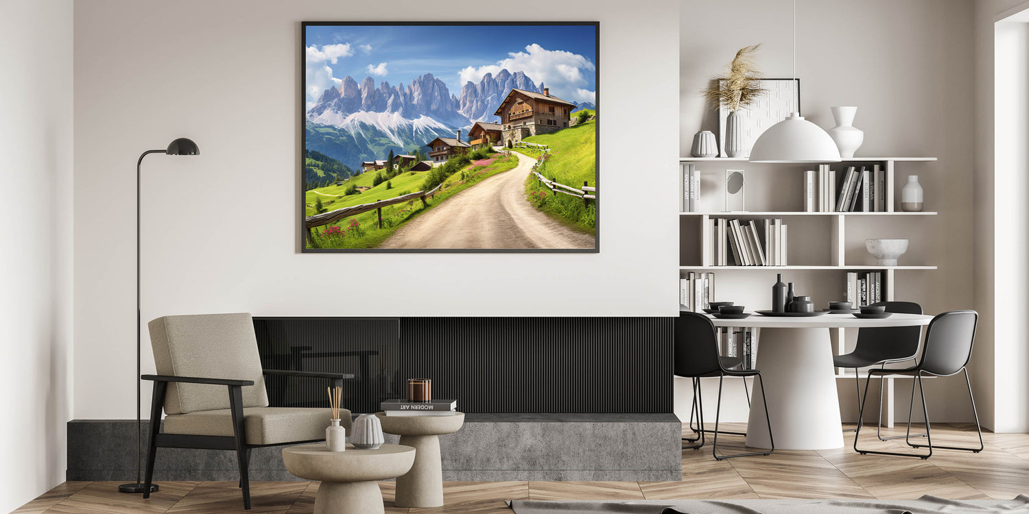 - Vivid Imagery: The lush greens, clear blues, and rustic wooden homes create a captivating scene that adds warmth and charm to any room.