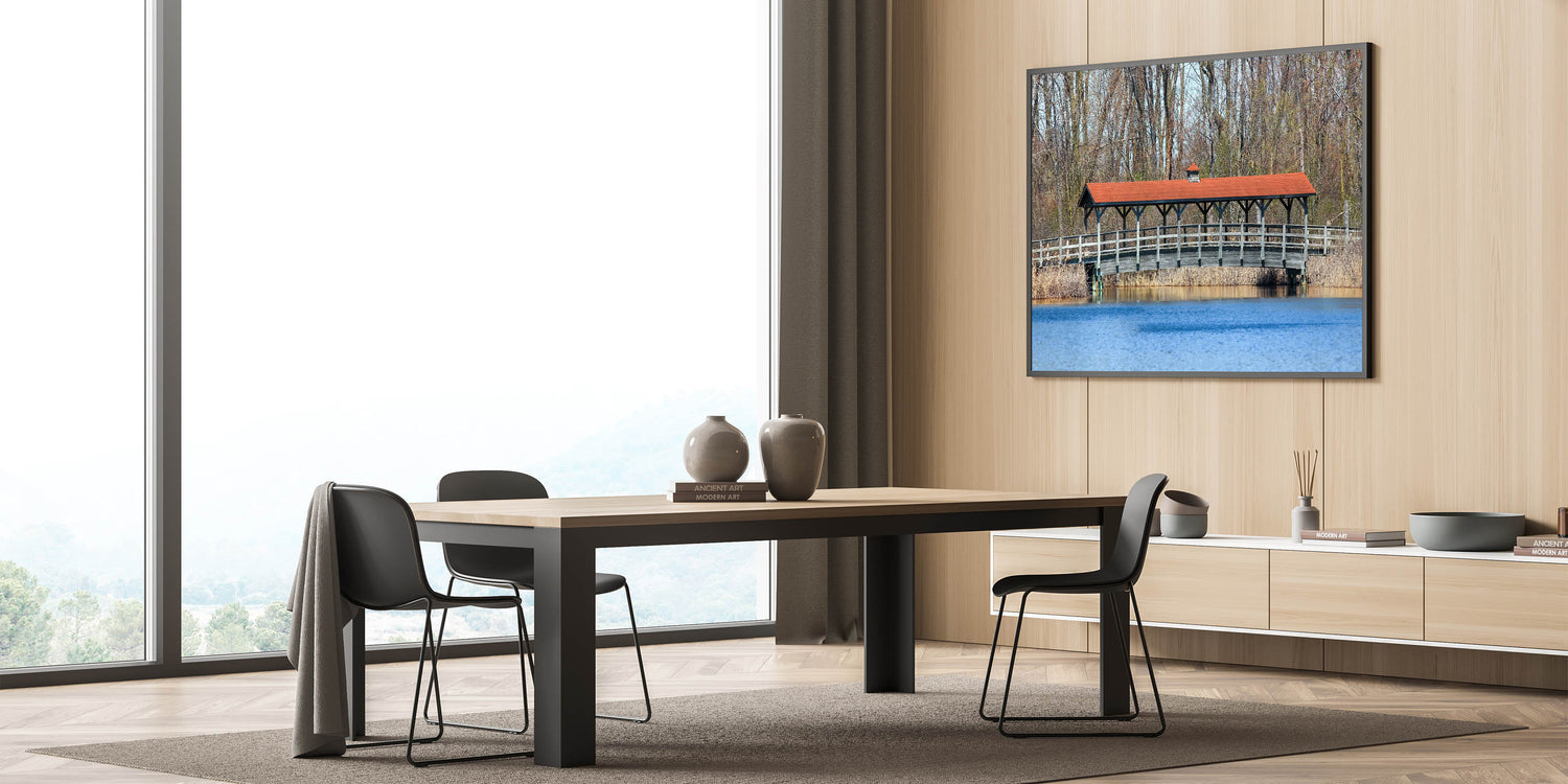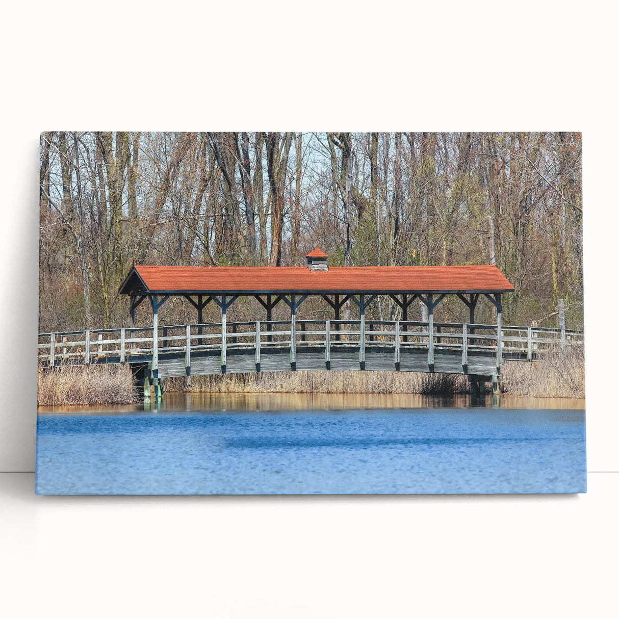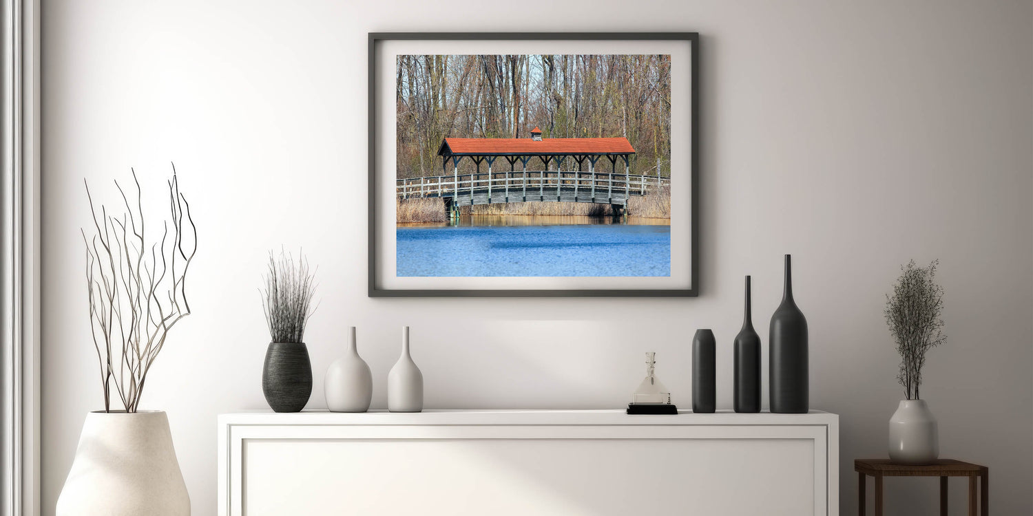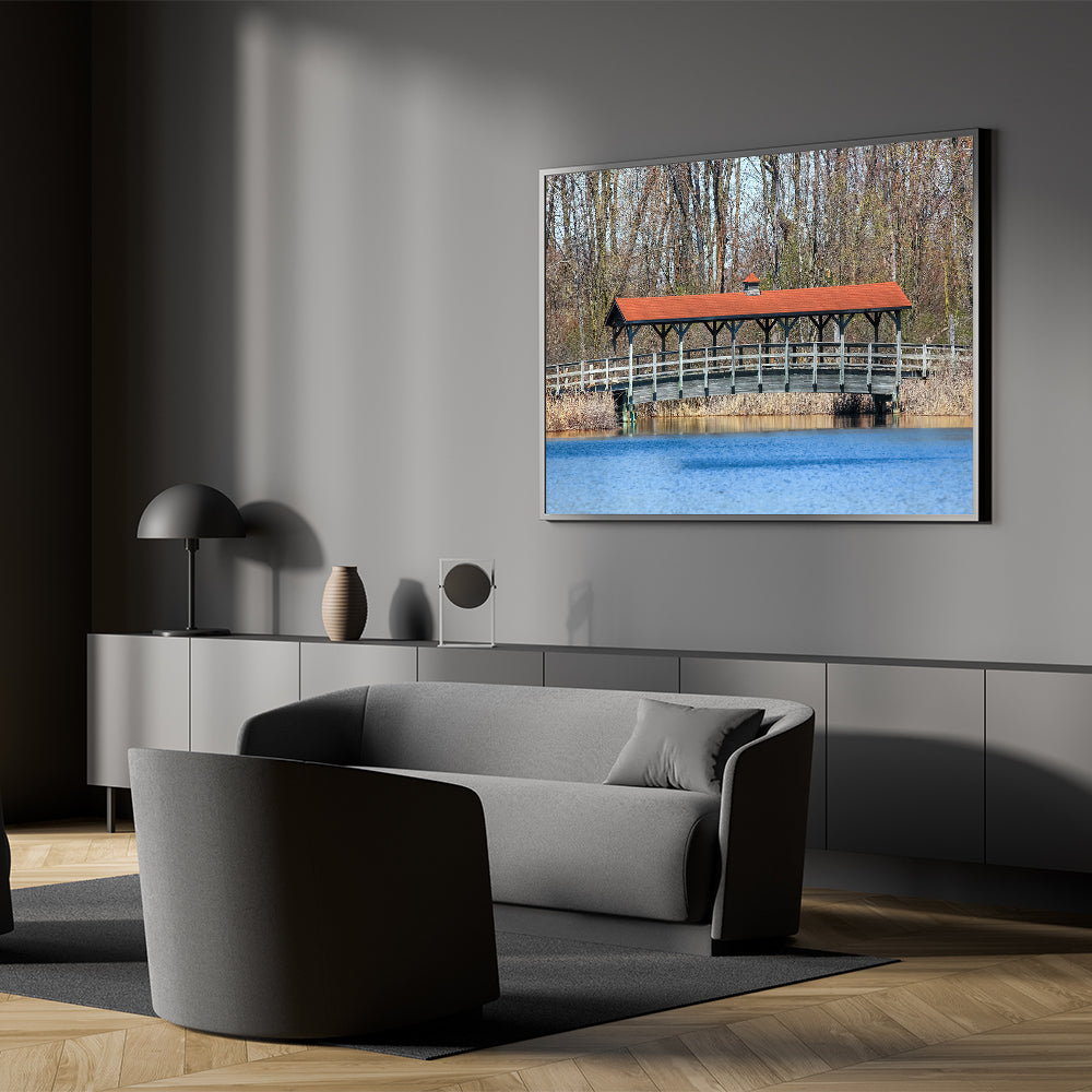 Covered Bridge Wall Art – Tranquil Lake Scene Canvas & Framed Prints