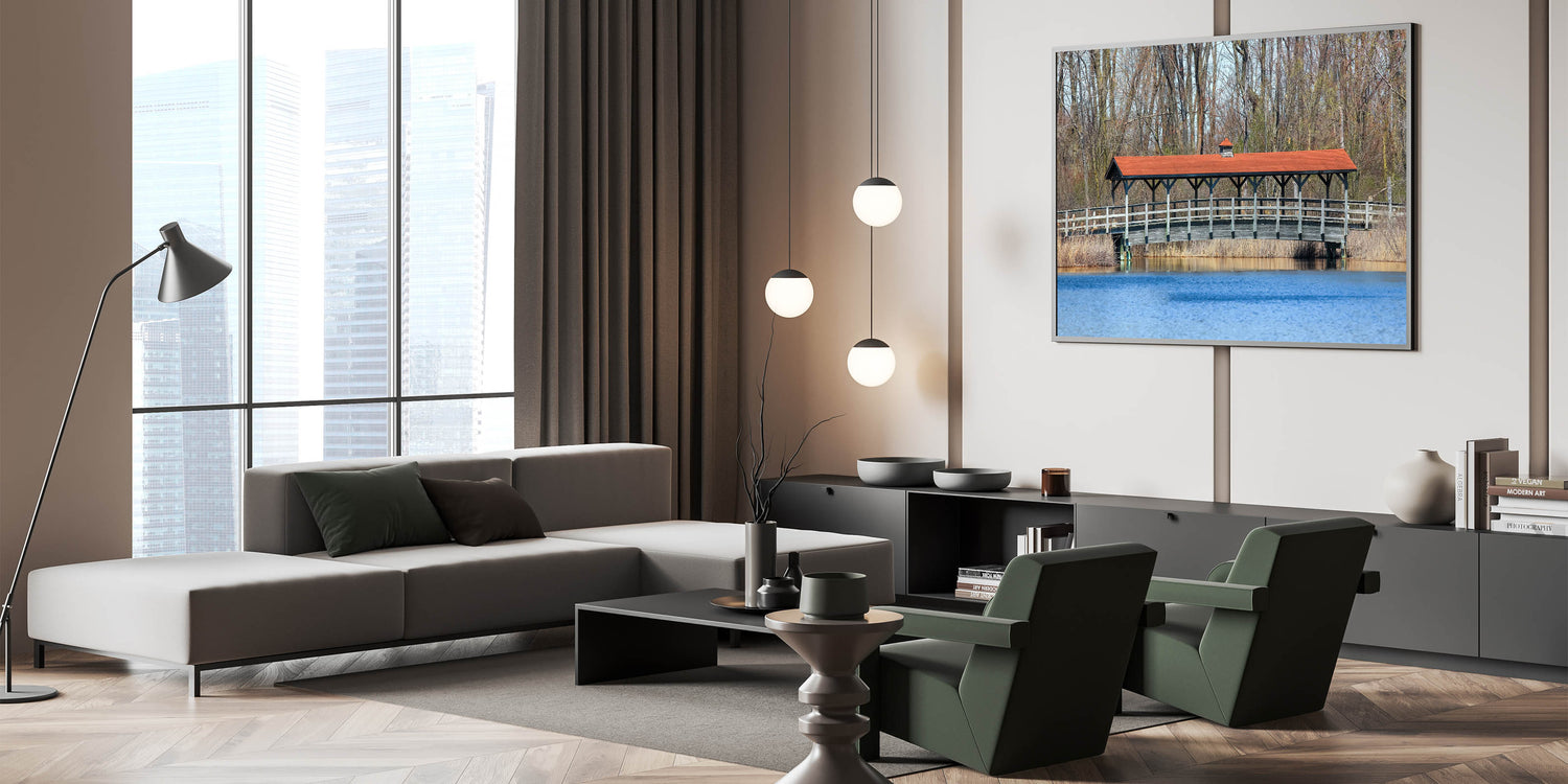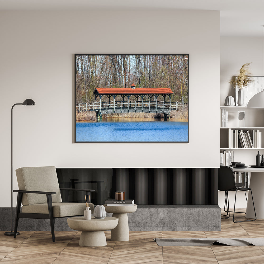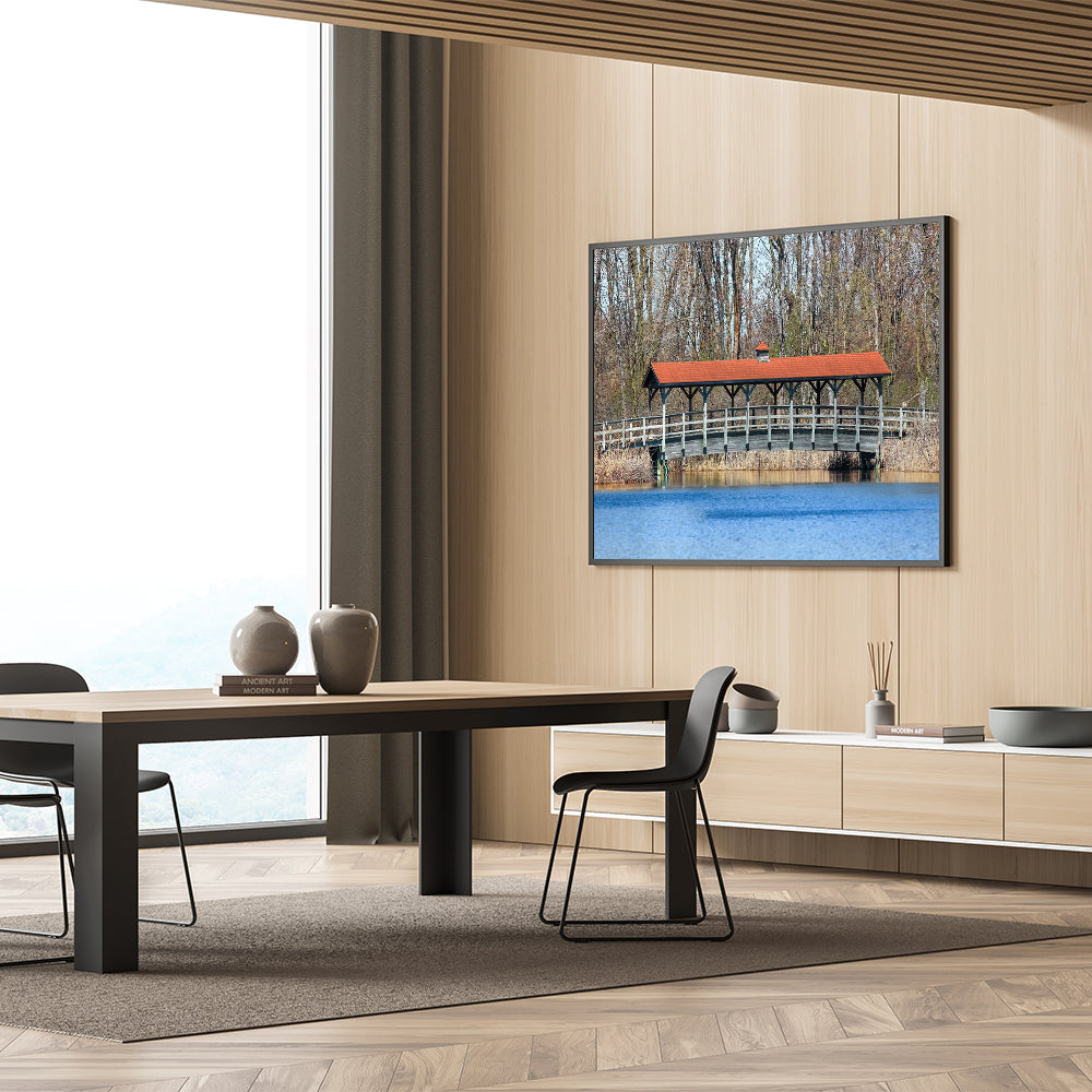 Enhance your home decor with this serene covered bridge wall art, featuring a picturesque scene of a rustic bridge over a tranquil lake. The peaceful setting, with its calm water and natural surroundings, creates a soothing atmosphere perfect for any room. This piece captures the simplicity and beauty of countryside living, offering a timeless look for your space. Whether you're decorating your living room, bedroom, or office, this artwork brings the outdoors inside.