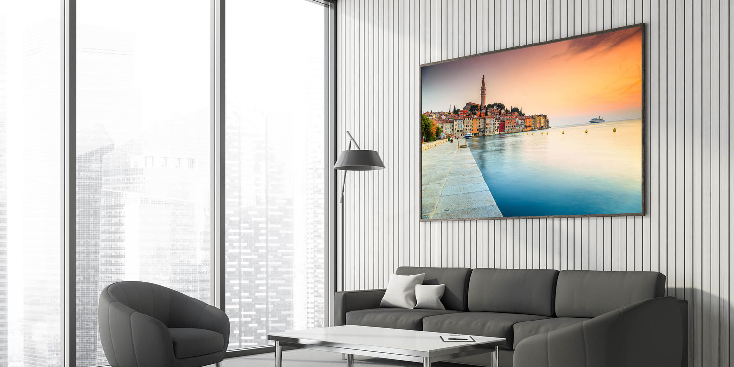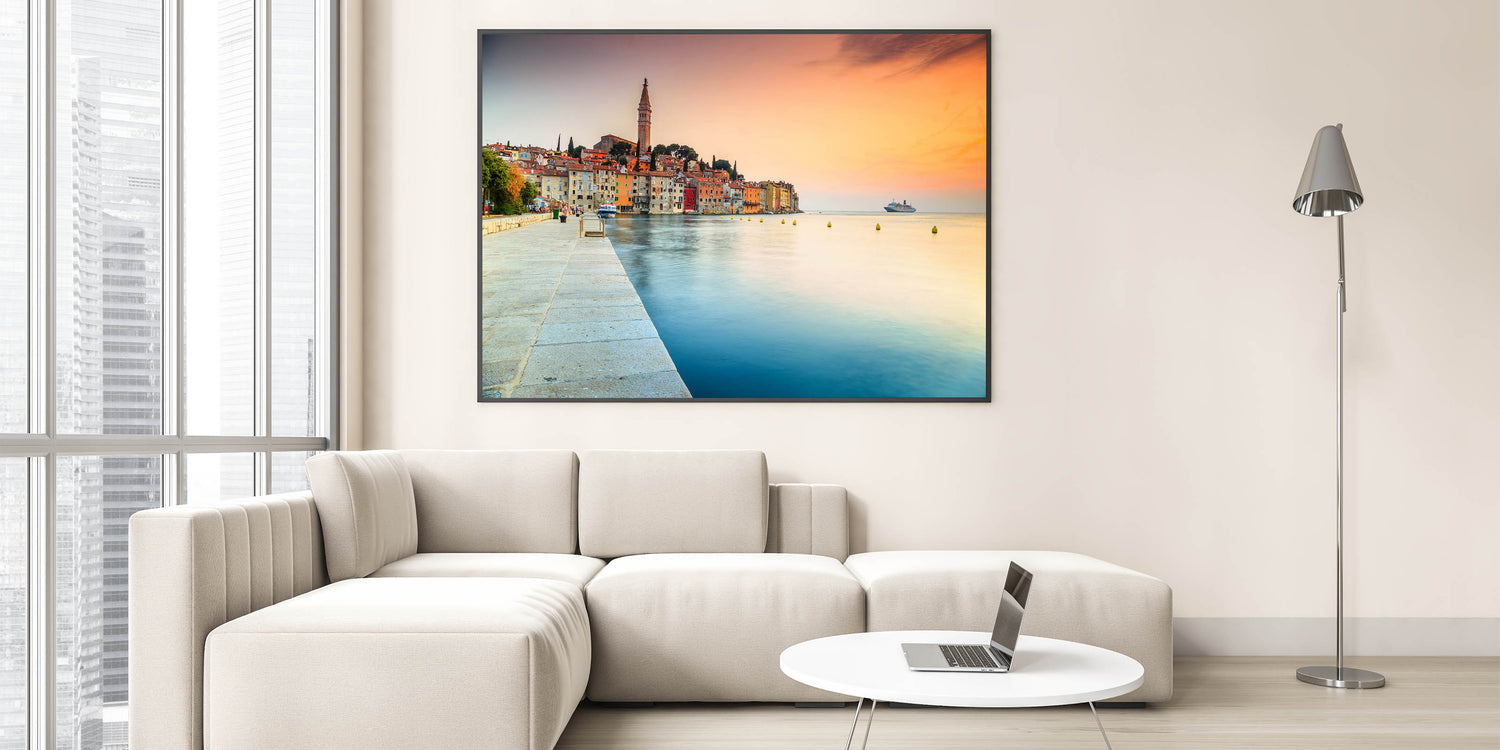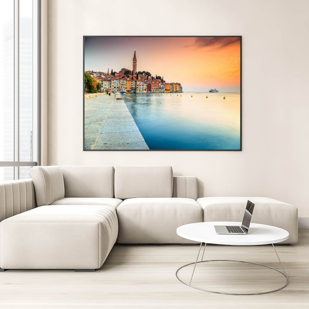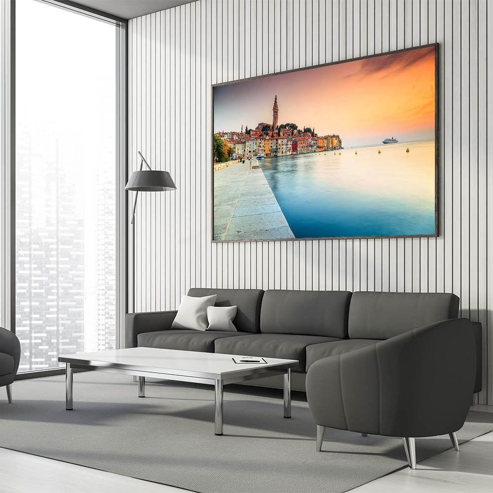 Introducing the "Croatian Landscape Art - Rovinj Waterfront Sunset Print," a breathtaking portrayal of Rovinj's vibrant waterfront as the sun sets, casting a warm glow over the historic town. This canvas print captures the essence of Croatian beauty and the tranquil ambiance of the Adriatic coast.