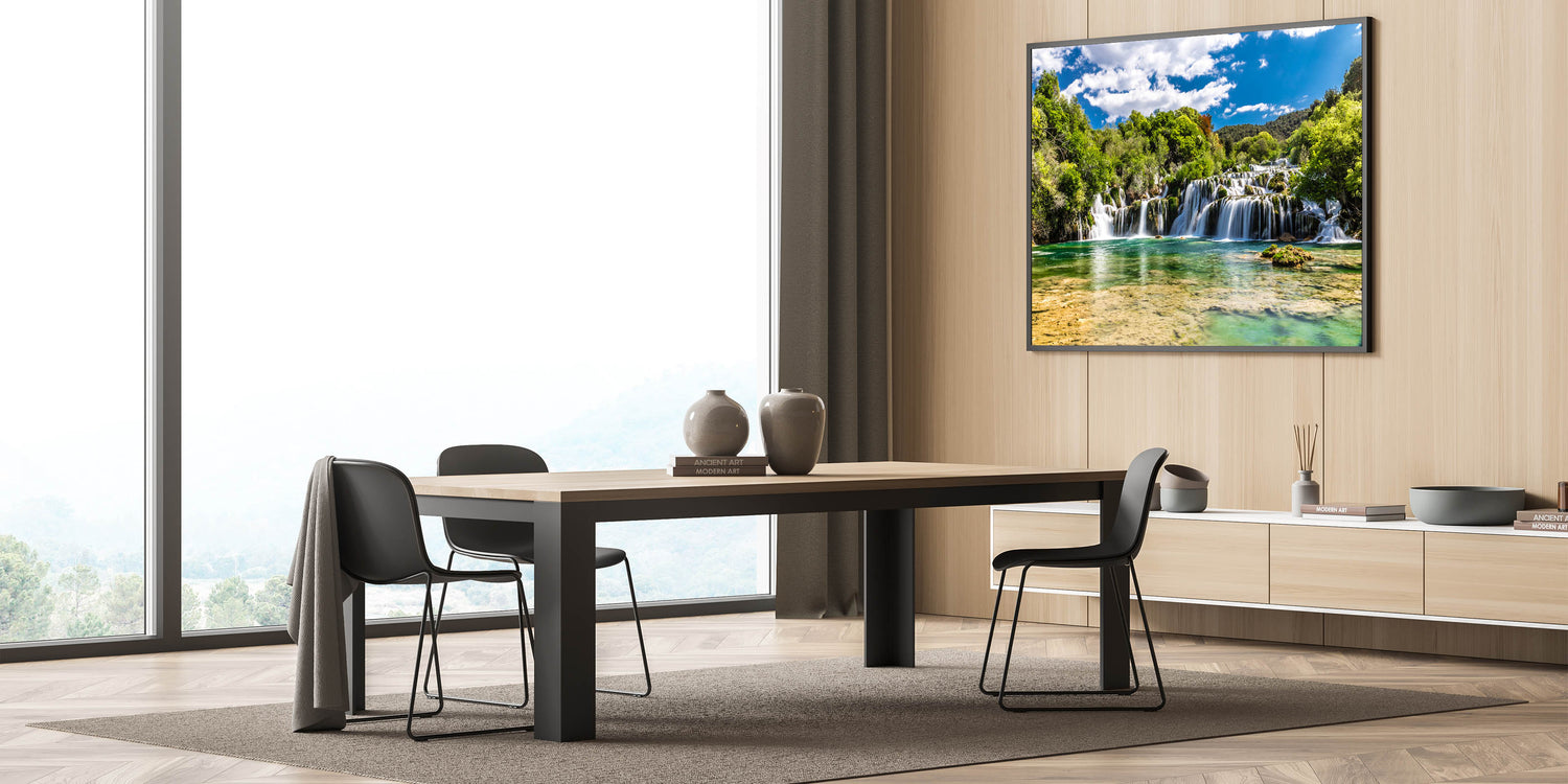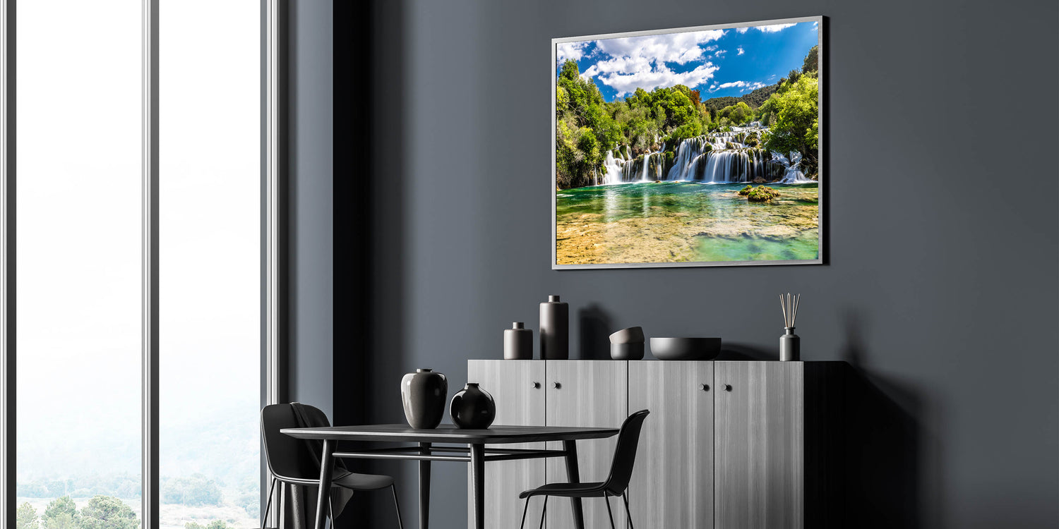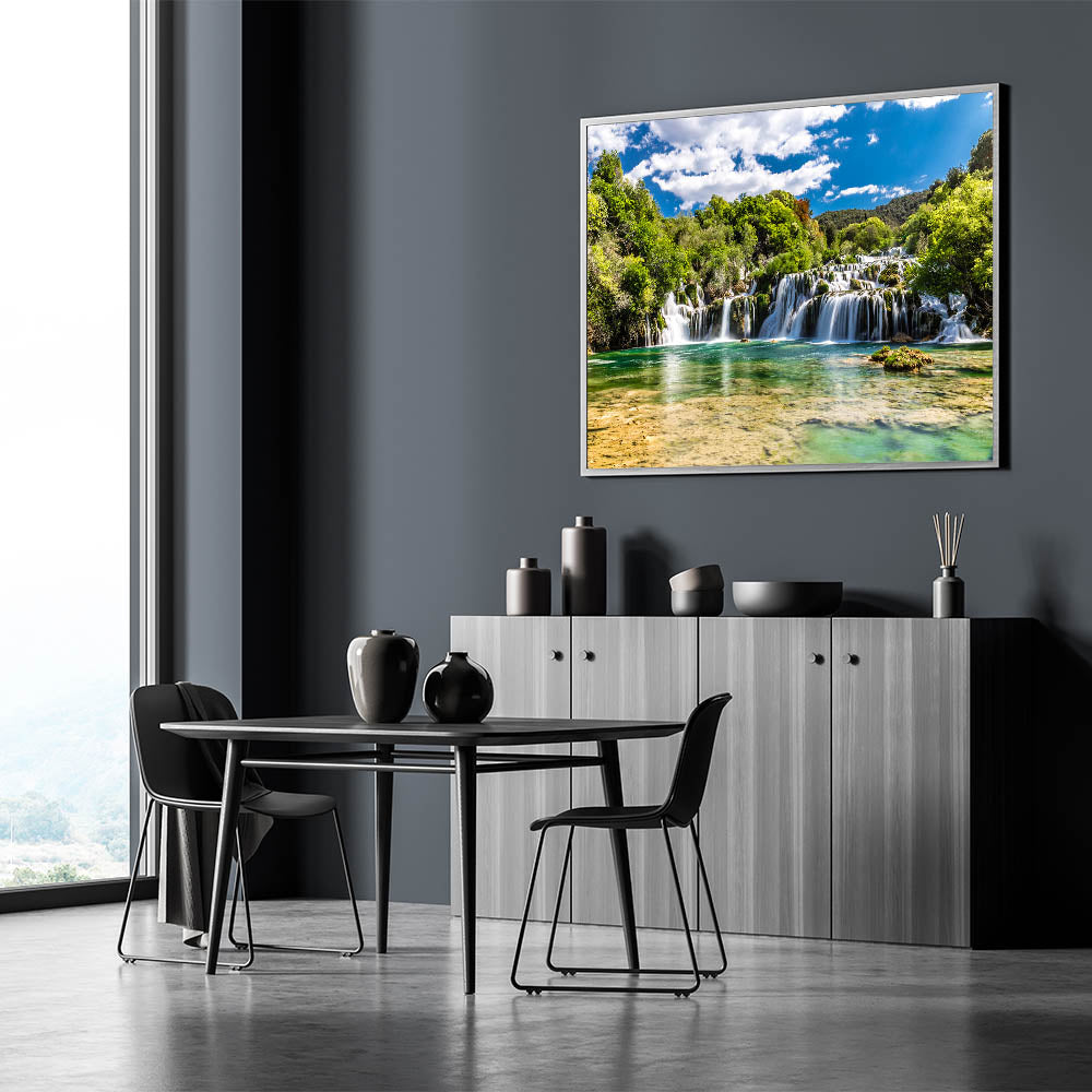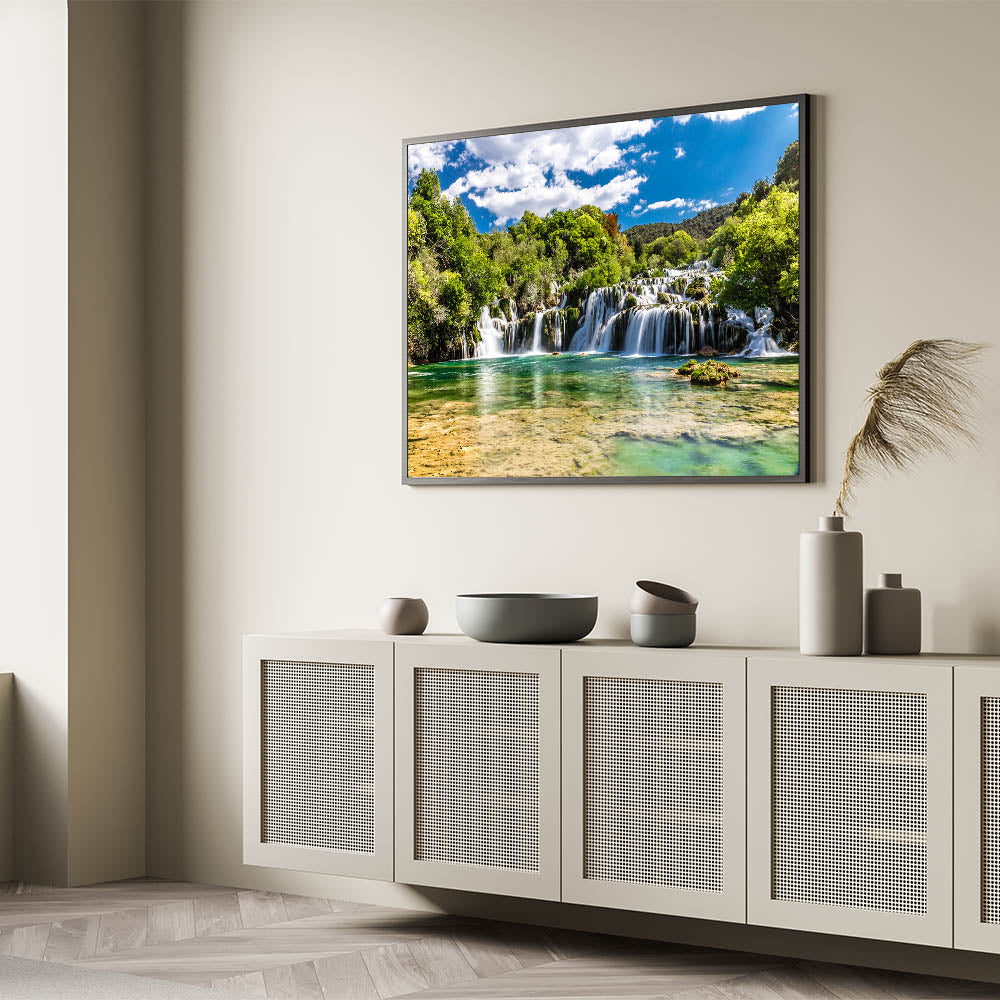 Introducing "Croatian Nature Art - Tranquil Waterfall Landscape Print," a stunning depiction of Croatia’s natural splendor. This canvas captures the serene beauty of one of Croatia's majestic waterfalls, nestled amidst lush greenery under a clear blue sky.