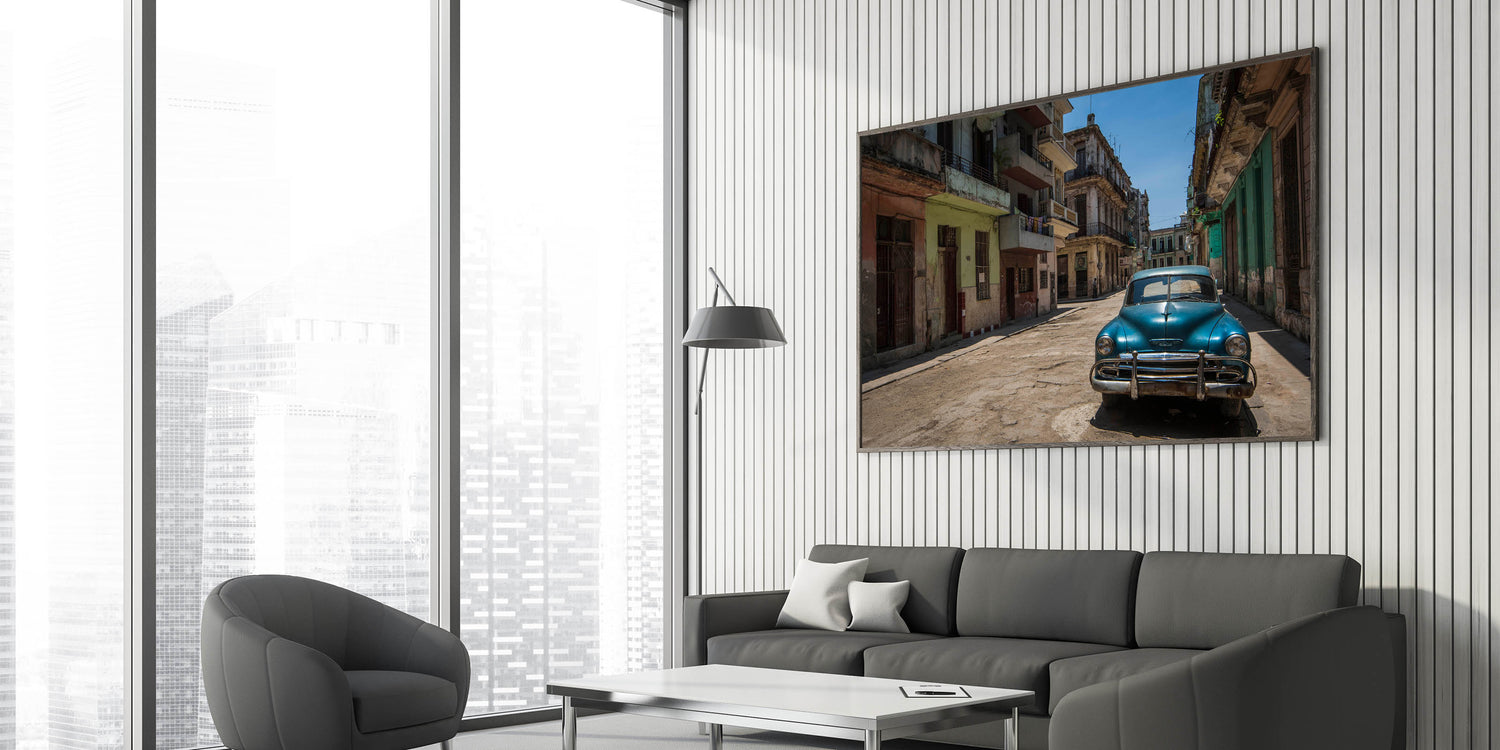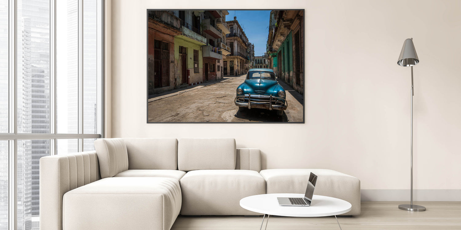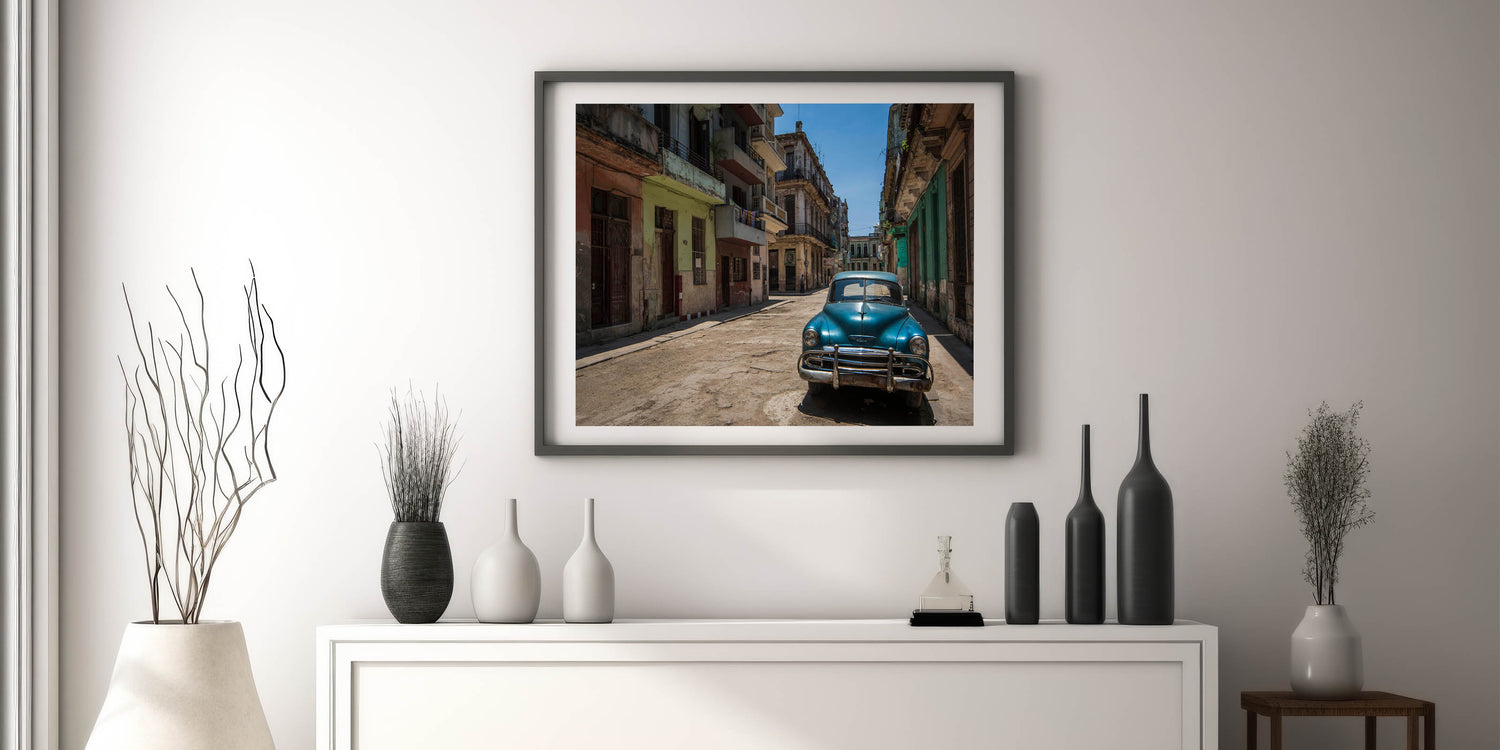 Step into the heart of Havana with this evocative Cuban Scenery Print featuring a classic car parked along the charming, timeworn streets of the city. The rustic buildings and vintage automobile capture the authentic spirit of Cuban culture, offering a glimpse into the rich heritage and everyday life of Cuba. This artwork is ideal for anyone looking to bring the vibrant energy of Cuban cityscape paintings into their home or office.