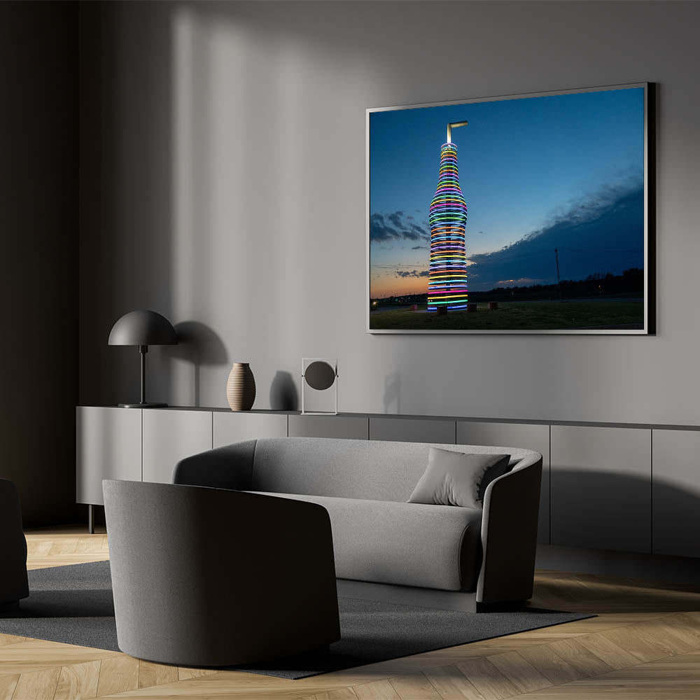 - High-quality Oklahoma scenic prints featuring the iconic Route 66 neon bottle sculpture
