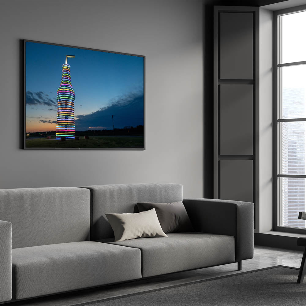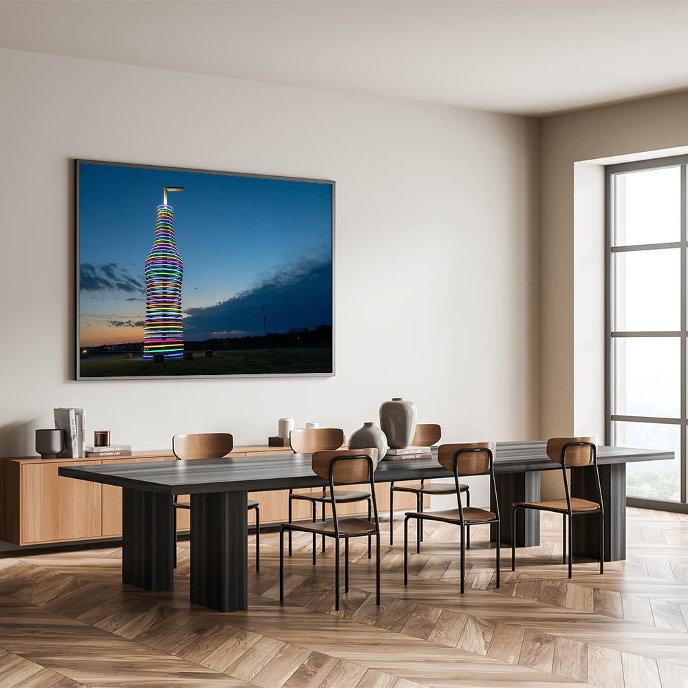 Add a touch of Oklahoma’s iconic Route 66 to your space with this vibrant wall art. Featuring the famous neon bottle sculpture illuminated against a dark evening sky, this artwork perfectly captures the colorful charm and nostalgic allure of Route 66. The striking contrast between the neon lights and the night backdrop makes this piece stand out, ideal for anyone who loves Oklahoma’s historic landmarks and the playful spirit of the open road. Available in various formats, including stretched canvas, framed prints, and acrylic glass, this Oklahoma scenic print is perfect for home or office decor.