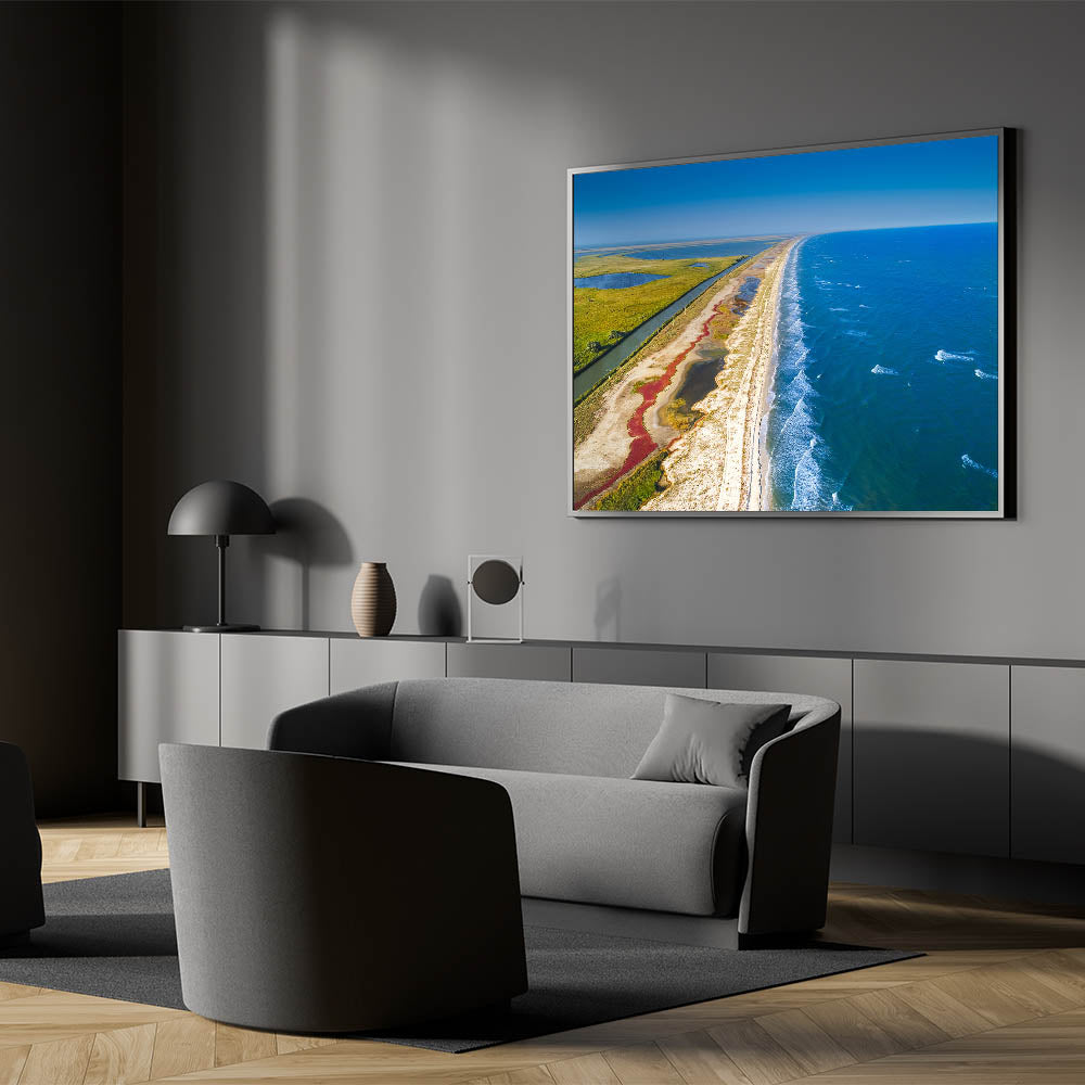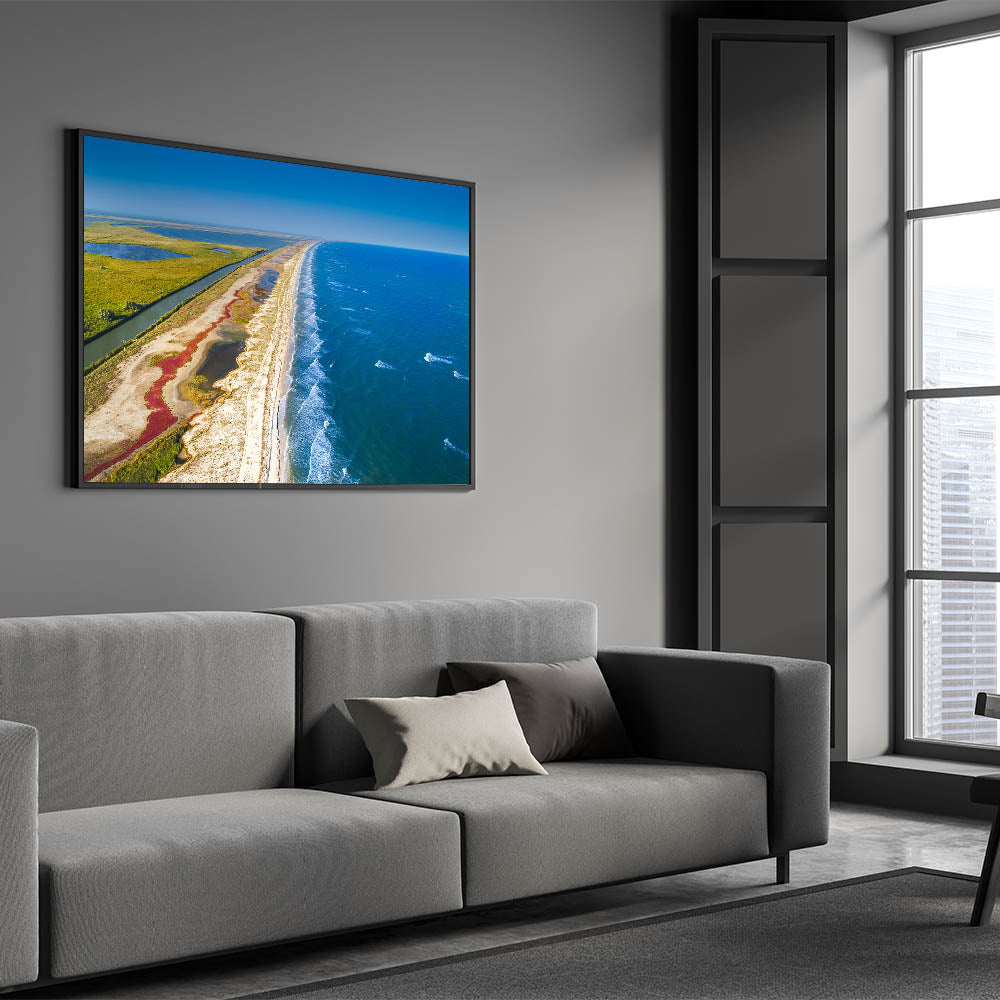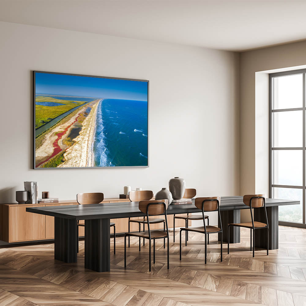 Immerse yourself in the natural beauty of Romania’s Danube Delta with this breathtaking aerial view of the coastline and marshlands. The striking contrast between the vibrant blue sea and the lush green wetlands creates a serene and harmonious composition, perfect for adding a calming and scenic touch to any room. This unique photograph captures the untouched beauty of one of Europe’s most biodiverse regions, where land meets water in an awe-inspiring display of nature.