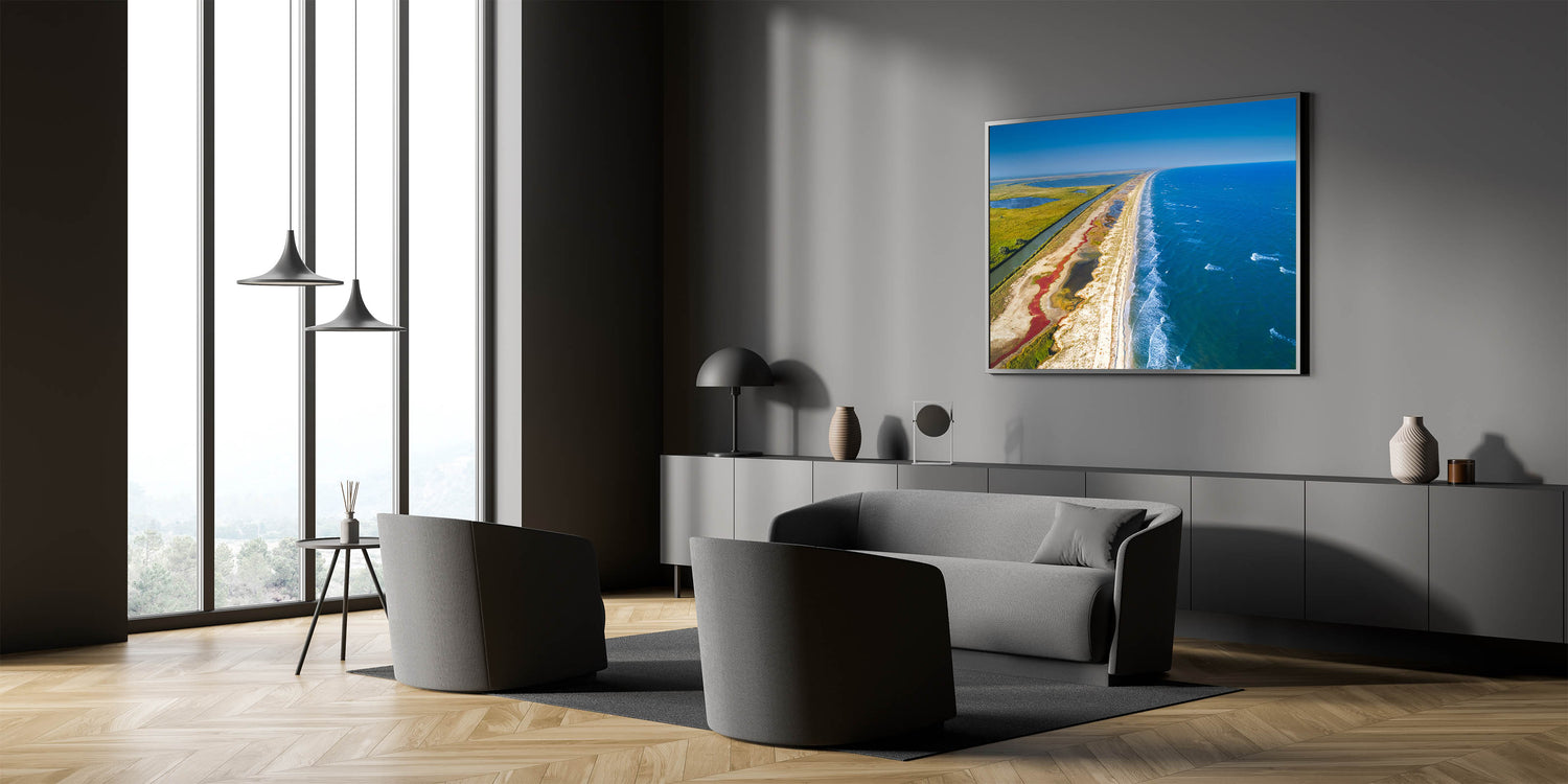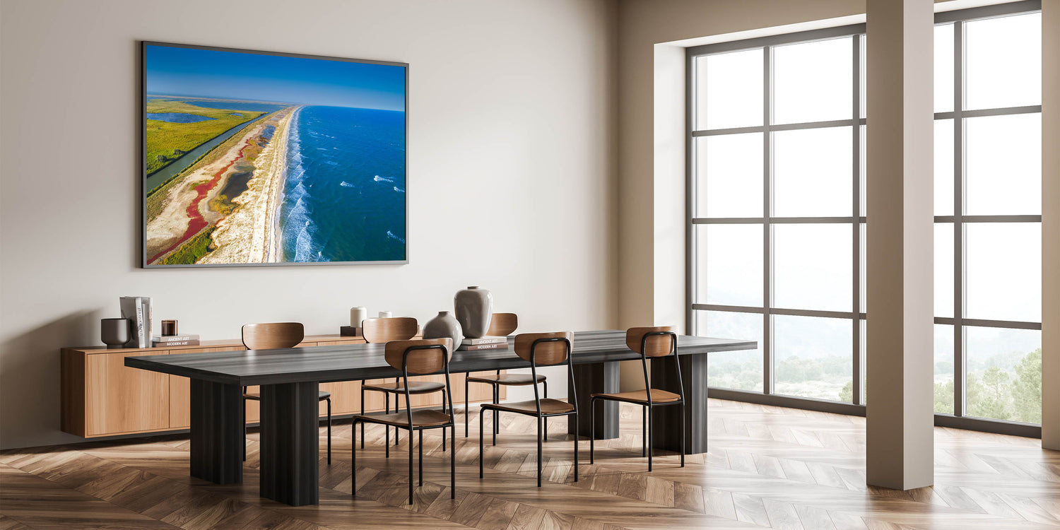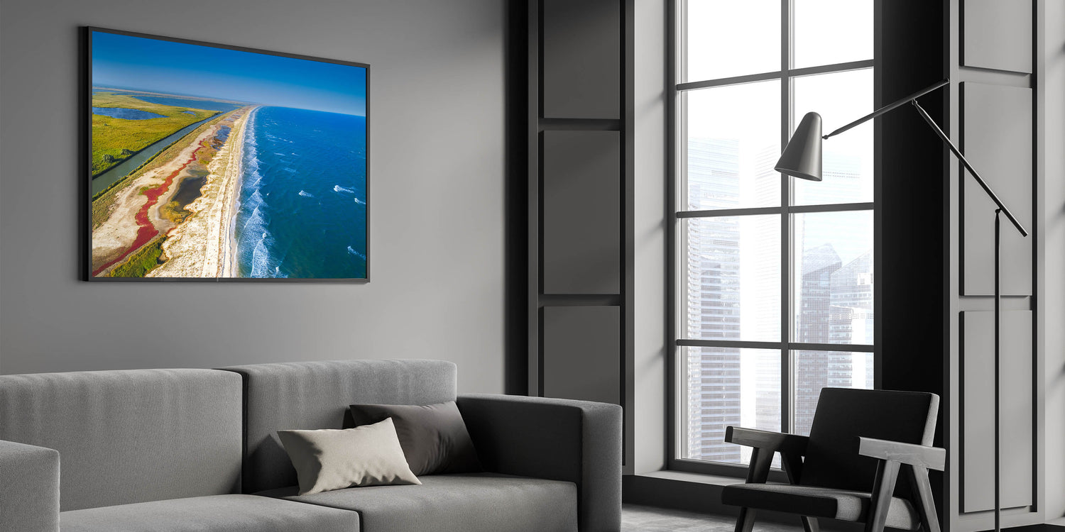 Immerse yourself in the natural beauty of Romania’s Danube Delta with this breathtaking aerial view of the coastline and marshlands. The striking contrast between the vibrant blue sea and the lush green wetlands creates a serene and harmonious composition, perfect for adding a calming and scenic touch to any room. This unique photograph captures the untouched beauty of one of Europe’s most biodiverse regions, where land meets water in an awe-inspiring display of nature.