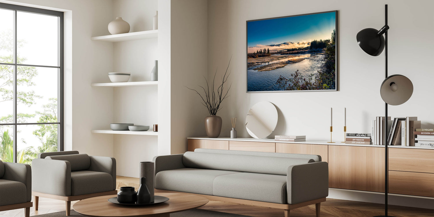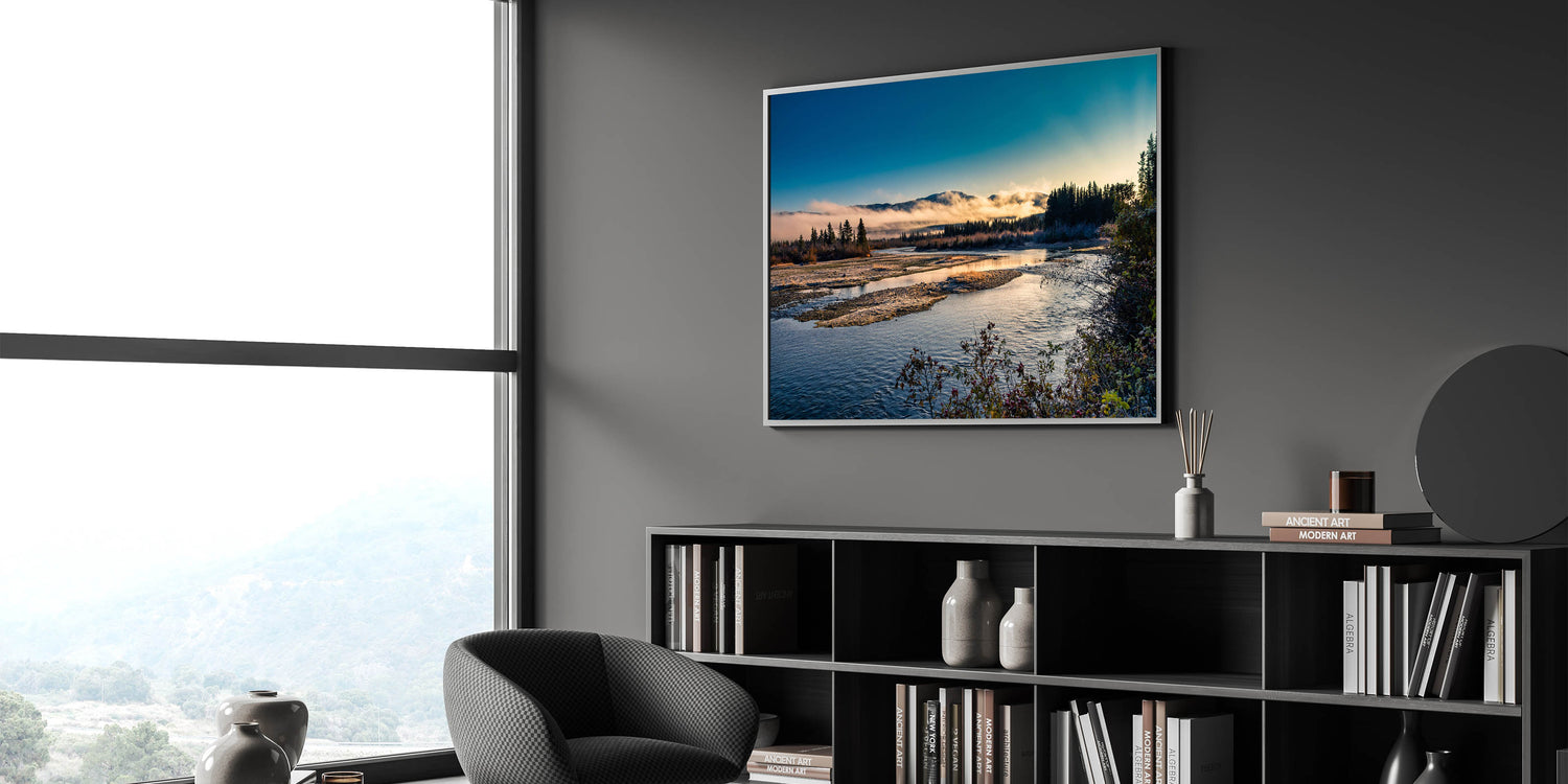Awaken to the peaceful ambiance of the Yukon with our 'Dawn at Yukon River - Misty Morning Canvas'. This artwork captures the first light of dawn as it illuminates a gentle river, shrouded in morning mist, with distant mountains as a majestic backdrop.