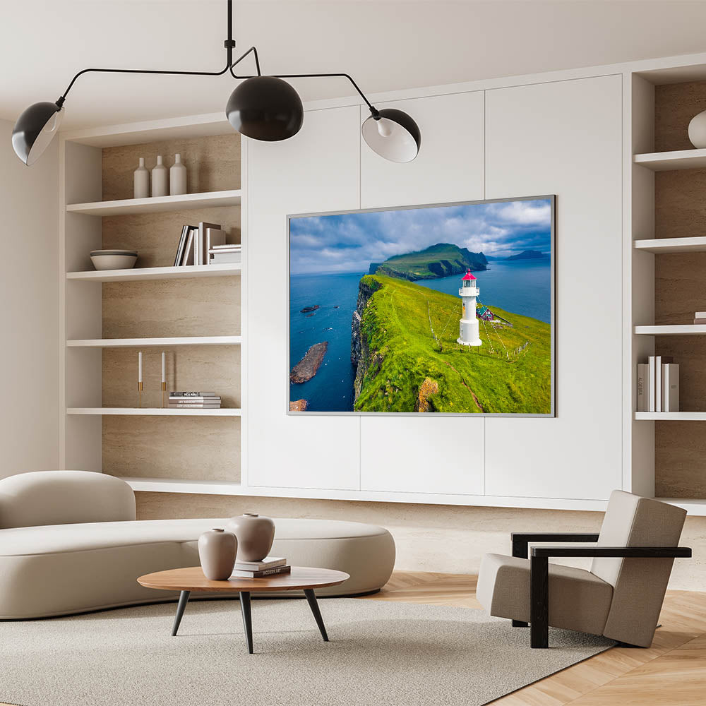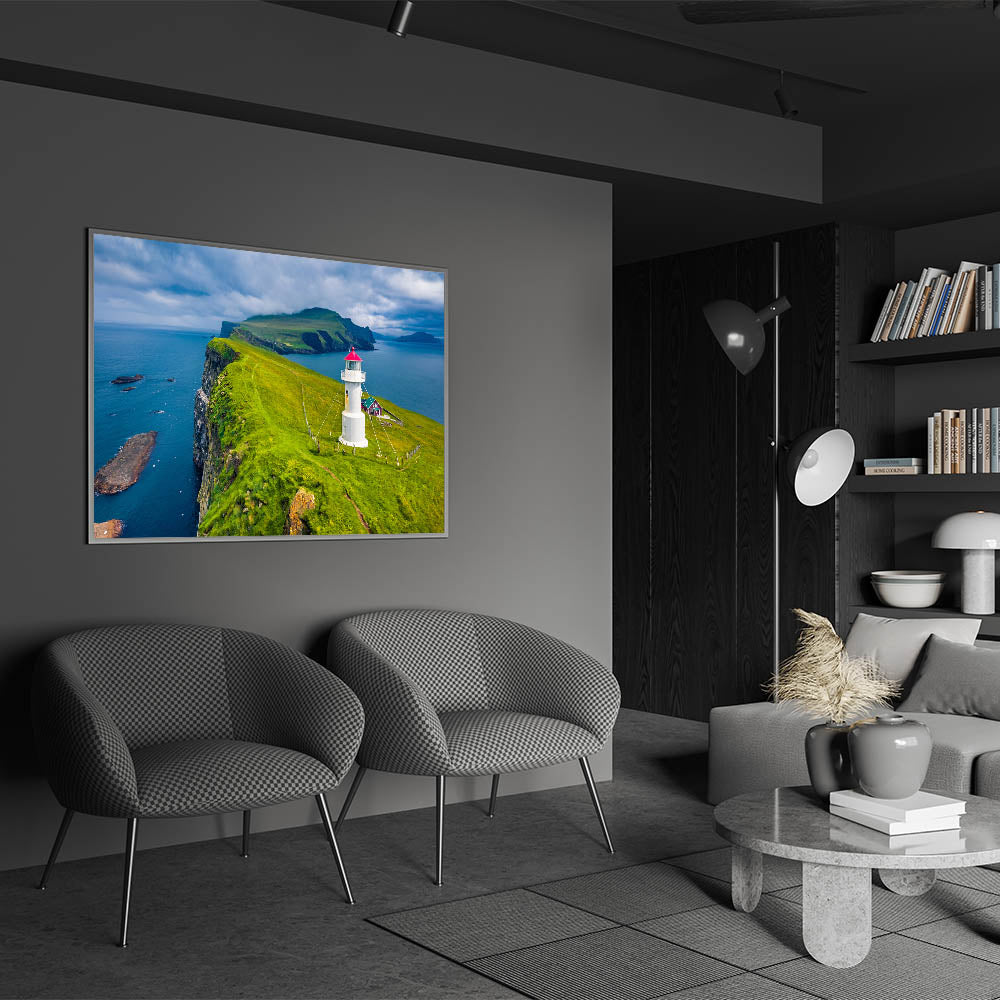 This breathtaking Denmark wall art captures the dramatic coastal scenery of Denmark, featuring a bright white lighthouse set against the vibrant green cliffs and deep blue waters. The sweeping landscape and striking colors make this a standout piece for any Nordic wall decor. Ideal for lovers of Danish landscape paintings and Scandinavian decor, this artwork brings the natural beauty of Denmark’s rugged coastline into your home.