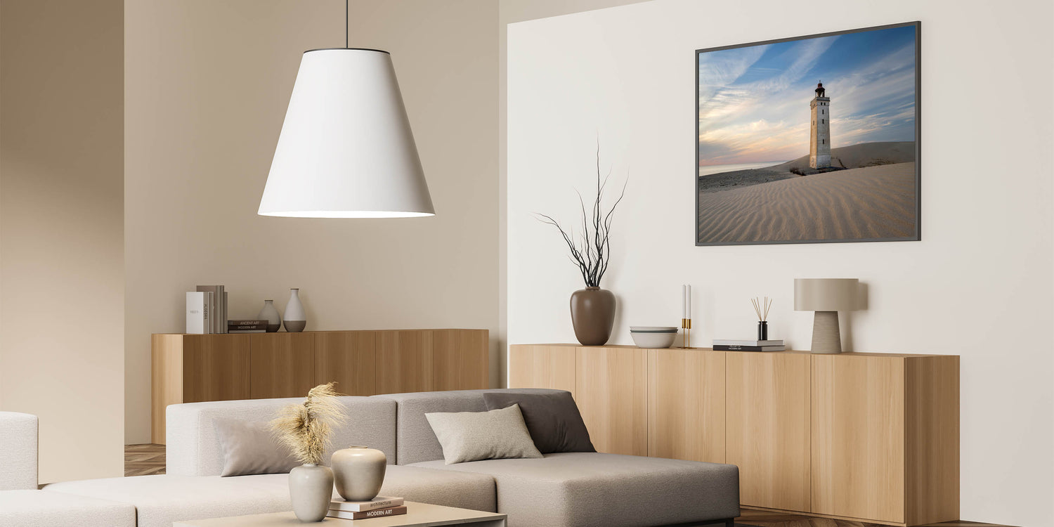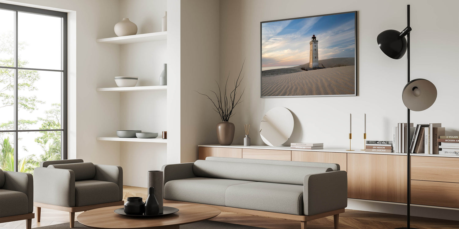 This striking Denmark wall art captures the peaceful solitude of a lighthouse standing tall on a windswept dune, bathed in the soft hues of a dusky sky. The smooth ripples of the sand and the tranquil horizon create a calming composition, perfect for enhancing any space with Scandinavian decor. This Denmark photography piece is a tribute to the quiet beauty of the Danish coastline, making it an ideal addition for those who love Nordic wall decor or coastal-inspired interiors.