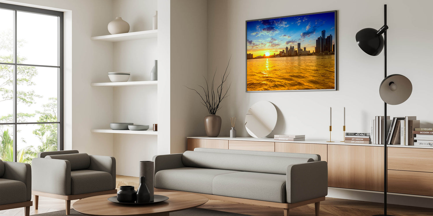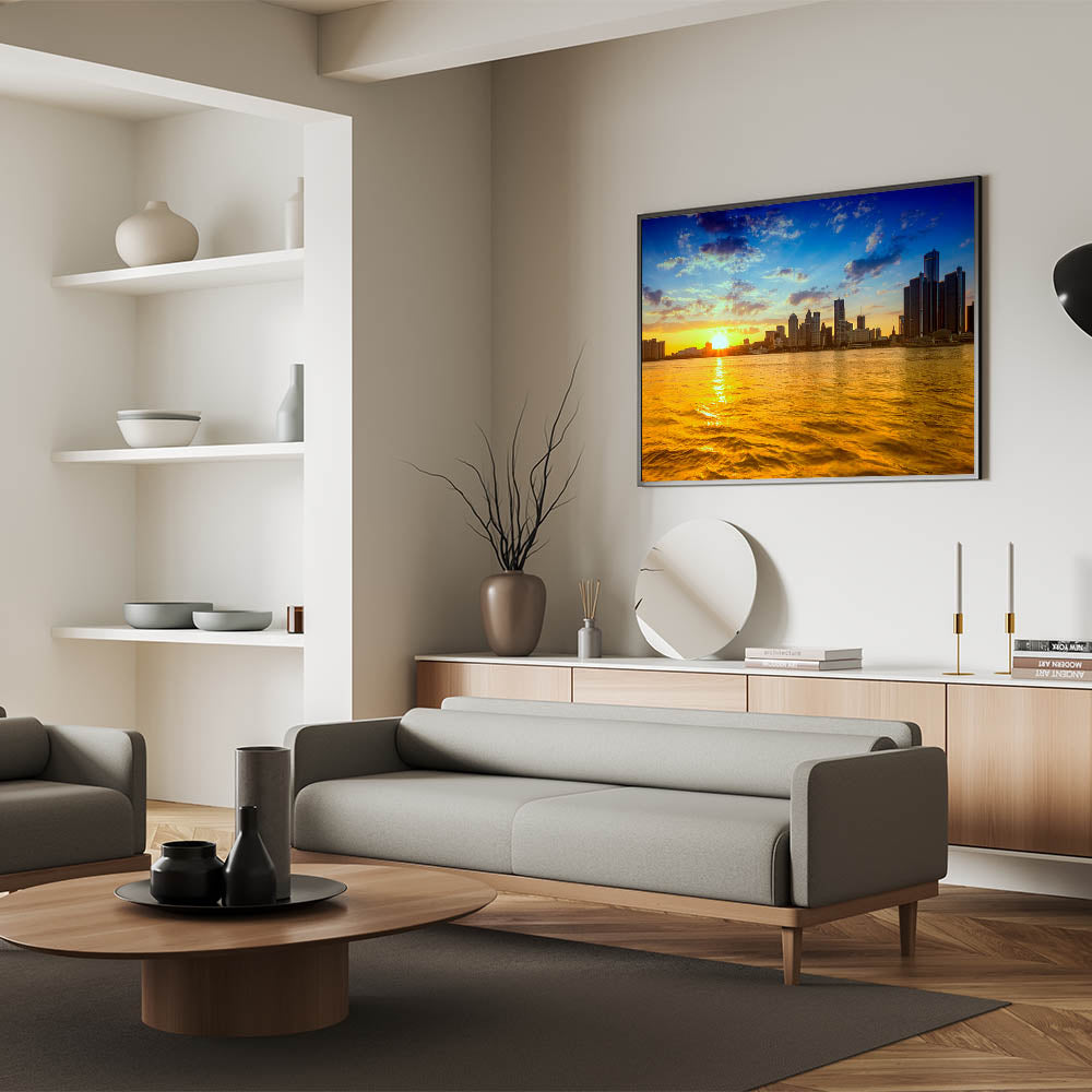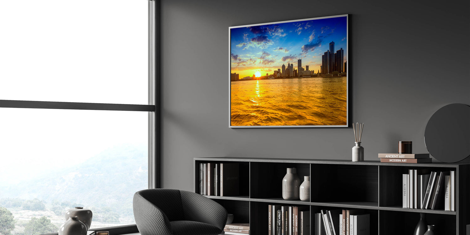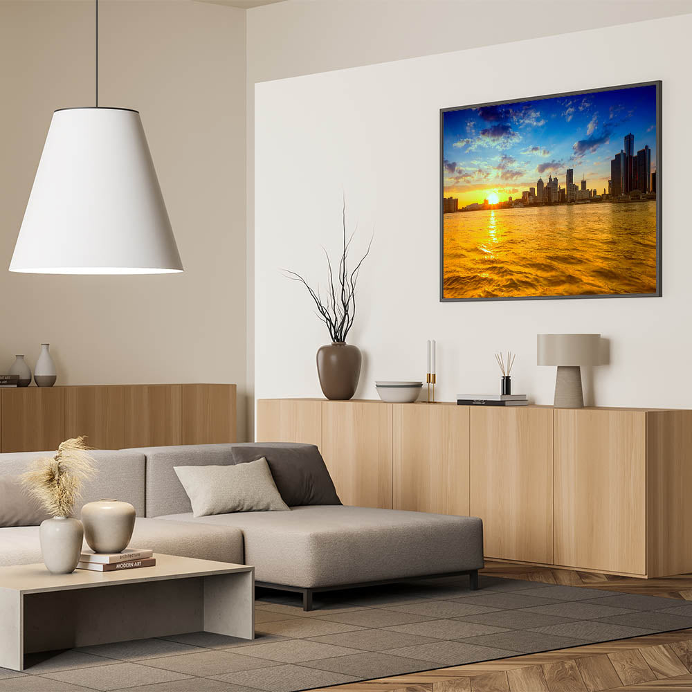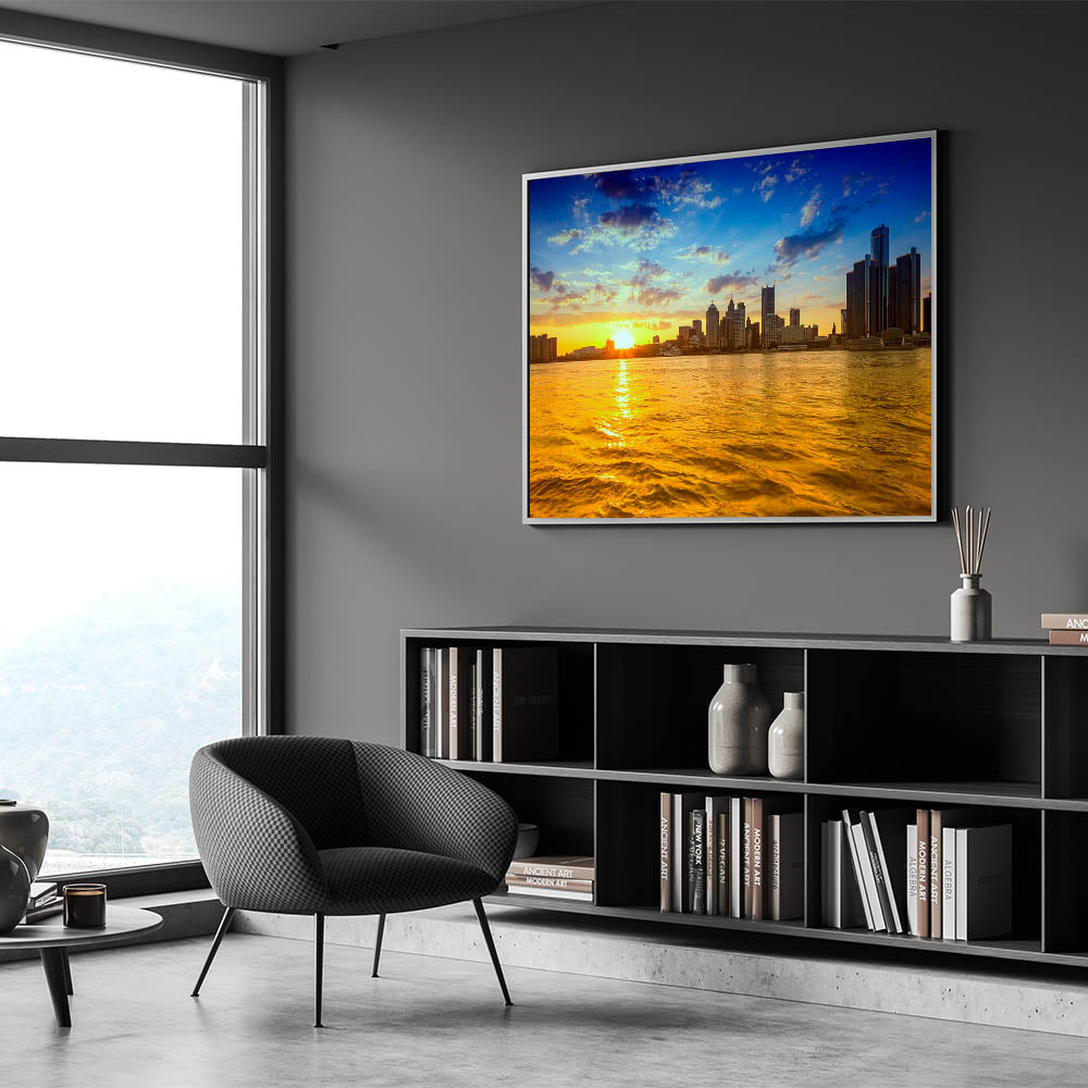 Capture the breathtaking beauty of Detroit with this stunning sunset cityscape. This Detroit wall art showcases the iconic skyline bathed in golden sunlight, with vibrant colors reflecting off the river. Perfect for any home or office, this piece blends modern elegance with a timeless urban charm, making it an excellent addition to your decor.